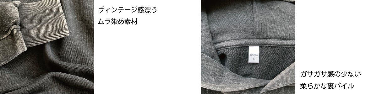 素材ポイント:綿100%の裏毛素材, ヴィンテージ感漂う表情, 肌触りの良い裏パイル