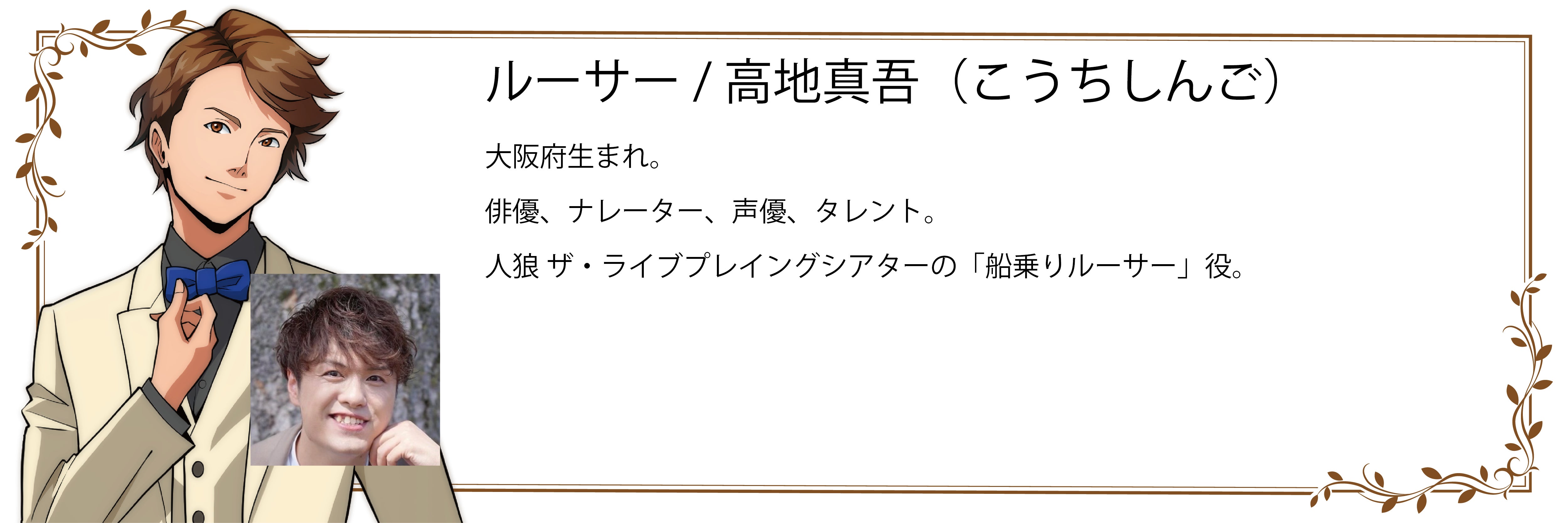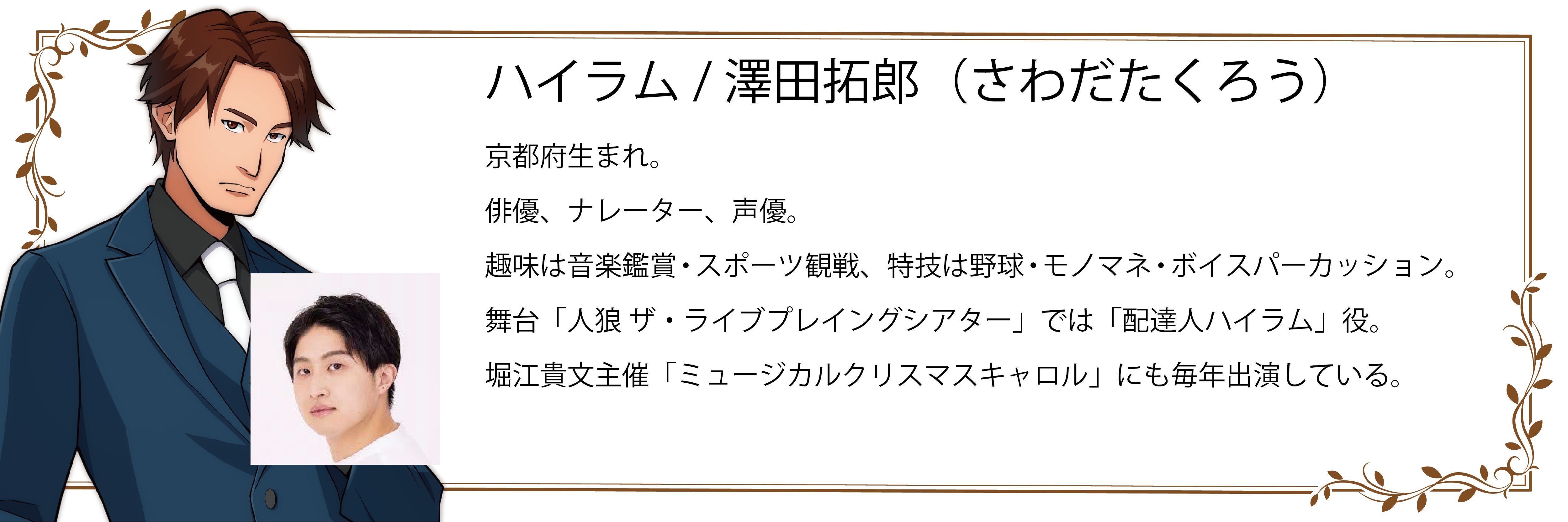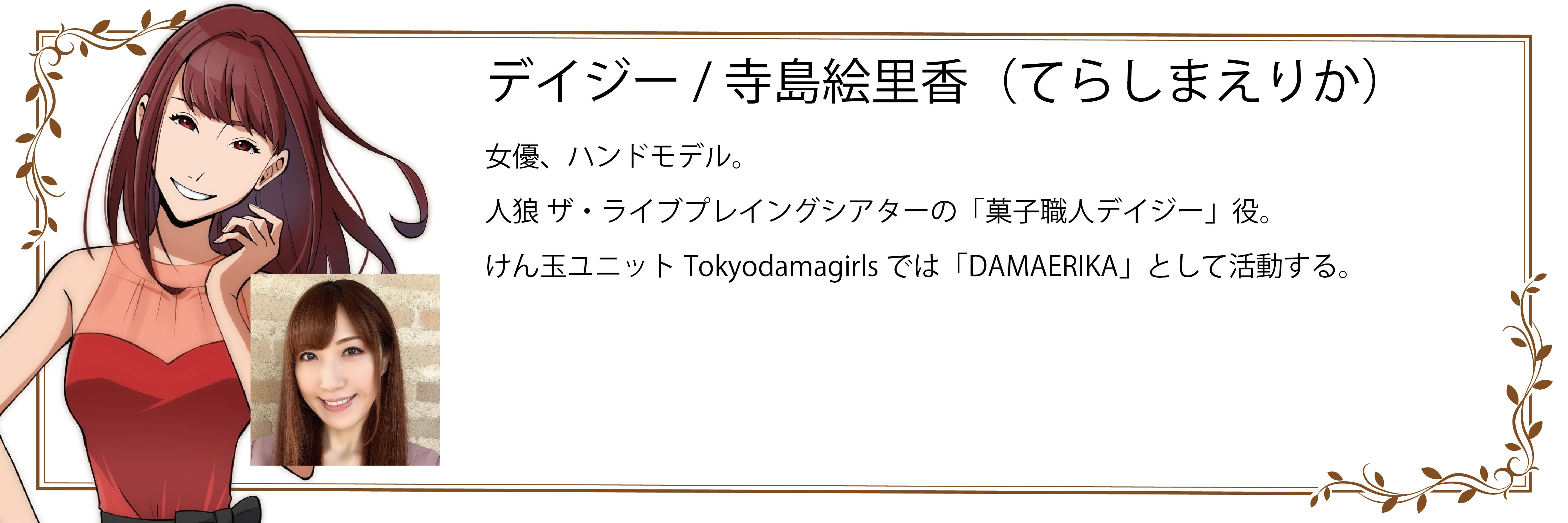 更に、人狼を劇的舞台として公演する「人狼 TLPT」からは、高地真吾氏(ルーサー)、澤田拓郎氏(ハイラム)、はぎのりな氏(キンバリー)、寺島絵里香氏(デイジー)の 4人が堀江氏のオンラインサロンに参加しているメンバー役で登場します。