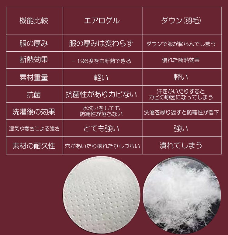 - ■NASA(アメリカ航空宇宙局)が開発した液体窒素をも断熱する新素材エアロゲル採用で 軽くて薄くても圧倒的な超防寒!!
