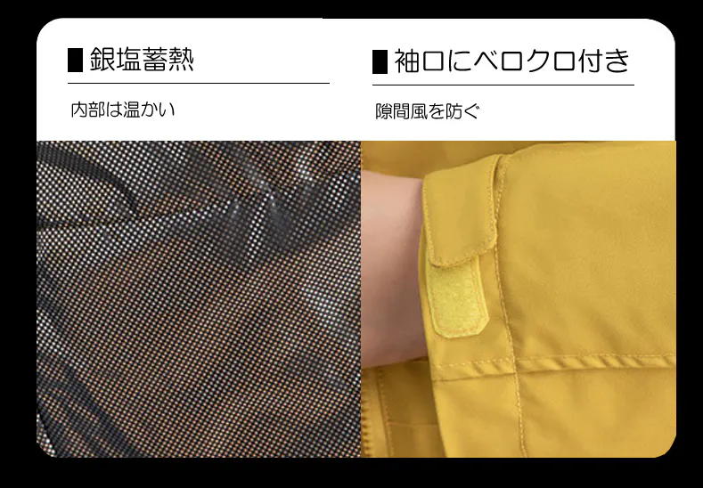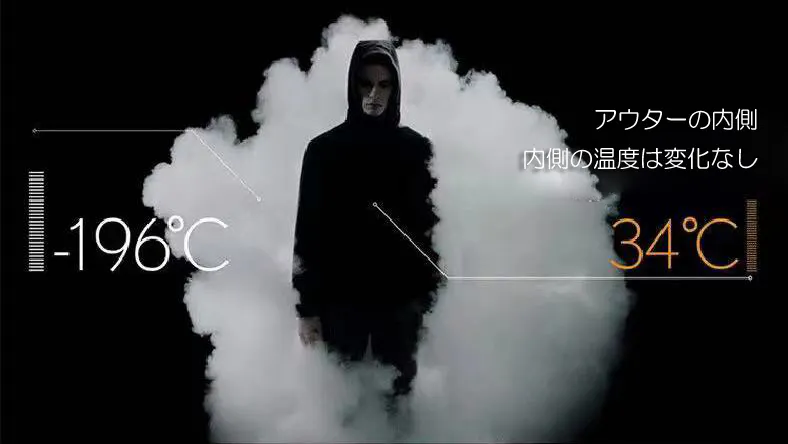 エアロゲル防寒着で外の寒さと中の体温との温度差を断熱・遮断をすることが出来ます。これにより人の体温を一定に保つことができるため、外気温に影響されない幅広い気温度に対応をすることができます。