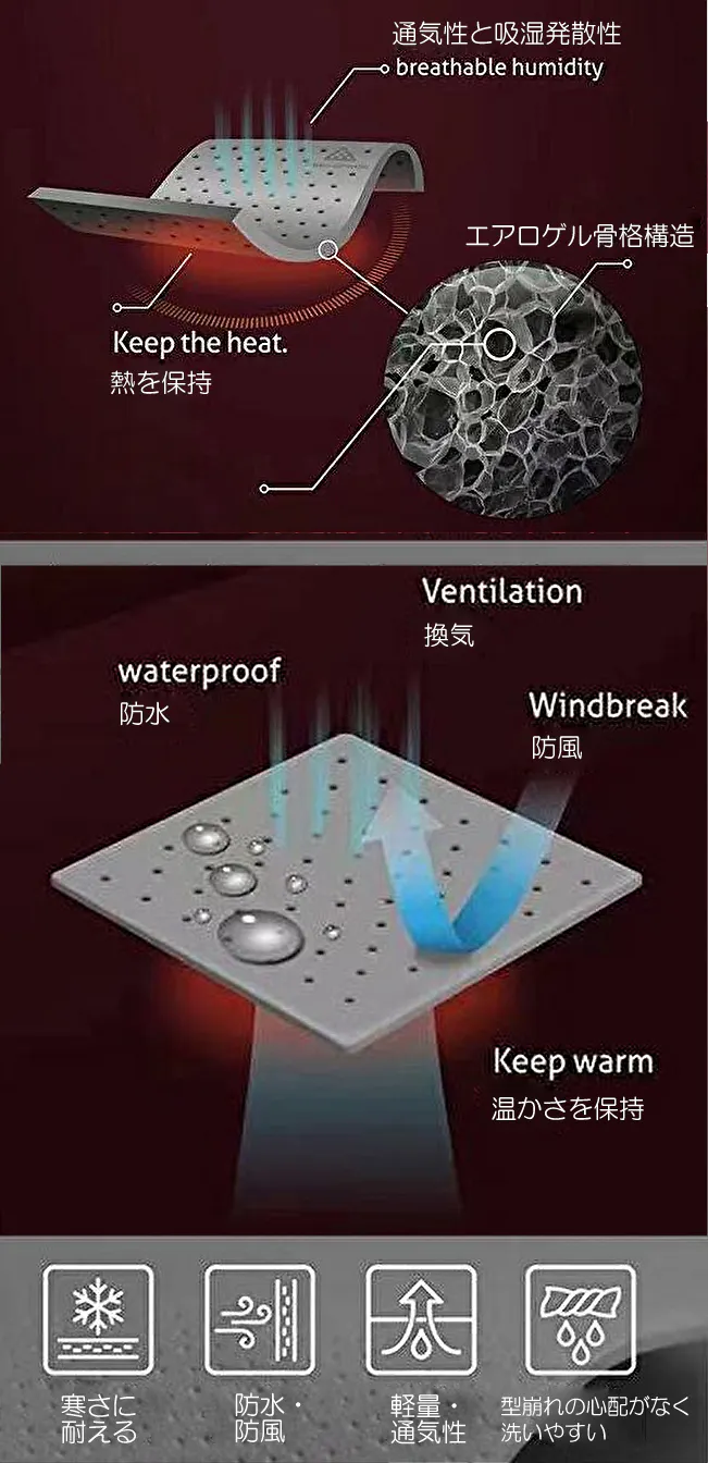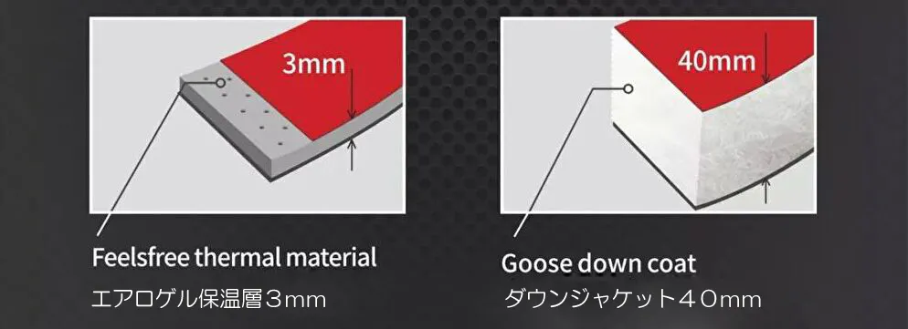 - ■NASA(アメリカ航空宇宙局)が開発した液体窒素をも断熱する新素材エアロゲル採用で 軽くて薄くても圧倒的な超防寒!!