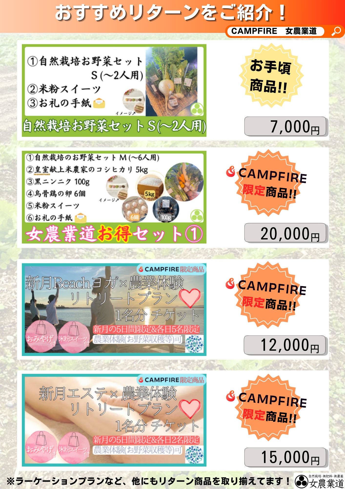 この度は、ご支援・お気に入りの登録をいただきまして、ありがとうございます!募集期間が残り15日となりました!16個のリターン商品を準備させていただきましたが、ここで改めておすすめのリターン商品を紹介させていただきます!!もし、よろしければご支援いただけますと嬉しいです!!!どうぞ、よろしくお願い致します!【食べて応援】 自然栽培お野菜セット S(~2人用)https://camp-fire.jp/projects/724702/backers/new?id=1118239【食べて応援】女農業道 お得セット ①(女農業道おすすめの詰め合わせ)https://camp-fire.jp/projects/724702/backers/new?id=1118207Beachヨガ × オーガニックランチ 1名分 & お野菜 or 加工品お土産 & 米粉スイーツ付(農業体験も可)新月:6/6(木)、7/6(土)、8/4(日)、9/3(火)、10/3(木)の5日間限定https://camp-fire.jp/projects/724702/backers/new?id=1154119エステ+よもぎ蒸し × オーガニックランチ 1名分 & お野菜 or 加工品お土産 & 米粉スイーツ付(農業体験も可)新月:6/6(木)、8/4(日)、9/3(火)、10/3(木)、11/1(金)の5日間限定https://camp-fire.jp/projects/724702/backers/new?id=1155670株式会社 女農業道