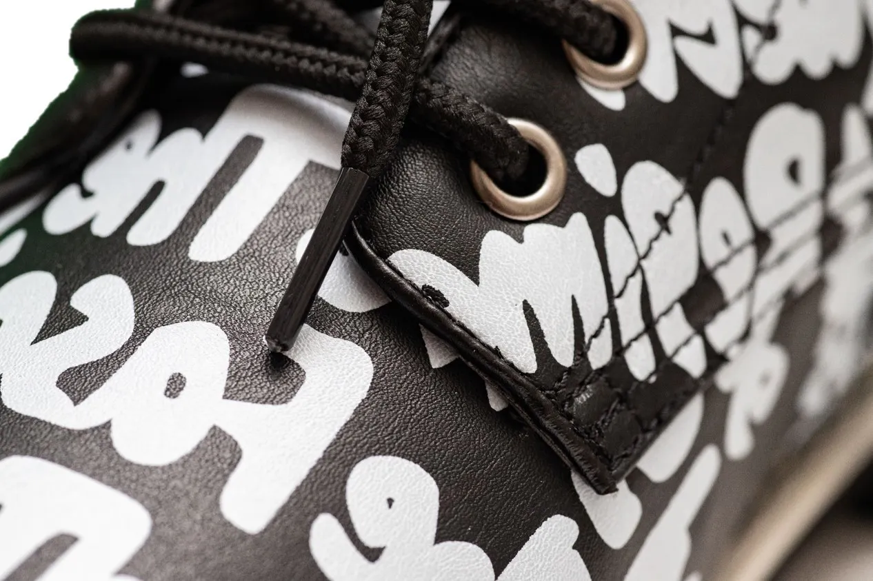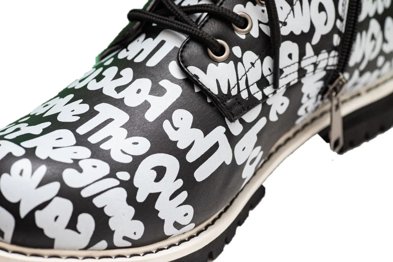 シックな黒地のフェイクレザー上に、白文字で書かれたオリジナルグラフィックが映えるここでしか手に入らないお洒落ブーツです。