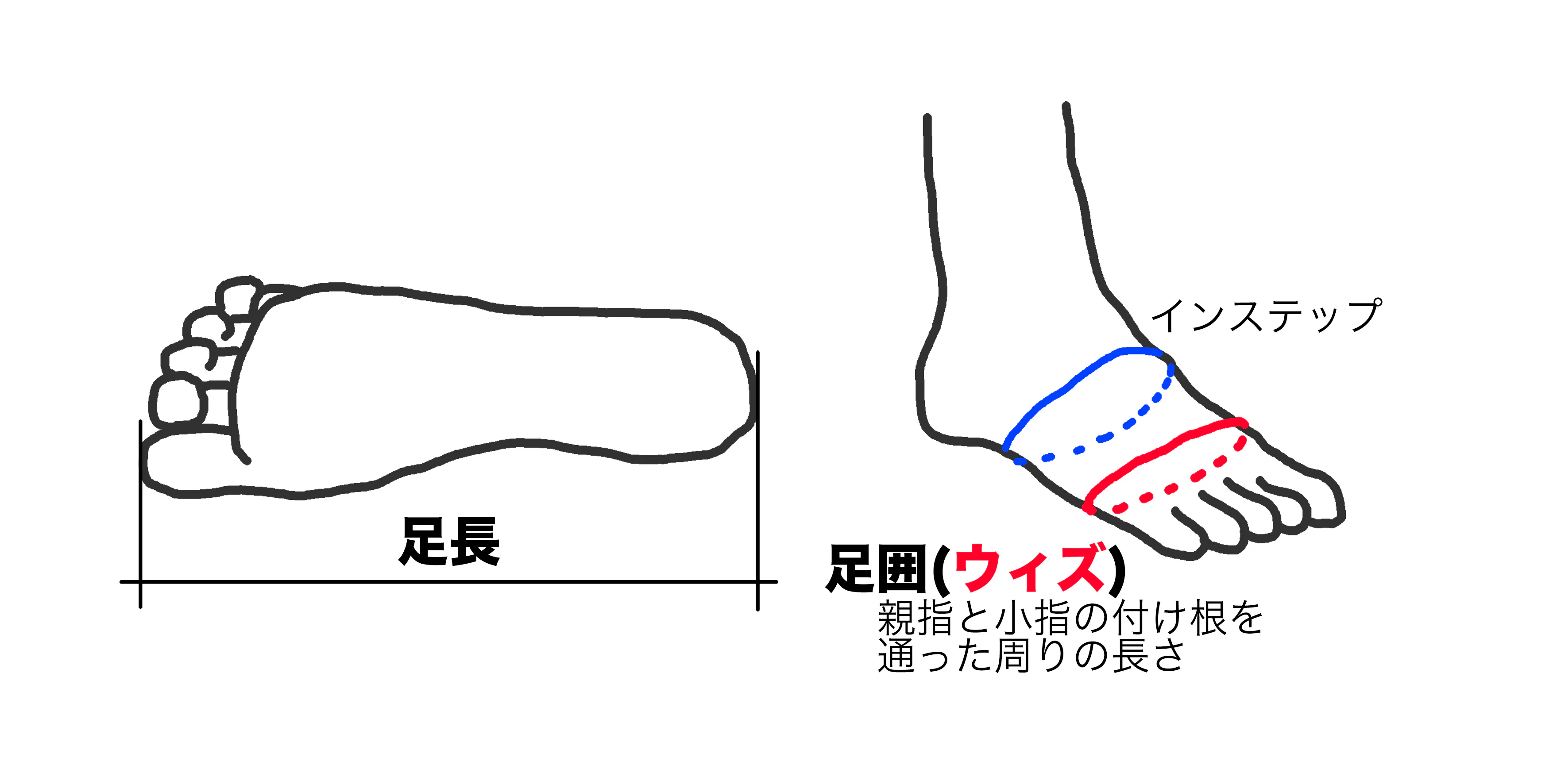 注3)"普段履いている靴のサイズ"はアテにならないかもしれませんので、一度計測されることをオススメします。