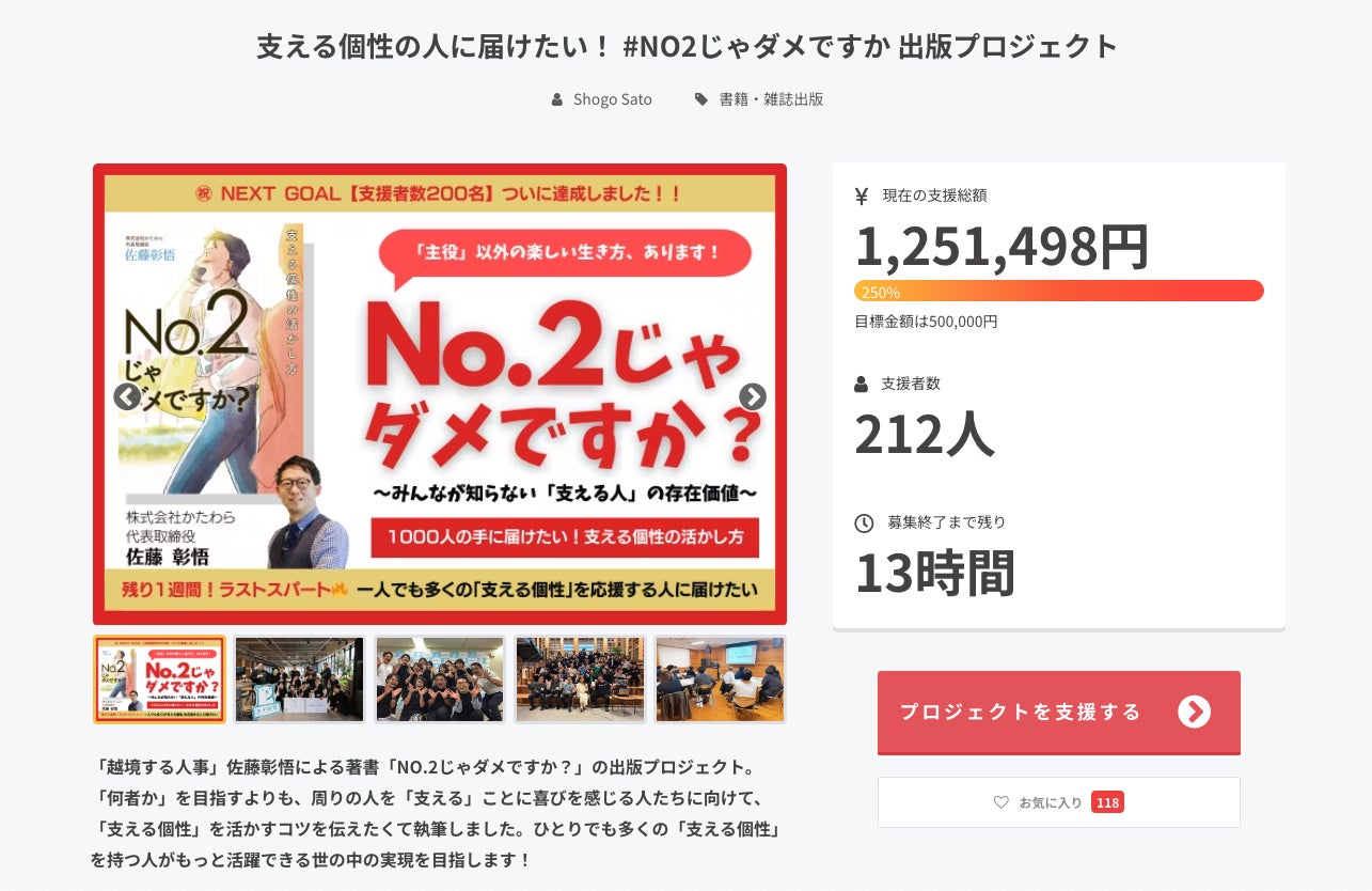 2023年12月14日より開始した自身初の著書「No.2じゃダメですか?」出版プロジェクトは約1ヶ月間のクラウドファンディング期間にて大変多くの皆様よりご支援いただき、無事目標達成することができました!