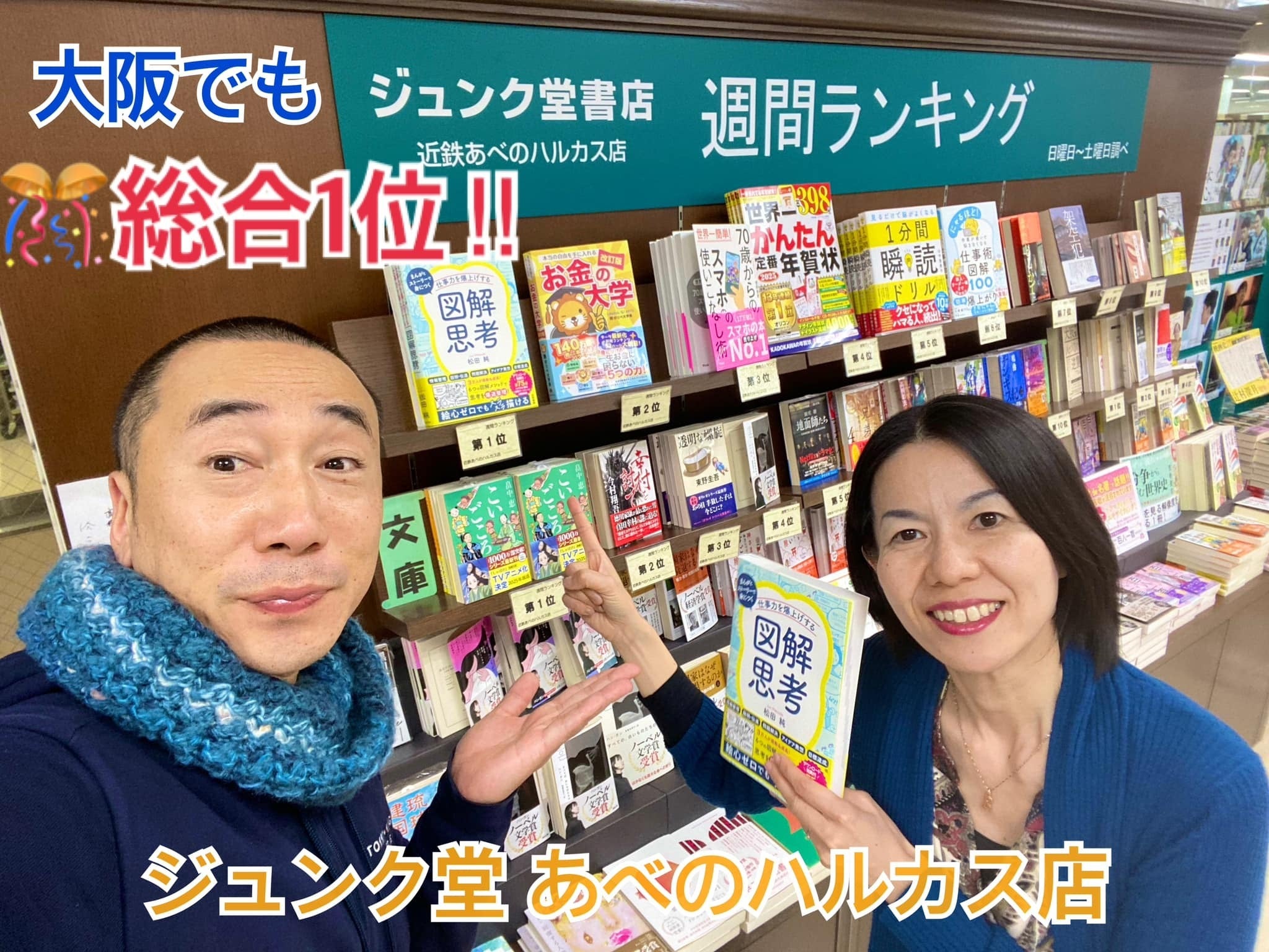 2024/12/09 18:48大阪でも!総合1位に!?なんとー!大阪ジュンク堂のあべのハルカス店で先日重版になったばかりの『図解思考』が総合ランキング1位に!クラファンでご支援いただきましたみなさんのおかげでございます。いつもありがとうございます!!!せっかくなので、弾丸日帰りで大阪までご挨拶に行ってきました!笑ちょうど妻の誕生日でもあり、あべのハルカスでお祝い!客員教授を担当させて頂いている桃山学院大学にも久しぶりに訪ねることができて馴染みの大学職員さんと和やかな時間も…!『図解思考』シリーズ第2弾の企画も着々と動いております…!一つ一つのご縁を大切に、これからも精進致しますので応援どうぞよろしくお願いいたします! 松田 純・・・・・・・・また、イラスト思考公式Instagramも活動再開しております!インスタLIVEも毎週配信予定!まだの方は、ぜひフォローして限定コンテンツをお楽しみください!▼公式Instagramはこちらからhttps://x.gd/zHPaJ==============ここでしか見られない特別なコンテンツが満載!==============Instagramでは・時間不足を解消!イラスト整理術・モヤモヤスッキリ!4マス思考法など図解のコツやお悩み解決法を短時間で楽しく学べる限定コンテンツがぎっしり!忙しい毎日の中でも、フレッシュな刺激とワクワクするアイデアを楽しむひと時をご一緒できれば嬉しいです!▼公式Instagramはこちらから!https://x.gd/zHPaJ====================たった1分で人生が変わる!図解で楽しいリール動画♪♪====================1分見ながら描くだけであなたの心のモヤモヤとお悩みがスッキリ!ビジネスで成功を掴み、仕事や家庭の困難にも動じないしなやかマインドの作り方もかわいい図解で楽しくご紹介!ぜひフォローして、毎日をもっと豊かに、そして前向きに楽しむ時間をご一緒しましょう!▼▼▼こんなテーマが大人気!▼▼▼・紙とペンだけ!動じない心の作り方・失敗しないチャレンジの秘訣・成功したければ計画は立てるな!・仕事ができる人が必ずやっている秘密毎回「なるほど!使える!」が詰まった投稿が盛りだくさんです。▼公式Instagramはこちらから!https://x.gd/zHPaJ====================あなたの悩みを図解で解決!インスタLIVEも配信!====================さらに!毎週インスタLIVEも配信予定です。あなたの身近なお悩みを楽しくイラストを描きながら一緒に解決!みなさんからのリアルタイムコメントでLIVEならではの時間をご一緒しましょう!フォロー頂ければインスタLIVEのリマインドも届きます。普段はあまり発信しない私のちょっとプライベートな日々もお届け予定(笑)お見逃しのないよう、この機会にぜひフォローいただければ嬉しいです!LIVEで扱って欲しいテーマや、解決してほしいお悩みなどがあれば、ぜひ気軽にコメントやDMで教えてください!フォロー・コメント楽しみに待っております!▼公式Instagramはこちらから!https://x.gd/zHPaJ(お問い合わせ・ご質問・メッセージは下記へお願いします)*************【クラウドファンディング「イラスト思考」事務局】古江 翼illust.cf.team@gmail.com************* もっと見る
