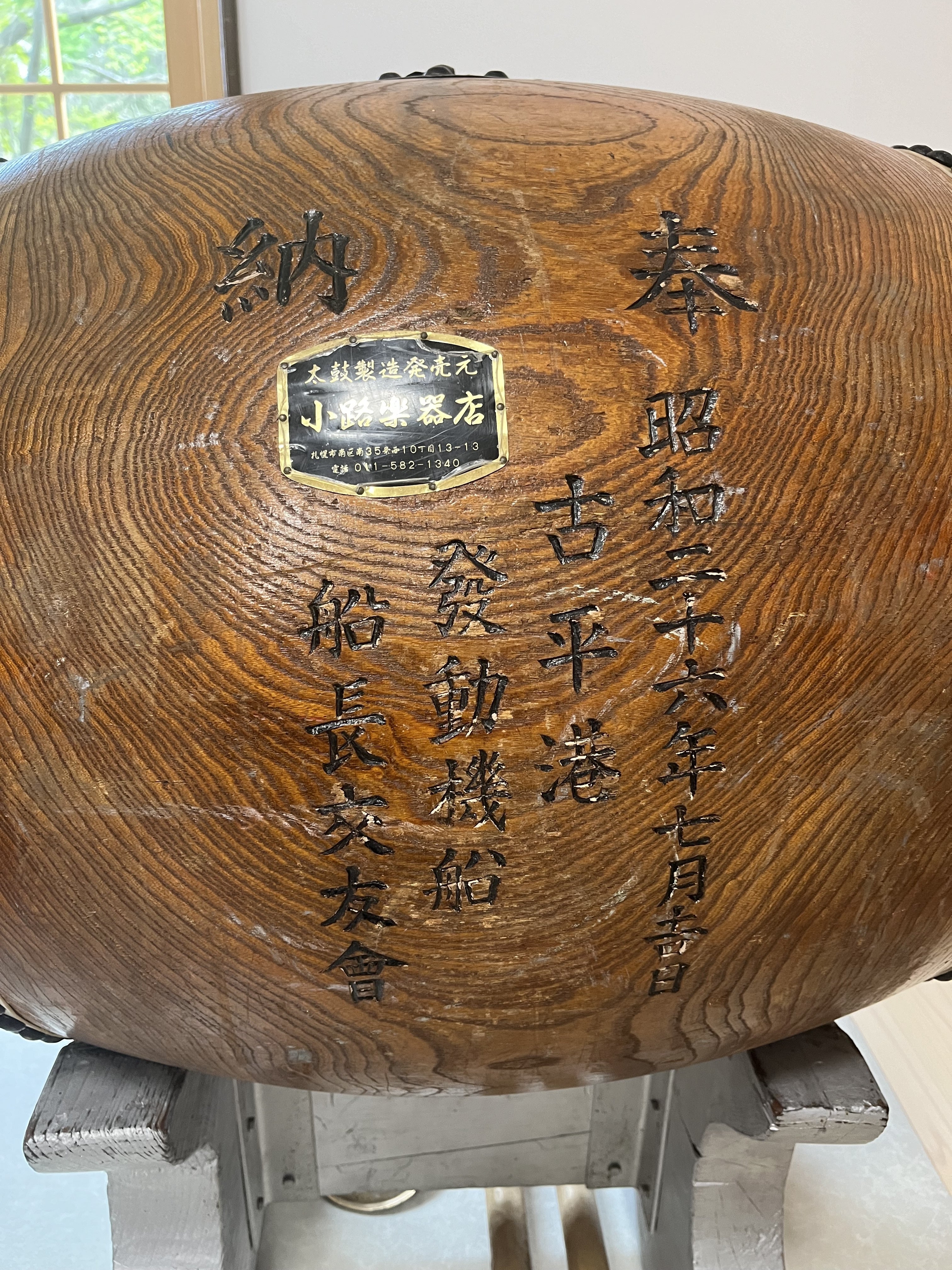 琴平神社の祈年祭に参加させていただきました。楽人が叩く太鼓には「昭和二十六年七月吉日 古平港 発動機船 船長公友会」と刻まれていました。古平は江戸時代から鰊漁が盛んでしたが、昭和中頃から鰊が獲れなくなったため、漁師さんたちは遠洋漁業に活路を見出したのです。この太鼓は遠洋漁業が始まった頃に船長さんたちによって寄贈されたものと思われます。革は何度か張り替えられているそうですが、70年以上も大切に使われてきたんですね。