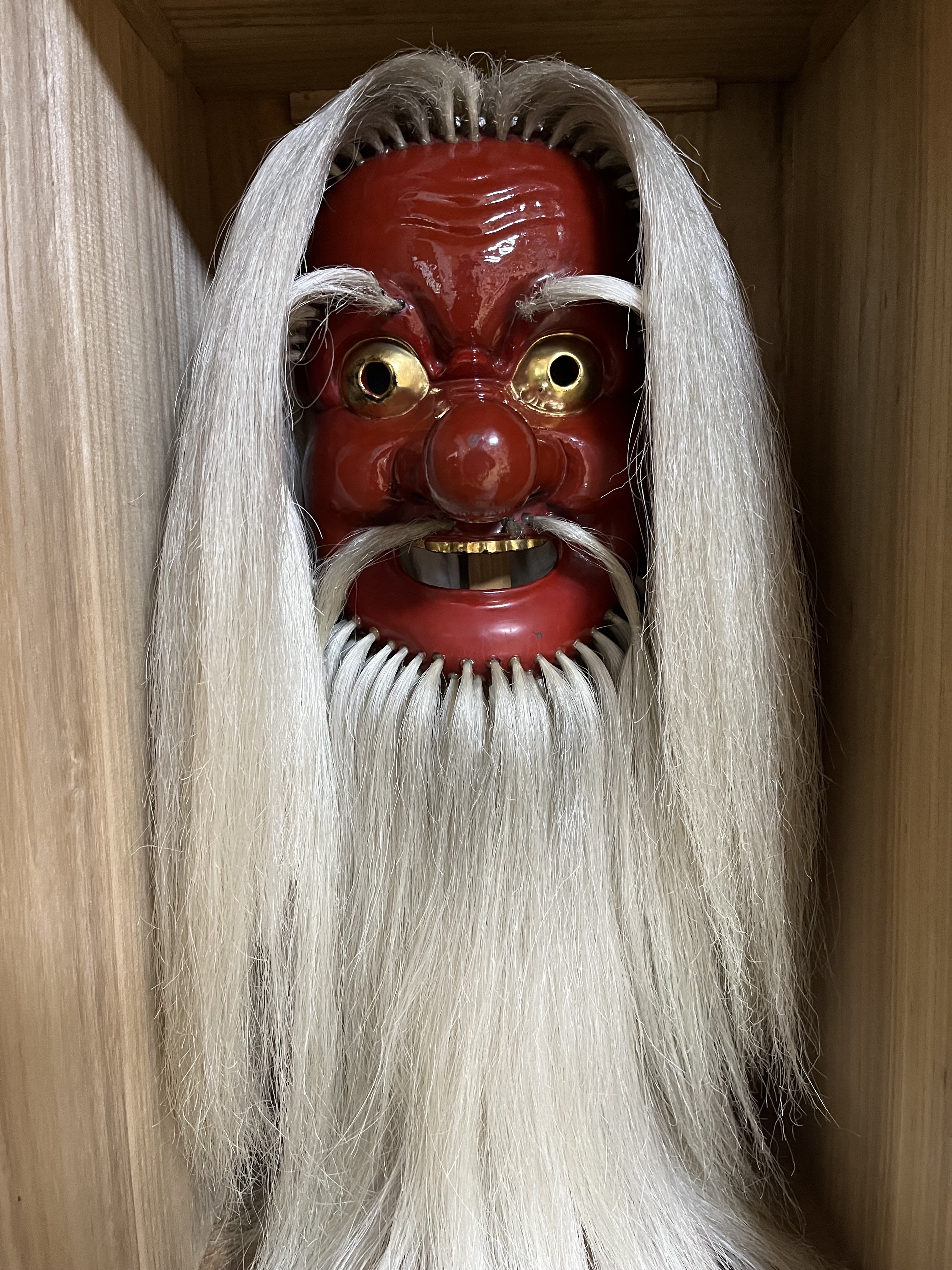 古平町琴平神社例大祭で観光客に人気があるのが、本祭の最後に行われる「天狗(猿田彦)の火渡り神事」です。大勢の見物客が今や遅しと渡御行列の到着を待ち構え、先導役の天狗が燃え盛る炎をくぐり抜けると会場の興奮は最高潮に達します。この天狗のお面は、普段は琴平神社の社務所に保管されているのですが、炎の中を何度もくぐり抜けるうちに、馬の尻尾の毛を埋め込んだ天狗の髪や髭が焼け焦げてしまうそうです。そのため、お祭りの前には、写真のような綺麗なお姿に修復するのです。