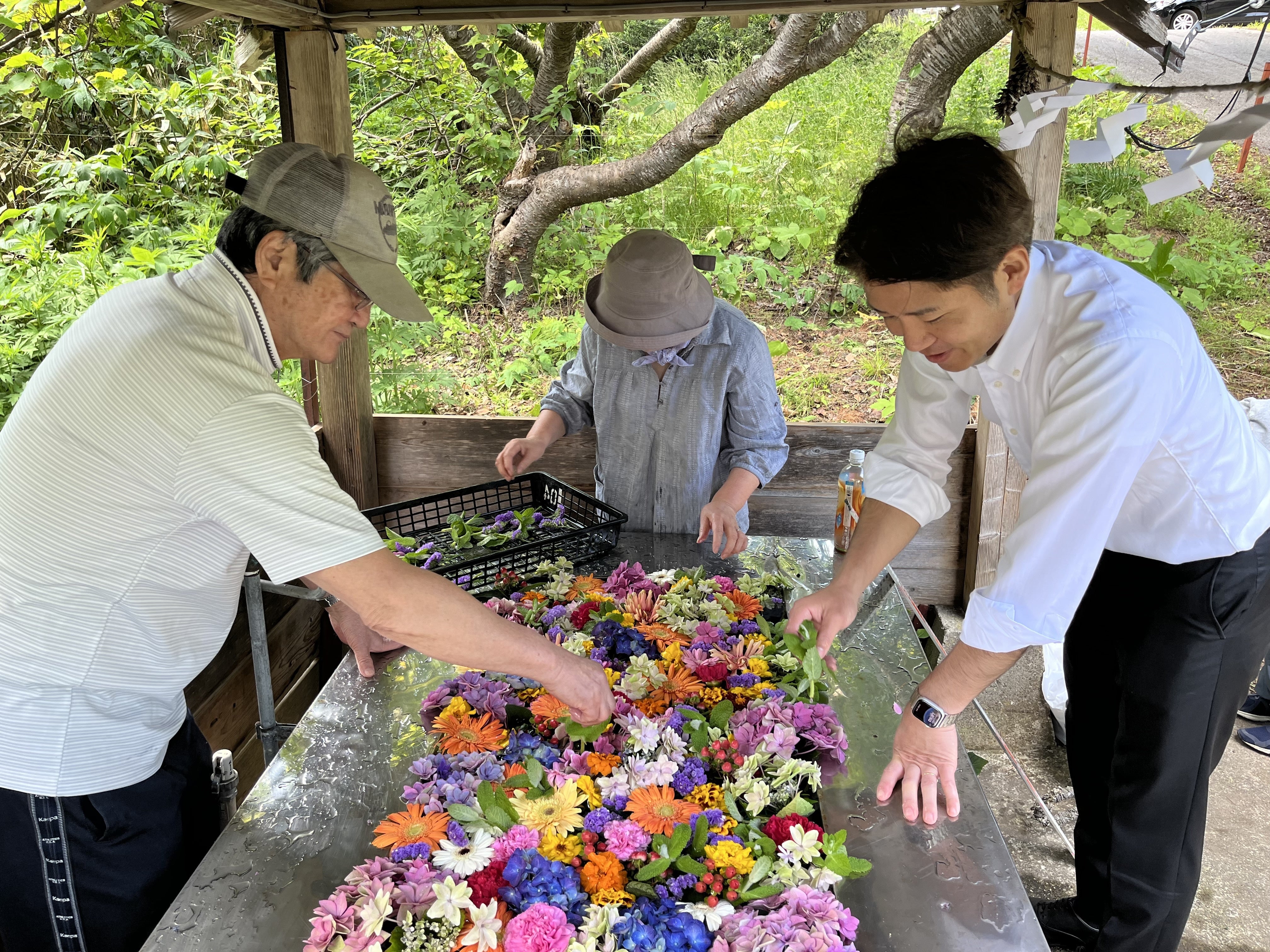 神社に参拝に訪れた方をおもてなしするために、琴平神社のご理解を得て花手水を始めました。花が沈まないように籠で土台を作ったり、カラス除けのテグスを張ったり、浮き球を並べて古平町らしさを表現したり、あーでもないこうでもないと言いながら花を飾っていく作業はとても楽しいものです。