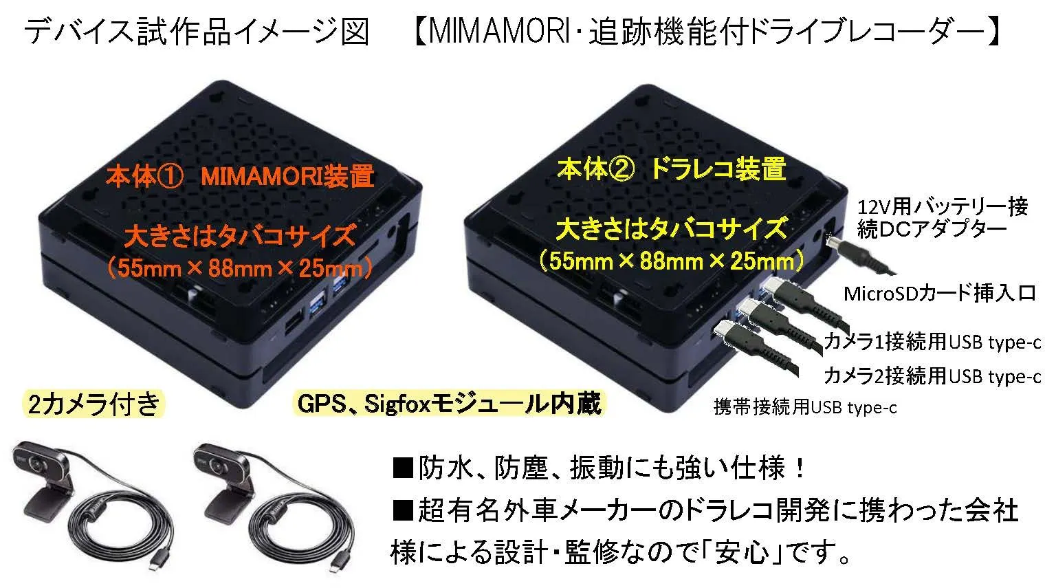 いただきました資金は、目標金額100万円に対しまして、キャンプファイヤー手数料17%を除き、MIMAMORI機能付きドライブレコーダーの量産化のための費用の一部として使用させていただきます。