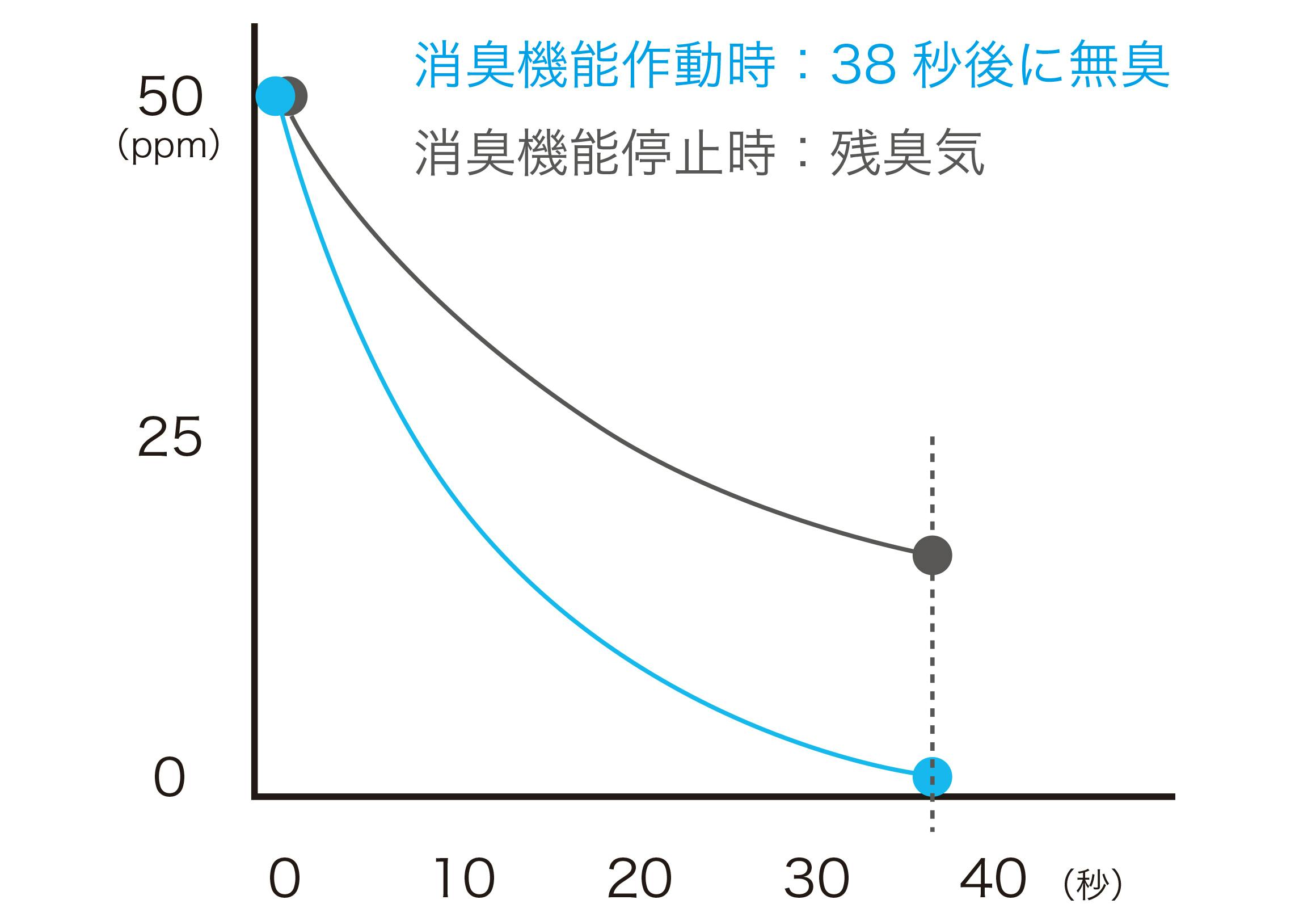 上の図でも分かる通り、消臭機能作動時(マイナスイオン有)では、約38秒でアンモニアのニオイは消臭されましたが、消臭機能停止時(マイナスイオン無し)では、アンモニアのニオイはまだ残っていました。
