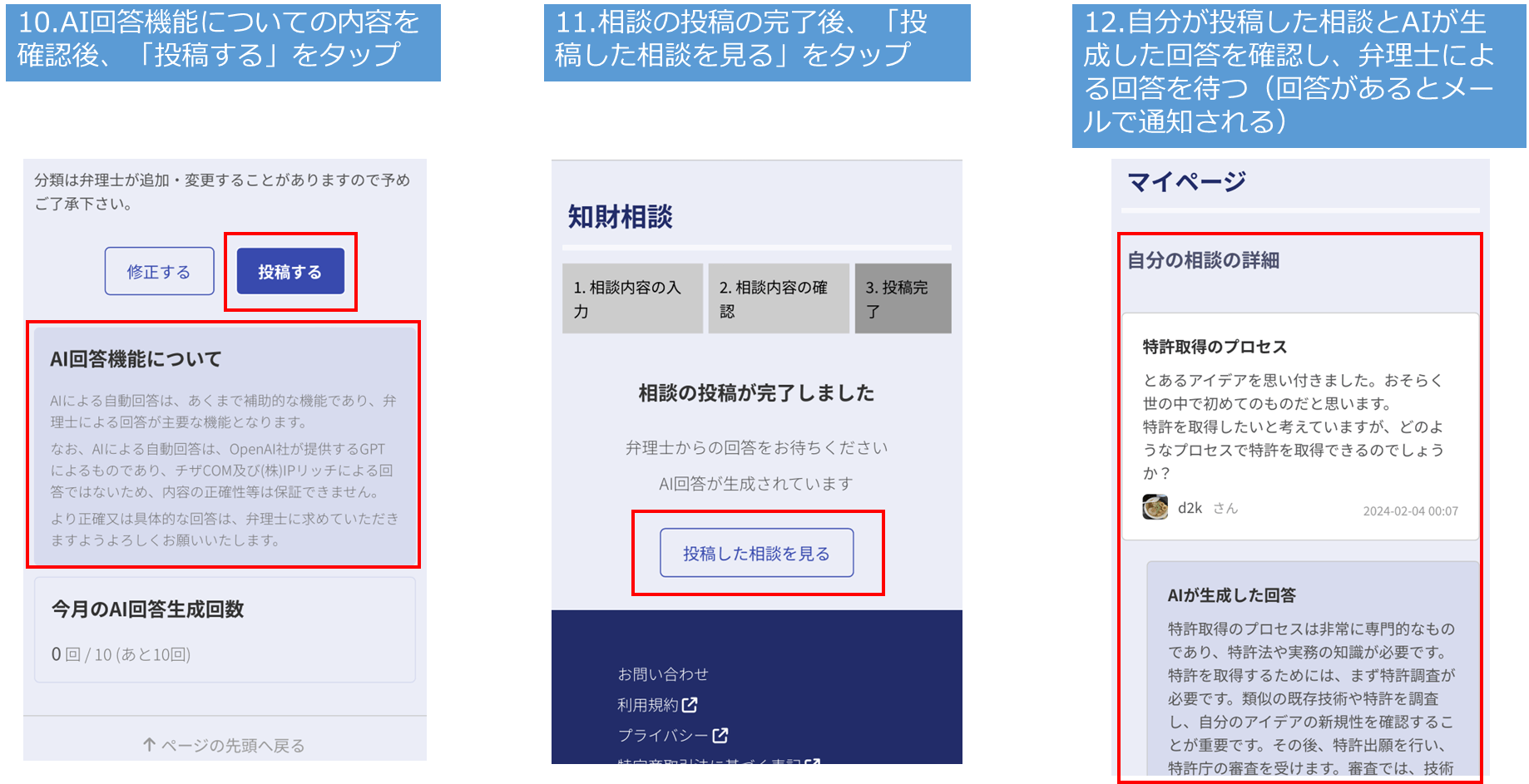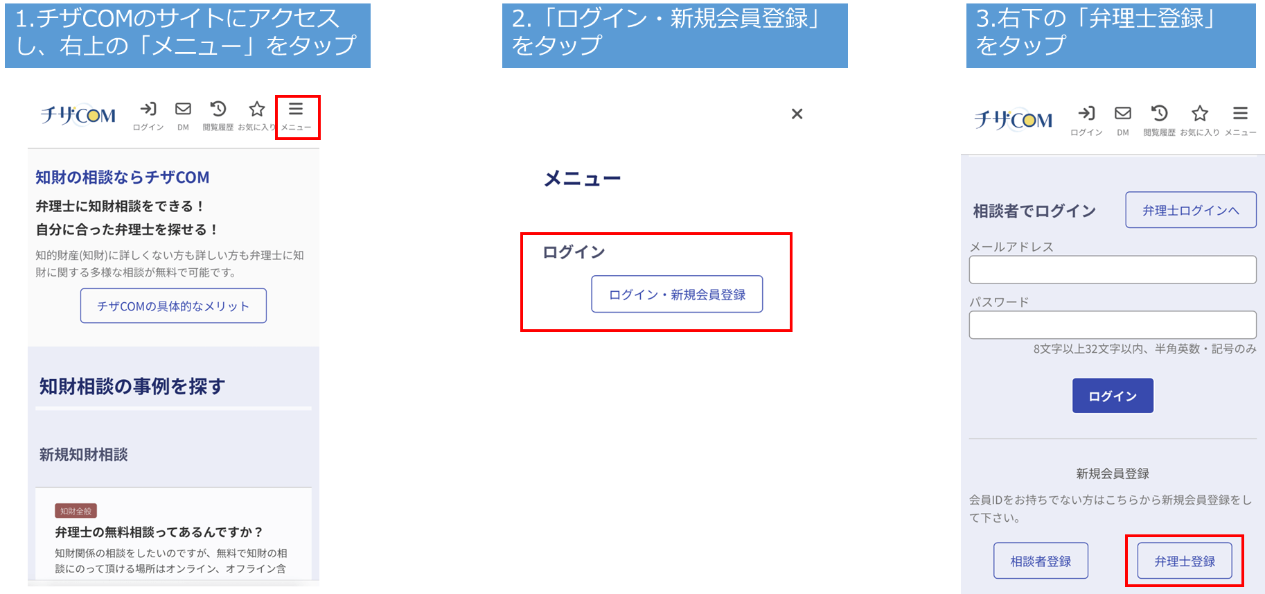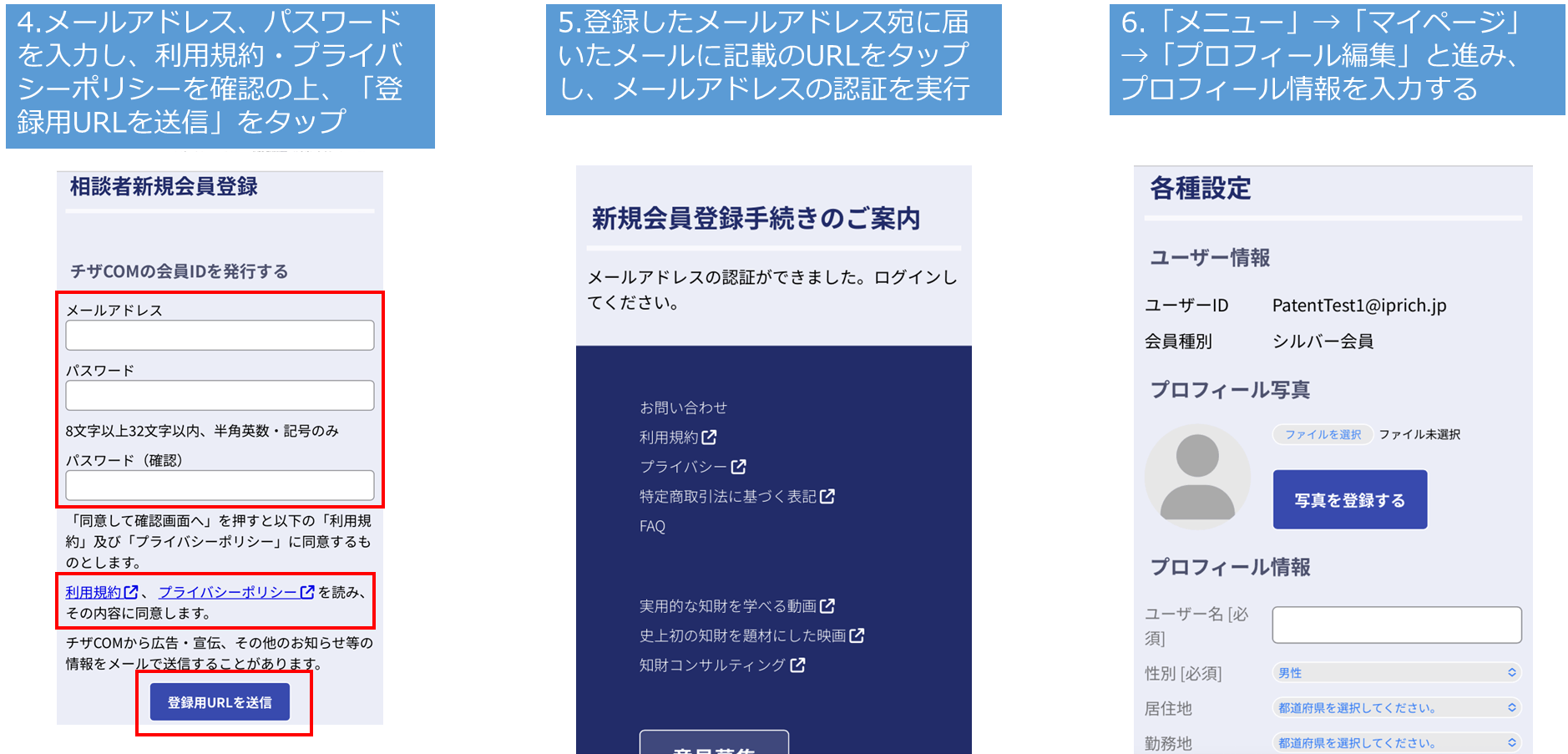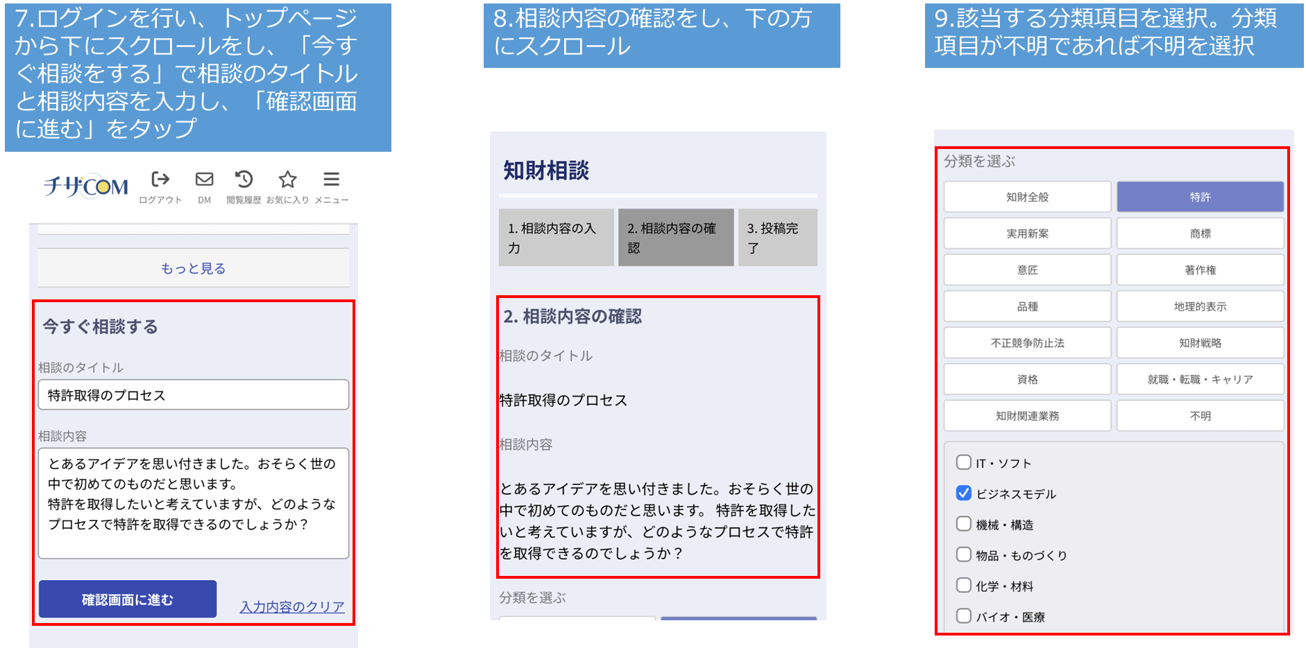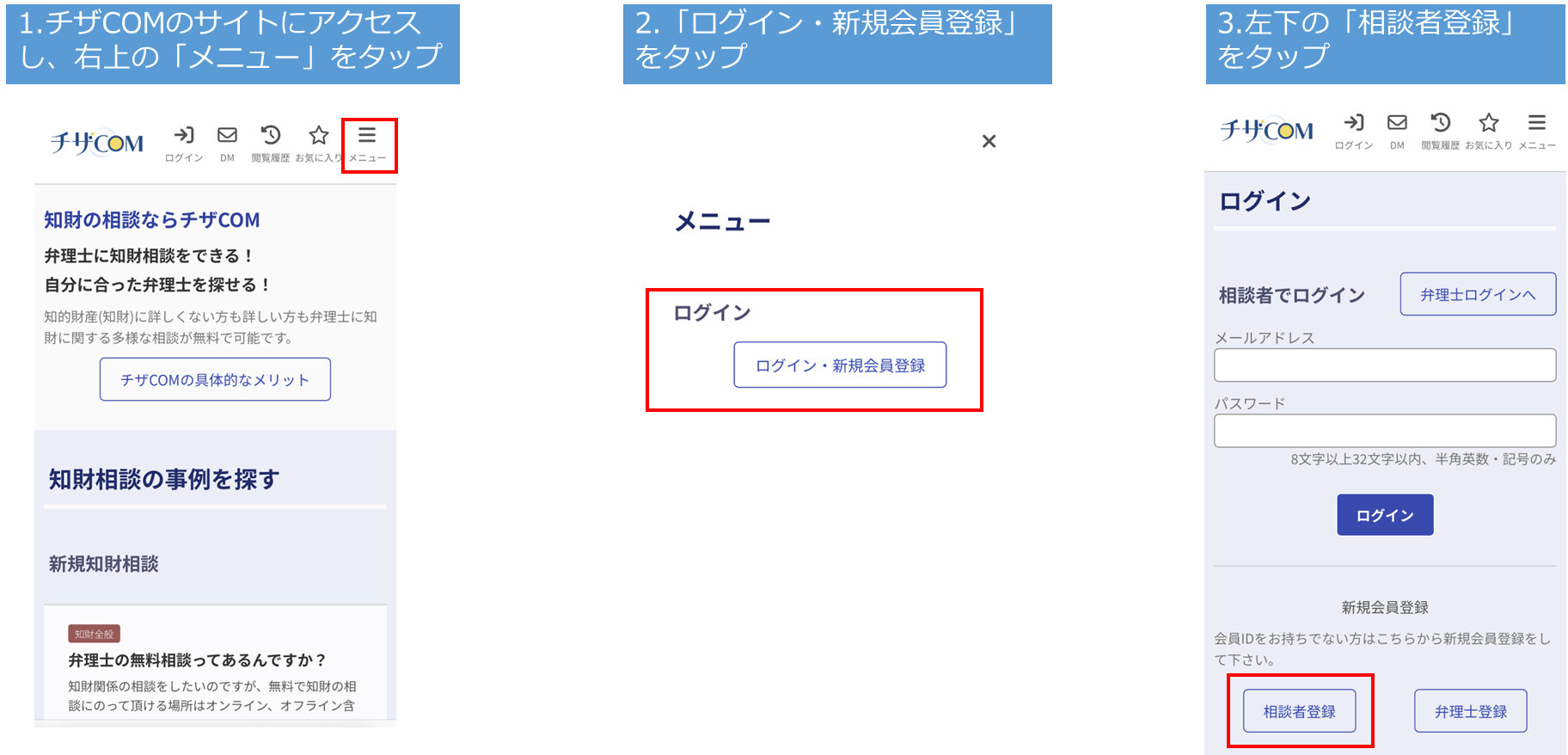 チザCOMの使い方は簡単です。以下、相談者の方と弁理士の方ごとの使い方の簡単な説明になります。