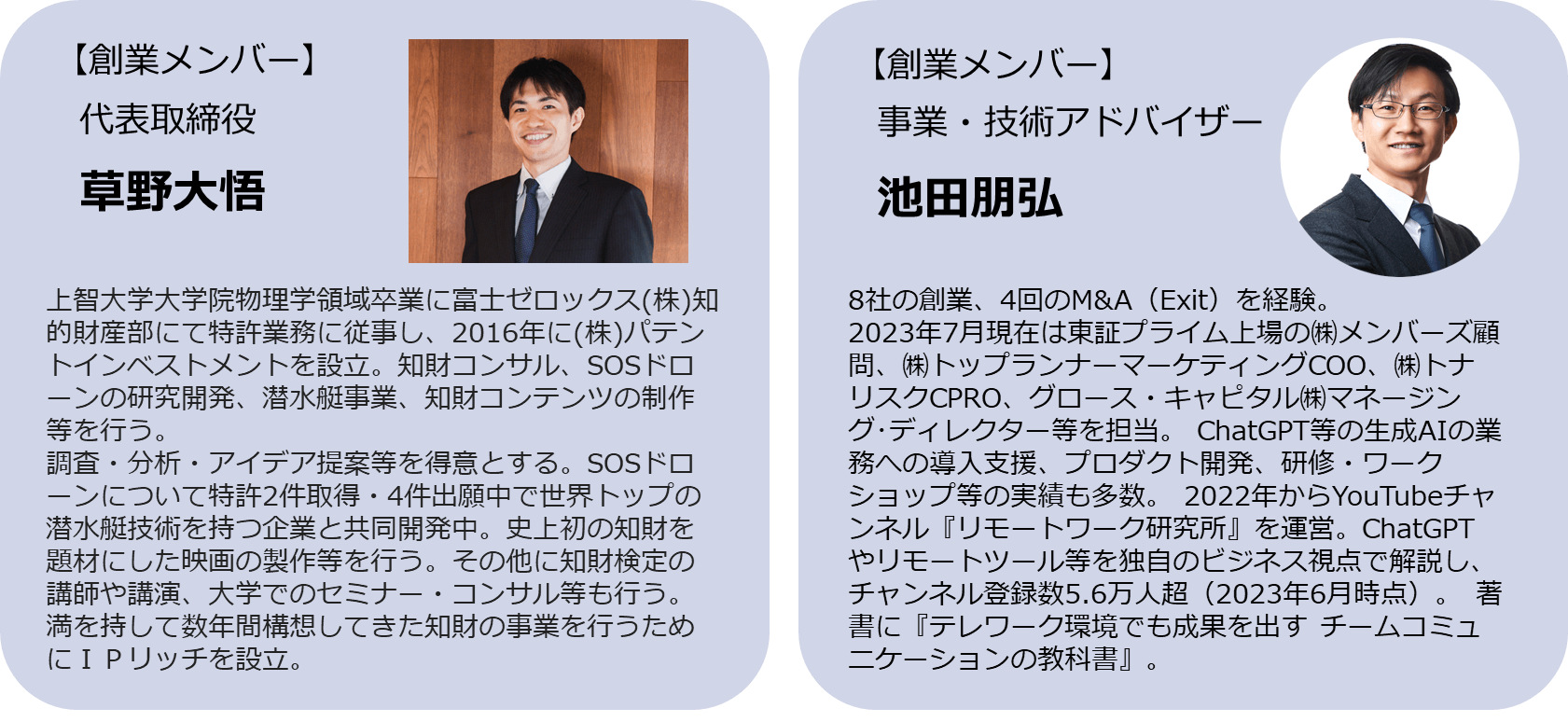株式会社IPリッチは、2023年9月に設立したスタートアップであり、「知的財産の力を駆使してイノベーションを活性化させ、社会を豊かにする」をミッションとし、「知財×ビジネス」の観点に重きを置いて事業を行っています。主な事業内容は、チザCOMの開発・運営、知財コンサルティング、知的財産賠償責任保険の販売、知財Eラーニング動画の制作、メタバース・NFT・生成AIに関連する知財サービスの提供です。