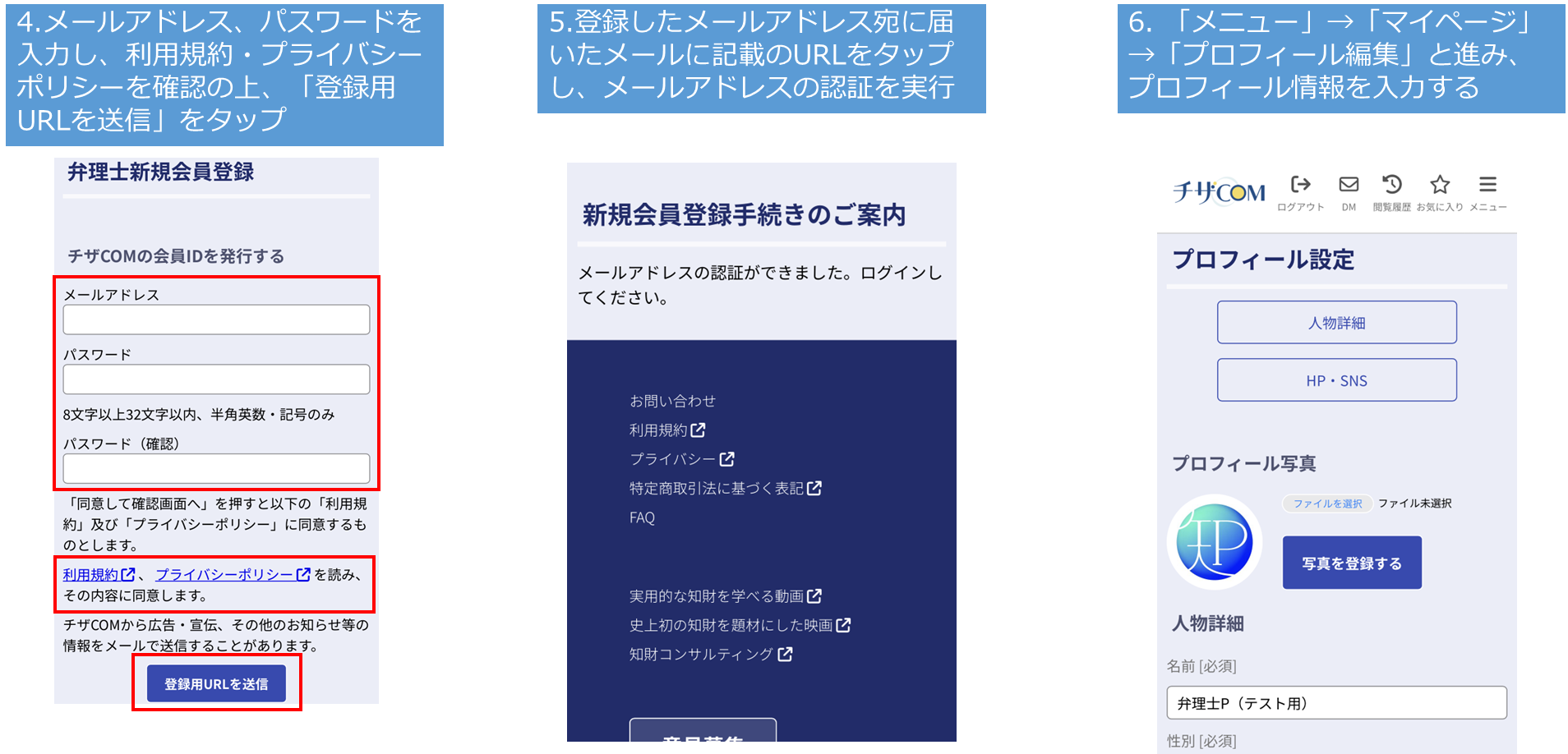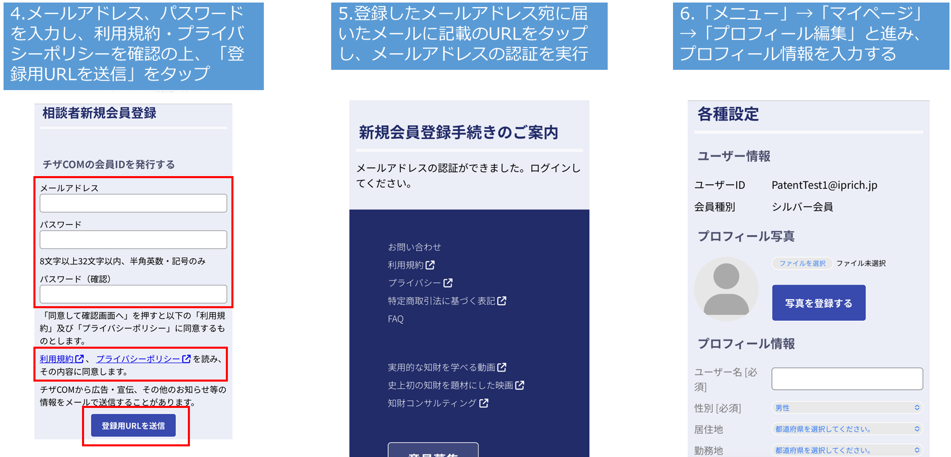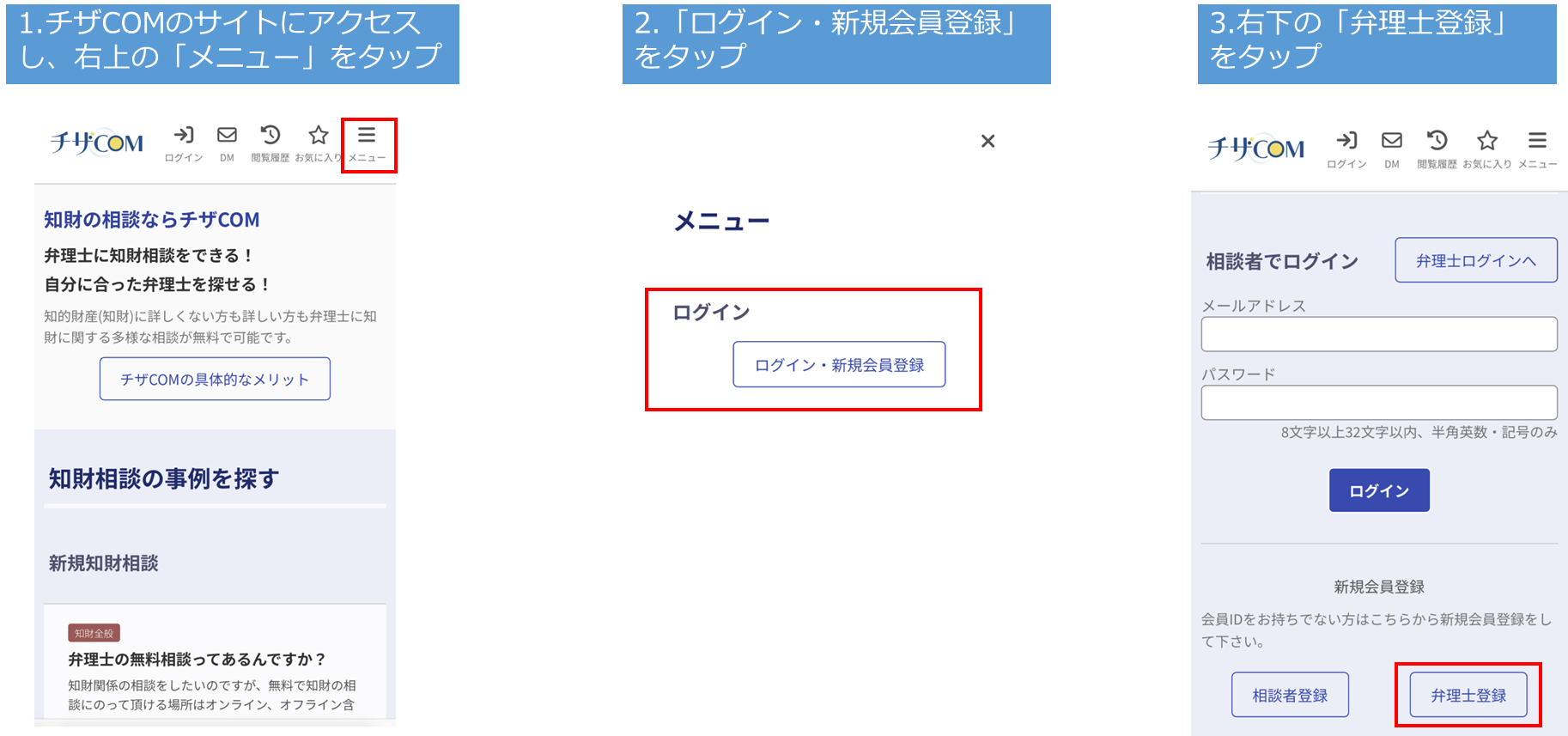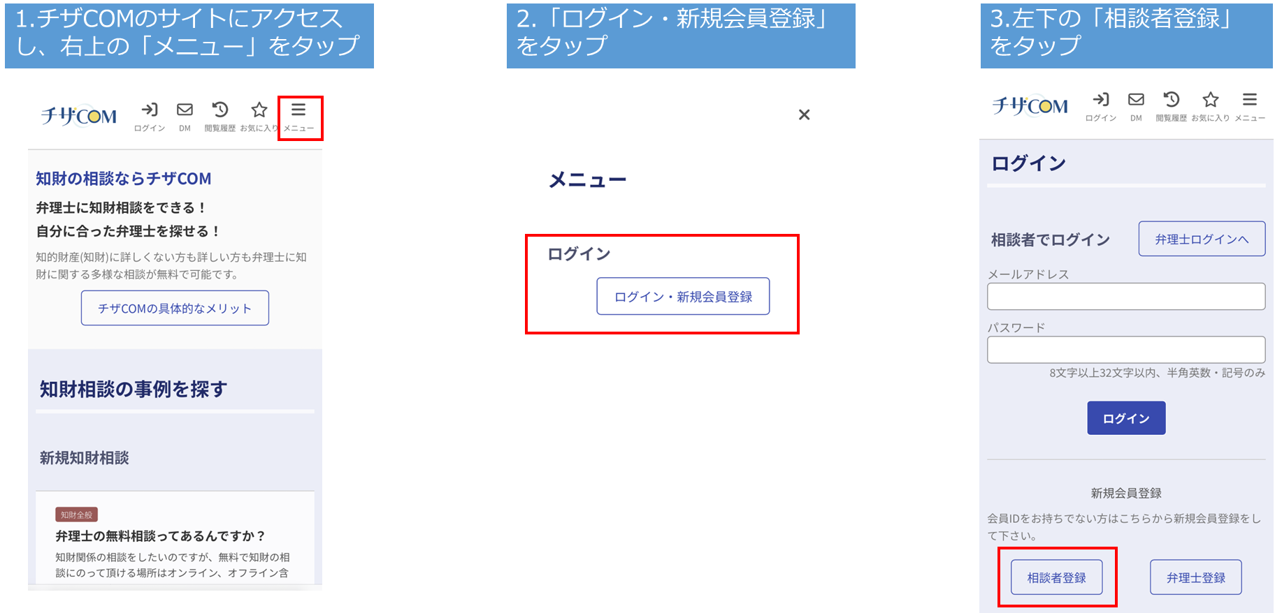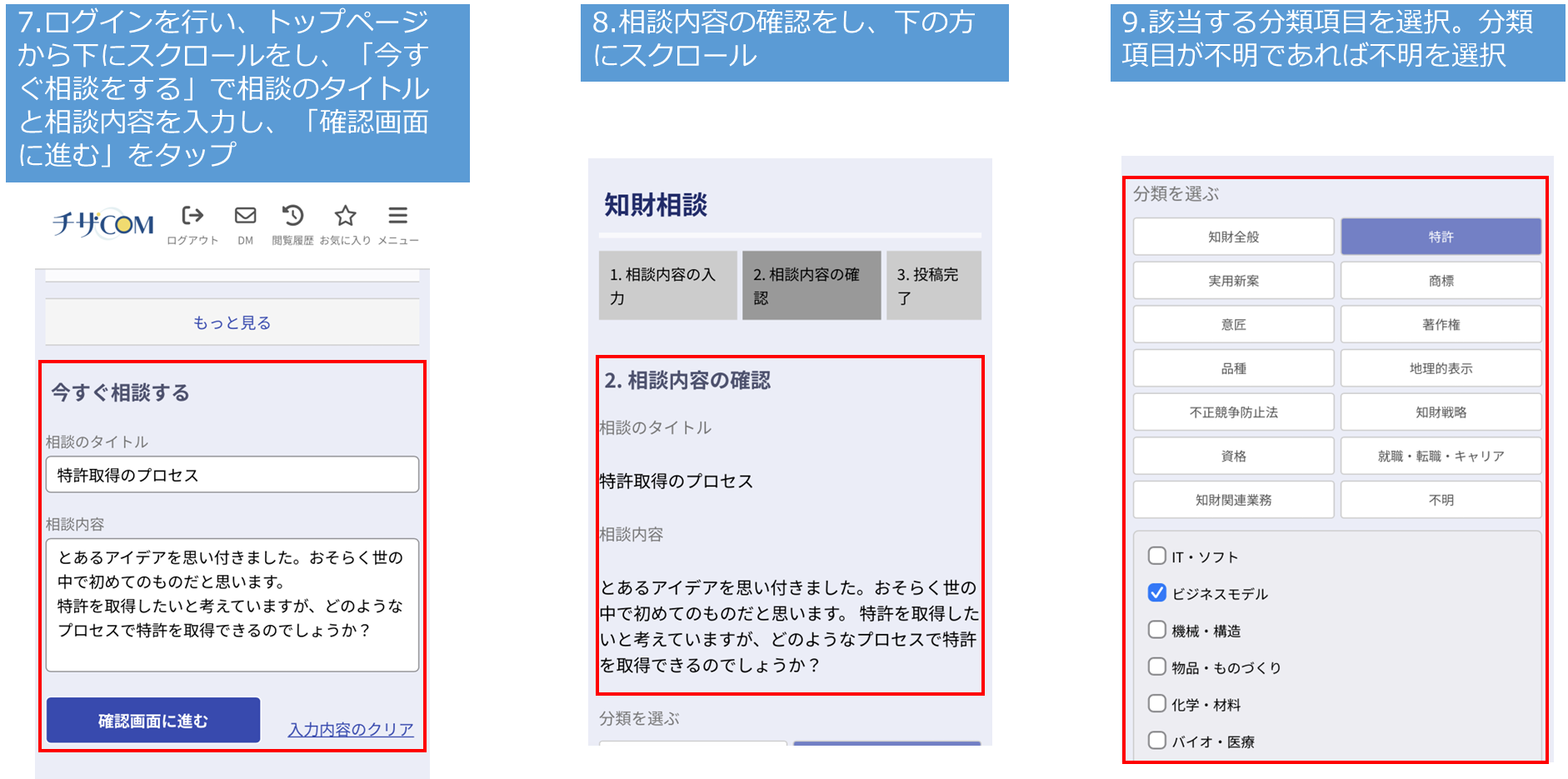 チザCOMの使い方は簡単です。以下、相談者の方と弁理士の方ごとの使い方の簡単な説明になります。