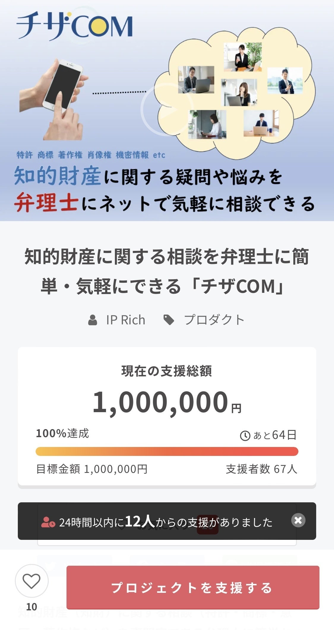 2024/02/29 13:16クラウドファンディング開始から4日後の2月26日に達成率が100%に達しました!ご支援いただいた皆様、本当にありがとうございました!本クラウドファンディングでは、チザCOMやIPリッチの顧客や認知を獲得することに加え、世の中での知的財産の認知を高めることが大きな目的です。そのため、もっともっと多くの方々に本プロジェクトを知っていただきたいと考えております。これまでの活動で周りの方々への認知は広まってきましたが、今後は広告などを活用して幅広く本プロジェクトを知っていただきたいと思います。金額の達成率としては、3月中に250%を目指します。しっかり結果を出して、ご支援いただいた方への恩返し、そして知的財産という世の中にとって非常に重要なことの認知・理解に大きく貢献できるように尽力して参ります。応援のほど、どうぞよろしくお願いいたします! もっと見る