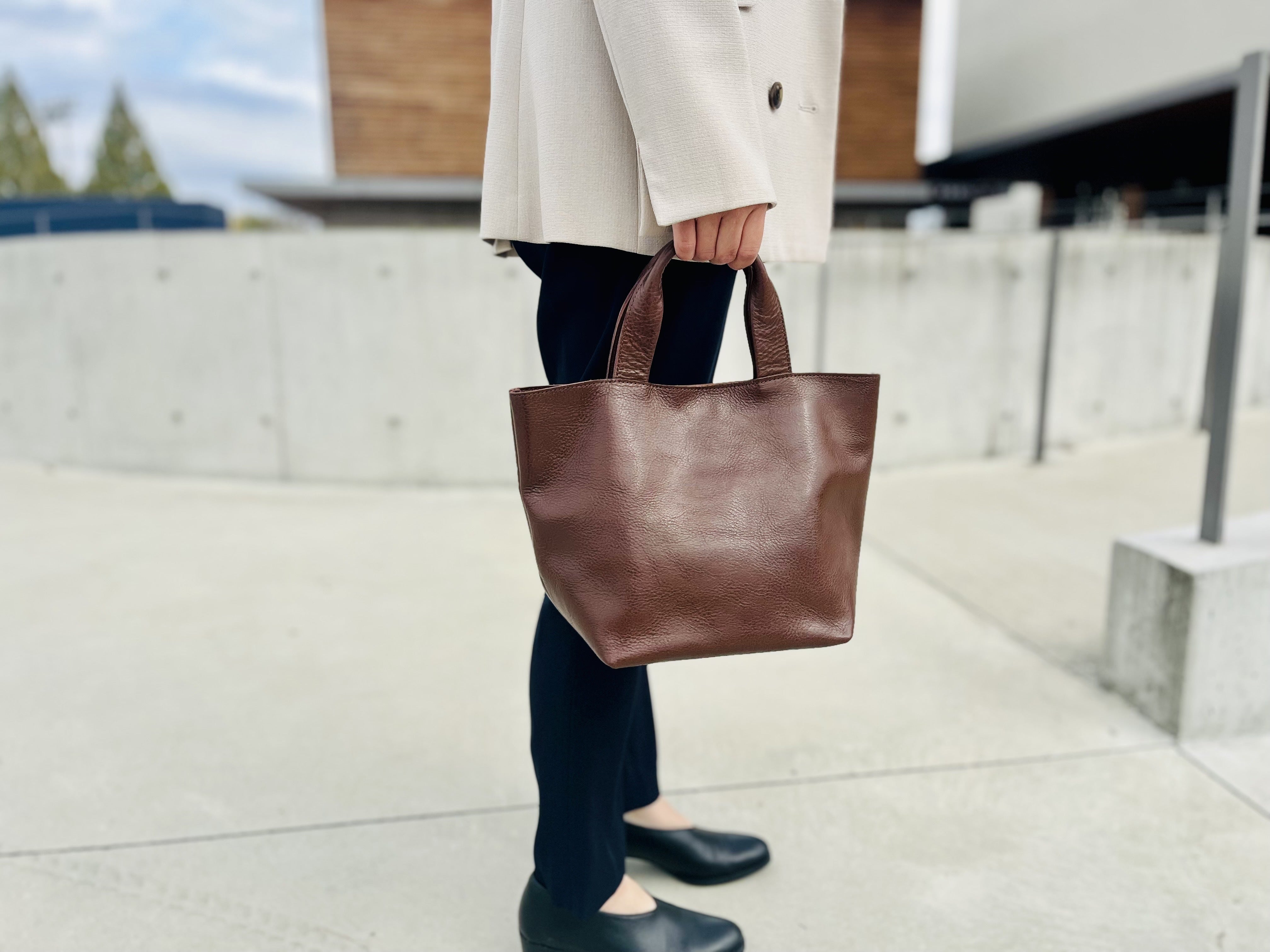 トートバッグには少し厚みのある革を使用し、カラーは使いやすく、なるべく落ち着きのあるものを選定しています。その他の小物類は、明るいカラーのものが多数ございます。