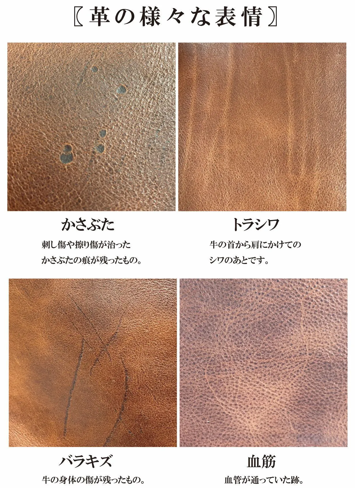 本革には合成皮革にはない牛が生きていた証の印があります。元々の素材を生かした仕上げの為、その牛が持っていたキズ、シワ、血管、毛穴などの天然の刻印がよくみられるのが特徴です。これらは身体の部位や個体差で一つ一つ表情が異なる。世界に2つとない自分だけの特別な革をじっくりとご覧ください。