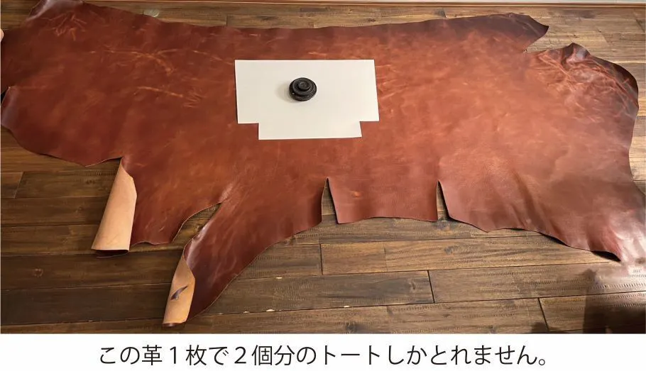 盤面の革は贅沢1枚革仕様。シンプルで素材感を感じてもらえるように、1枚革で製作しました。一枚で大きなバッグを製作すると、革のロスが沢山でてしまい、原価が高くなりますが、それを敢えて惜しみなく製作しています。