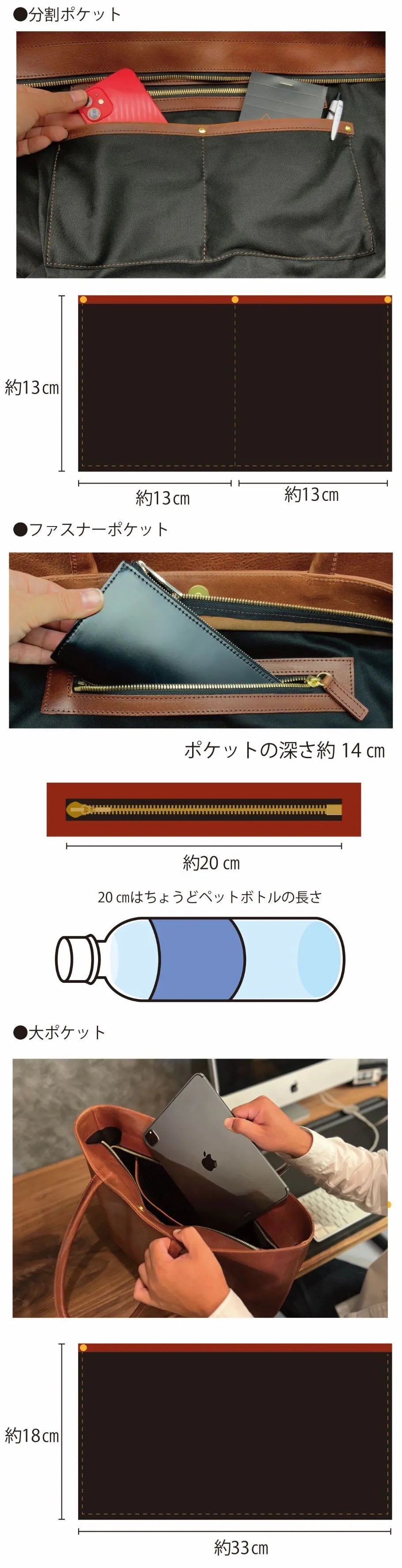・スマホ、名刺ケースがしまえる分割ポケット