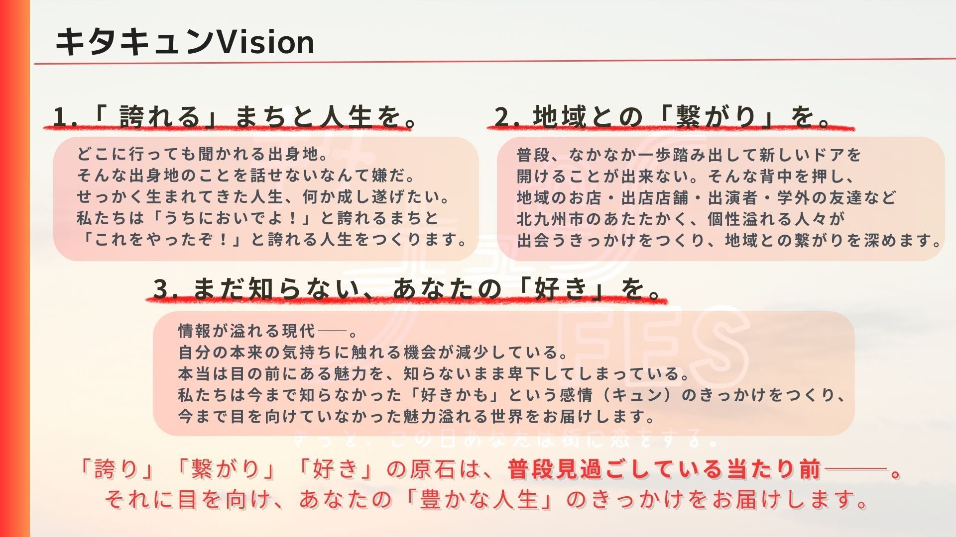 そして、私たちは「キタキュンFES」を通して北九州市の魅力を再発見し、「このまち好きかも」と思ってもらえる仕掛けを提供します。
