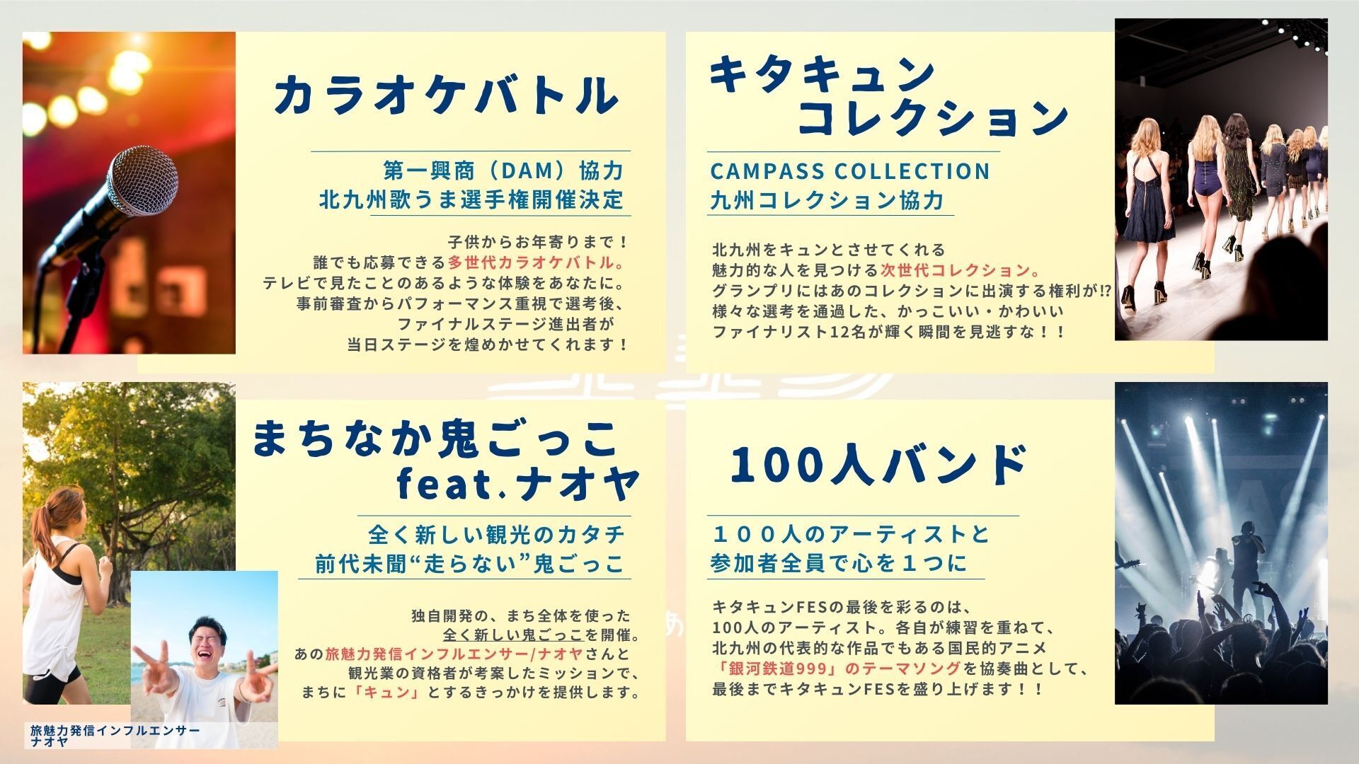 DAY1の10時間のお祭りはステージショーや1日限りのキタキュンFES縁日、DAY2では北九州市のまちの観光地をまるでテレビ番組のようなドキドキ感を感じながら楽しむことができる独自開発した公共交通機関を活用した“走らない鬼ごっこ”、北九州市で立ち上げ現在8地域で開催中の挑戦したい学生と挑戦する社会人の交流パーティーThePartyzなど、誰もがワクワクし、無意識に北九州市に恋してしまうような北九州市を満喫できる2日間にこだわります。