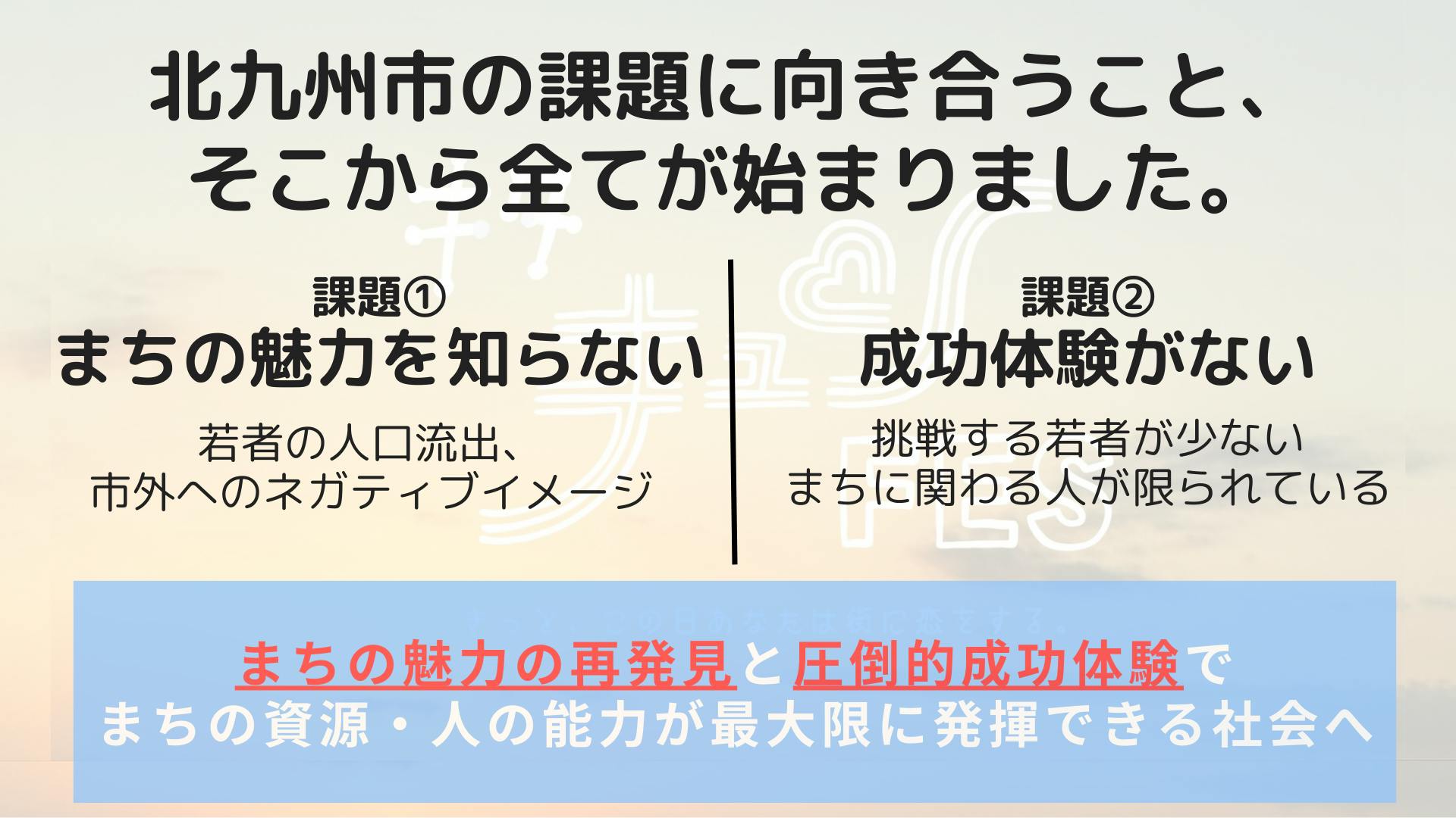 北九州市を良くするためには、「魅力再発見」「成功体験」を広く体験し、その価値を次世代に伝えることが重要です。しかし、一般的な「社会課題」や「まちづくり」の言葉では敷居が高いと感じ、より斬新で楽しく、多くの人が参加できるきっかけが必要だと考えました。