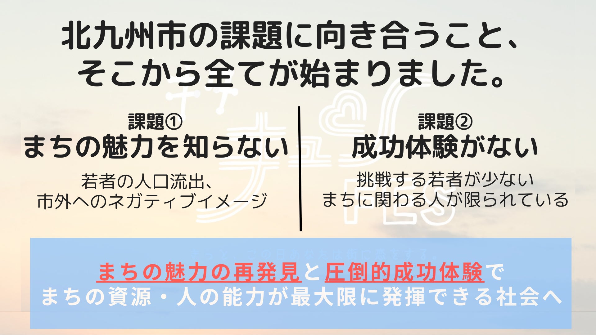 北九州市を良くするためには、「魅力再発見」と「成功体験」を広く体験し、その価値を次世代に伝えることが重要です。しかし、一般的な「社会課題」や「まちづくり」の言葉では敷居が高いと感じ、より斬新で楽しく、多くの人が参加できるきっかけが必要だと考えました。