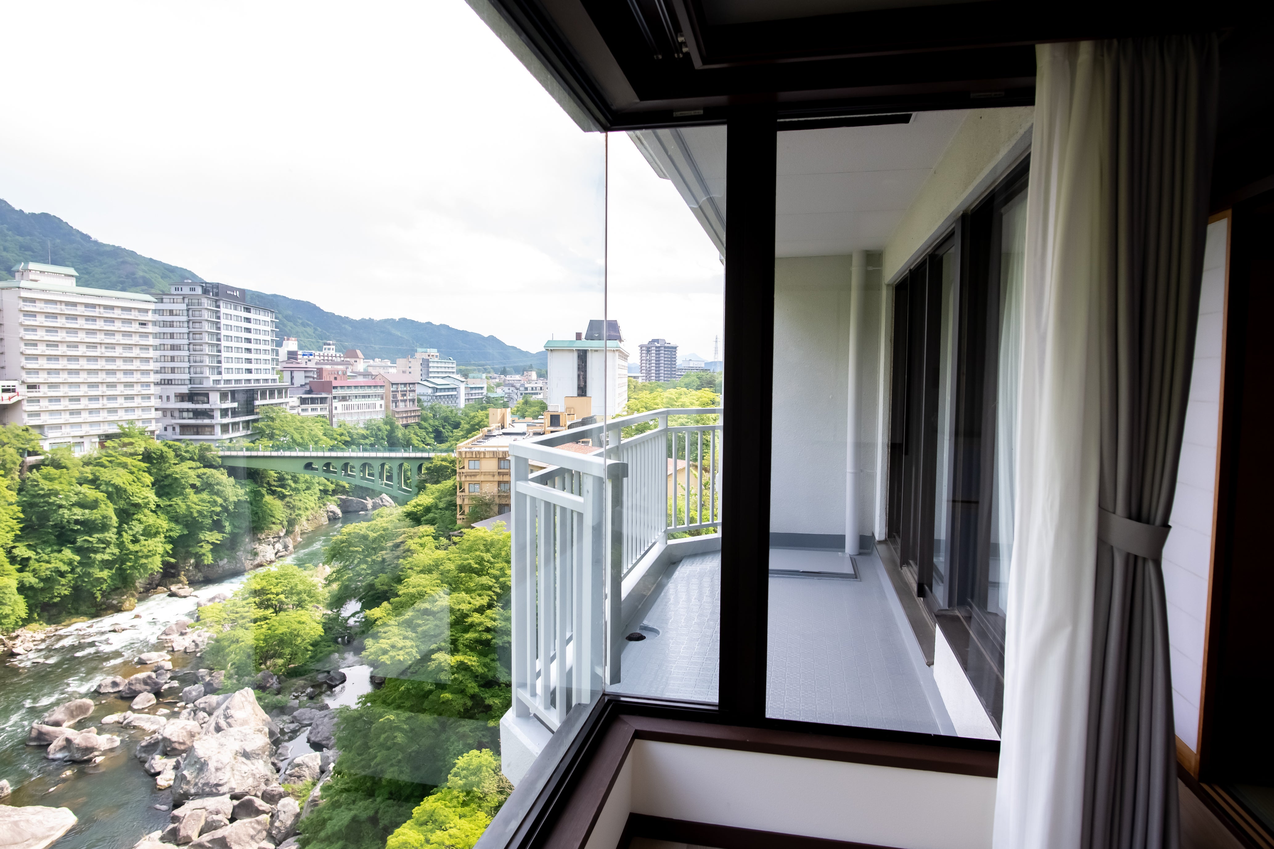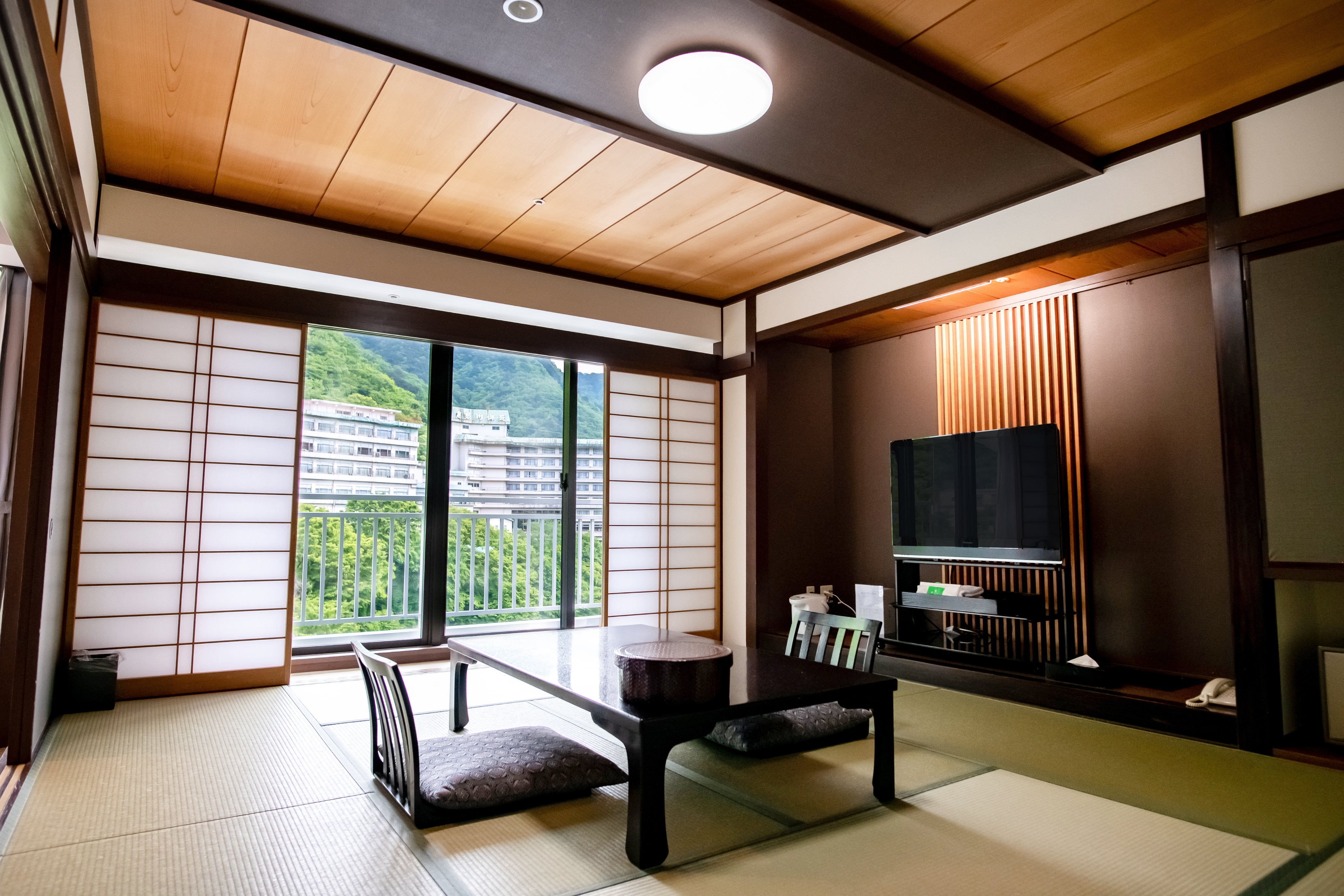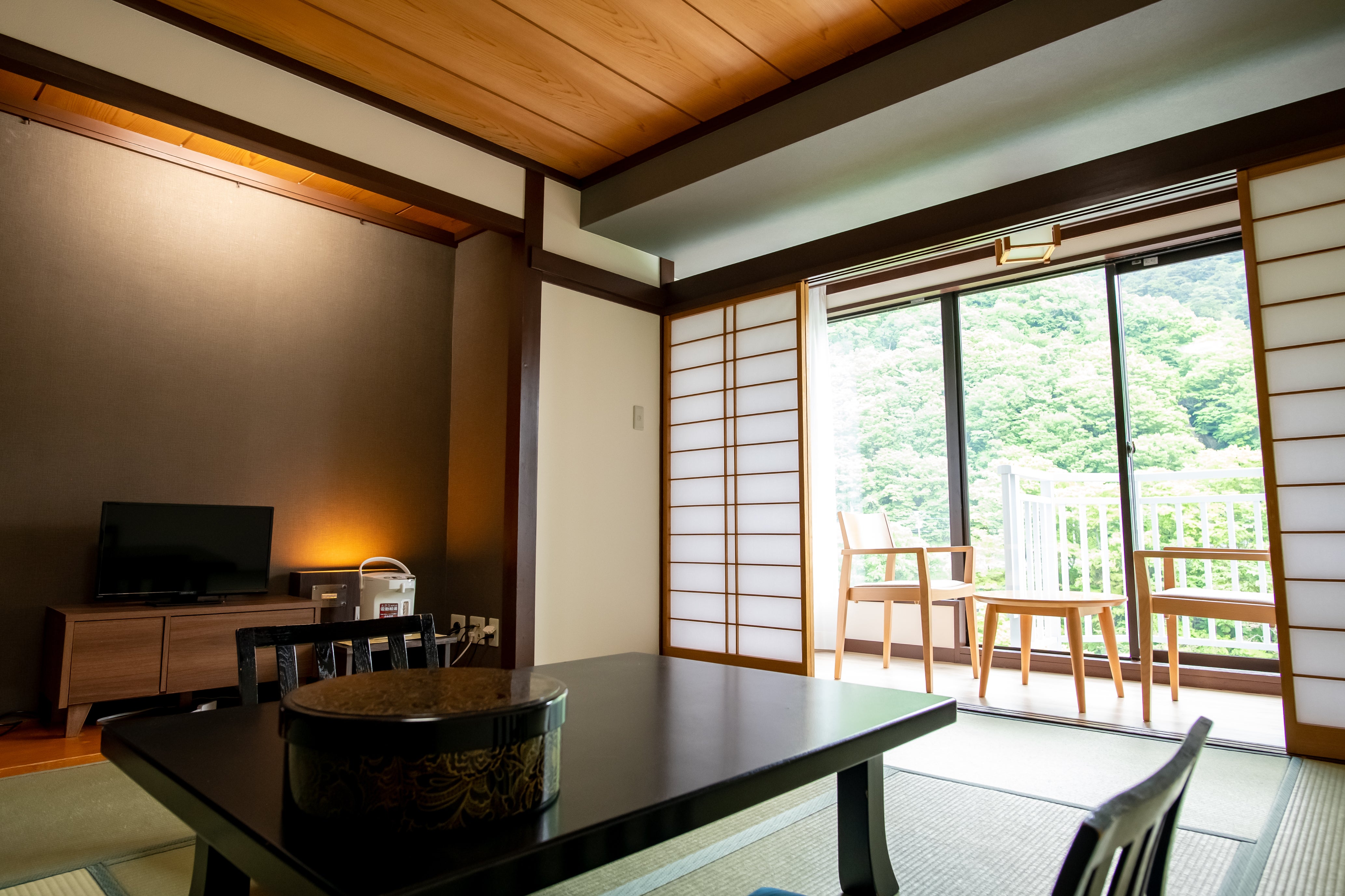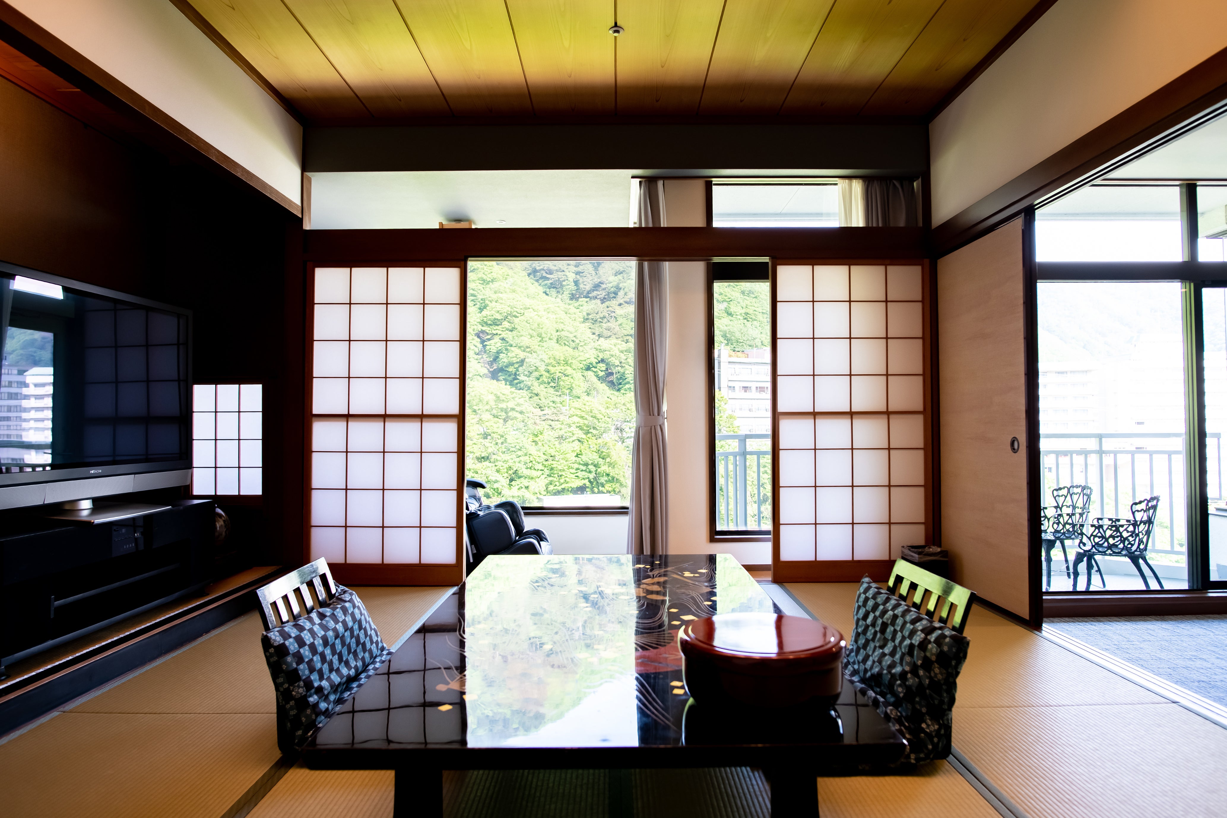 広々10畳の和室は鬼怒川を眼下に見下ろす広縁付き。伝統的な日本の美しさと心地よさを追求した空間設計が特徴です。