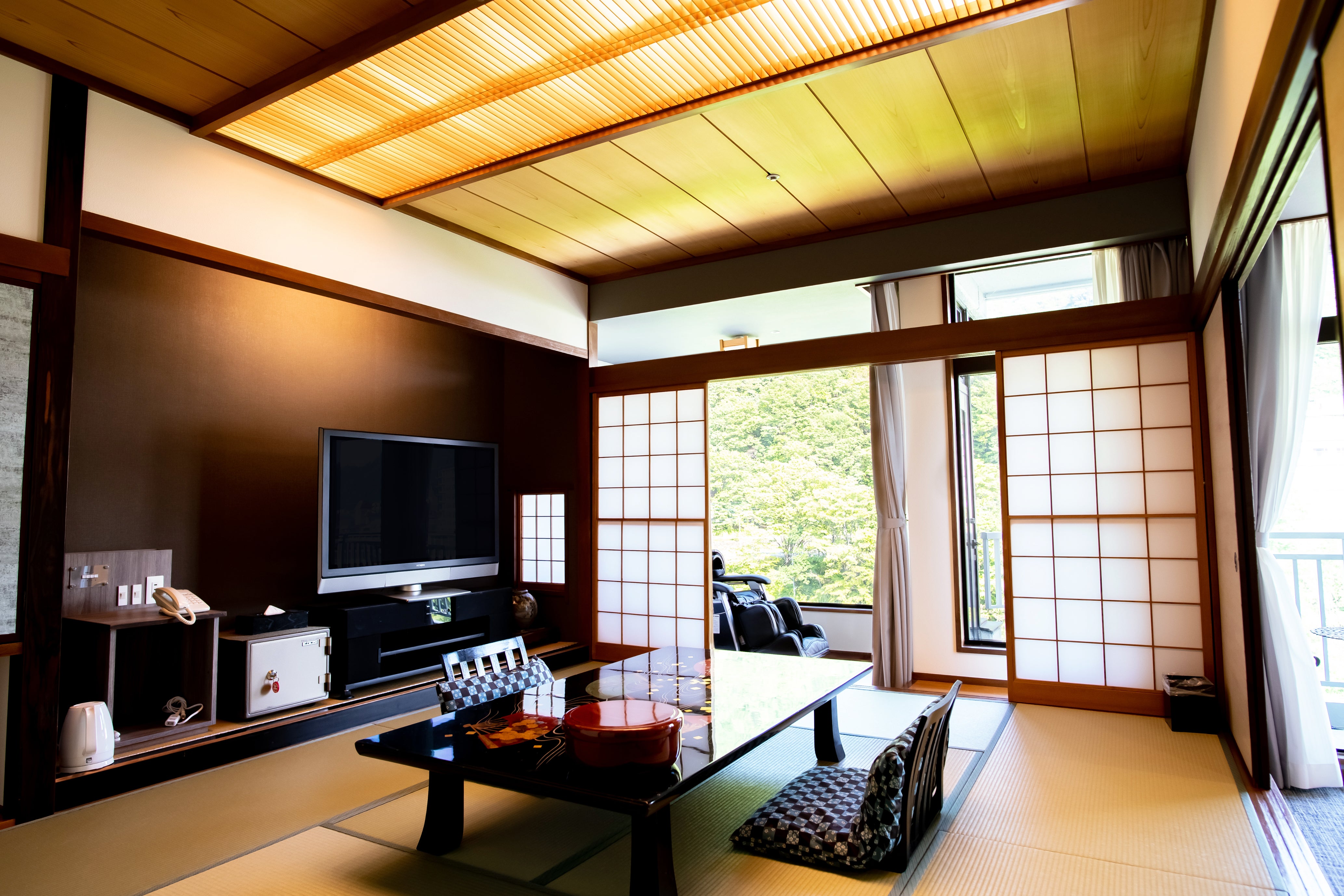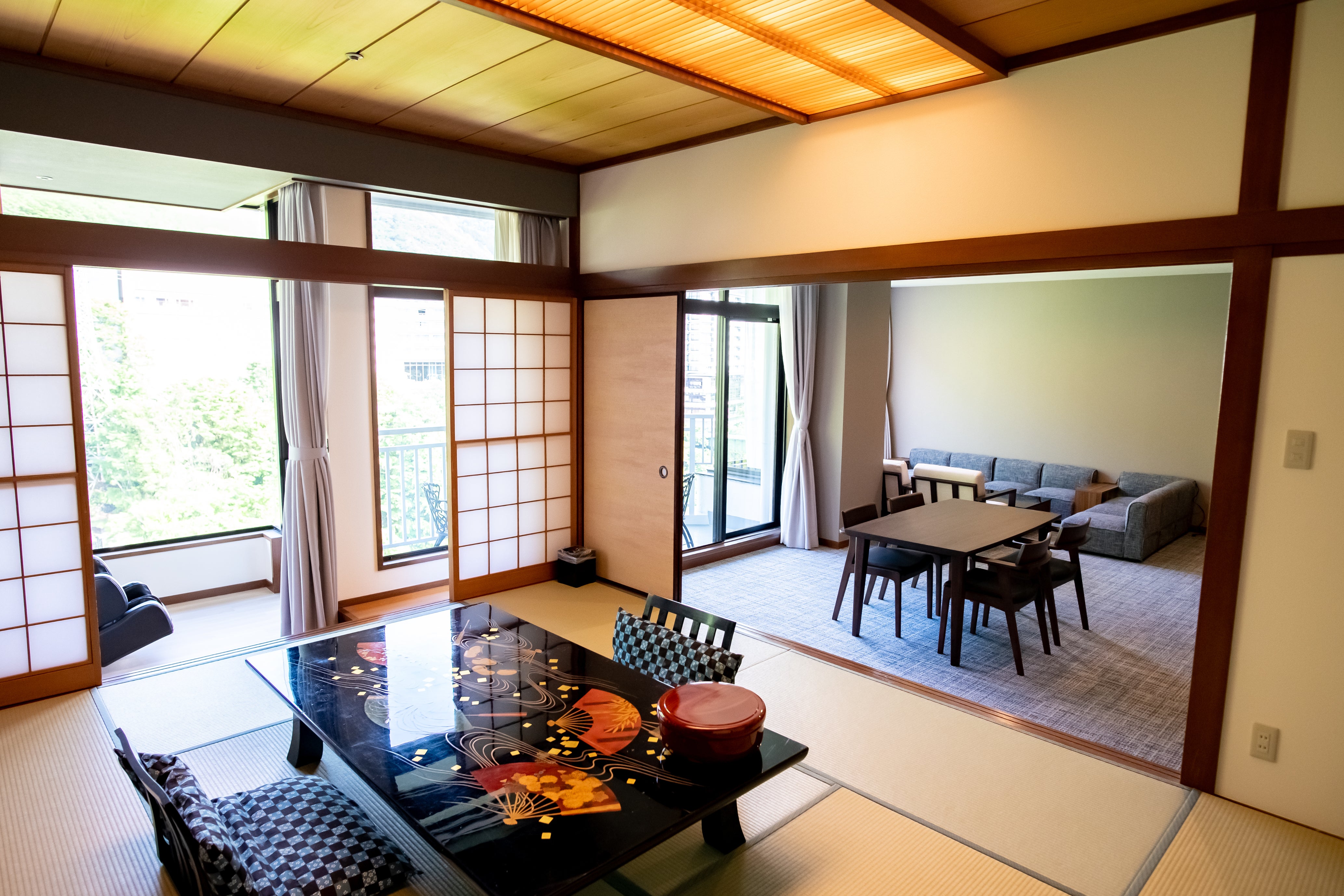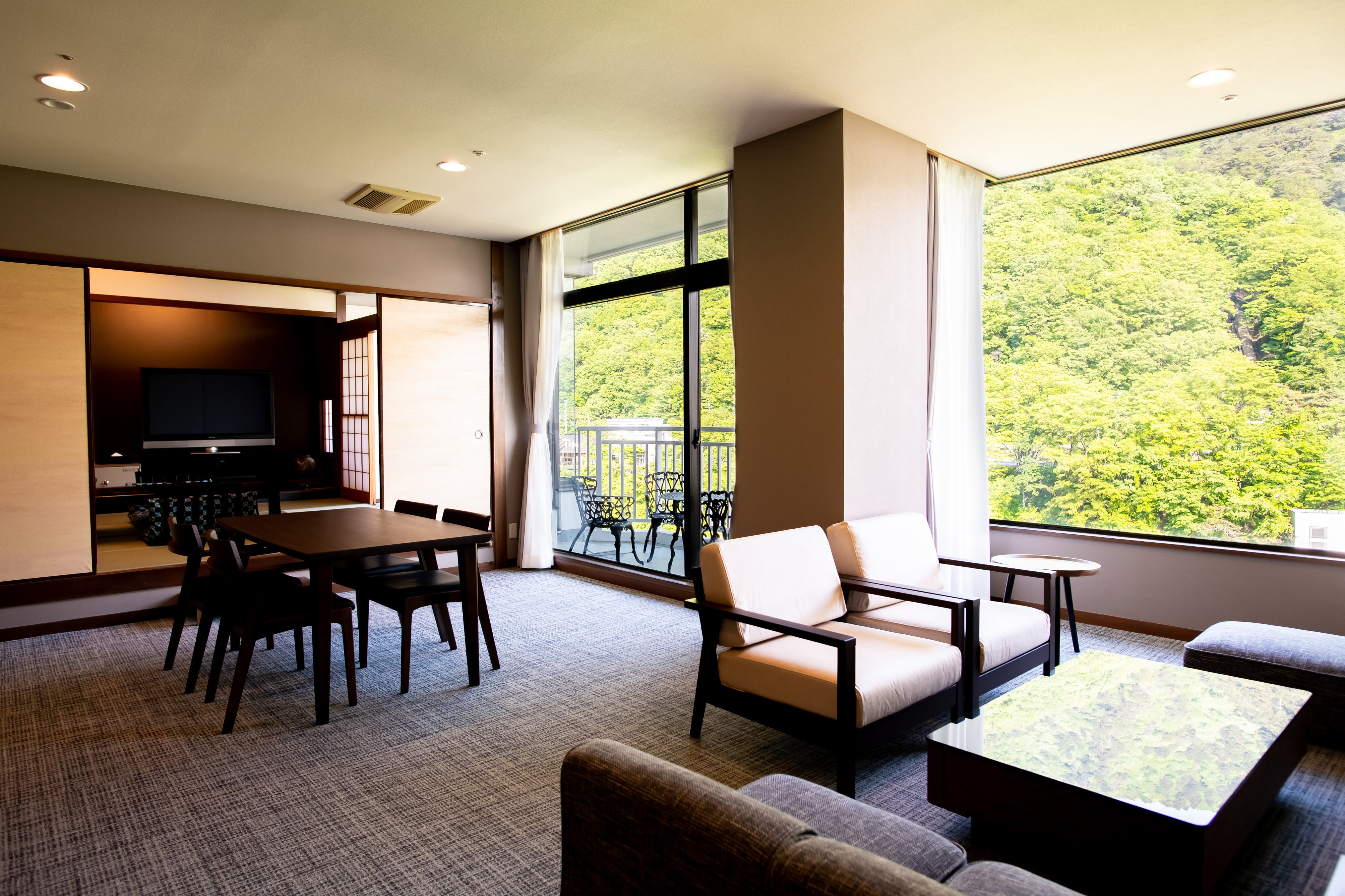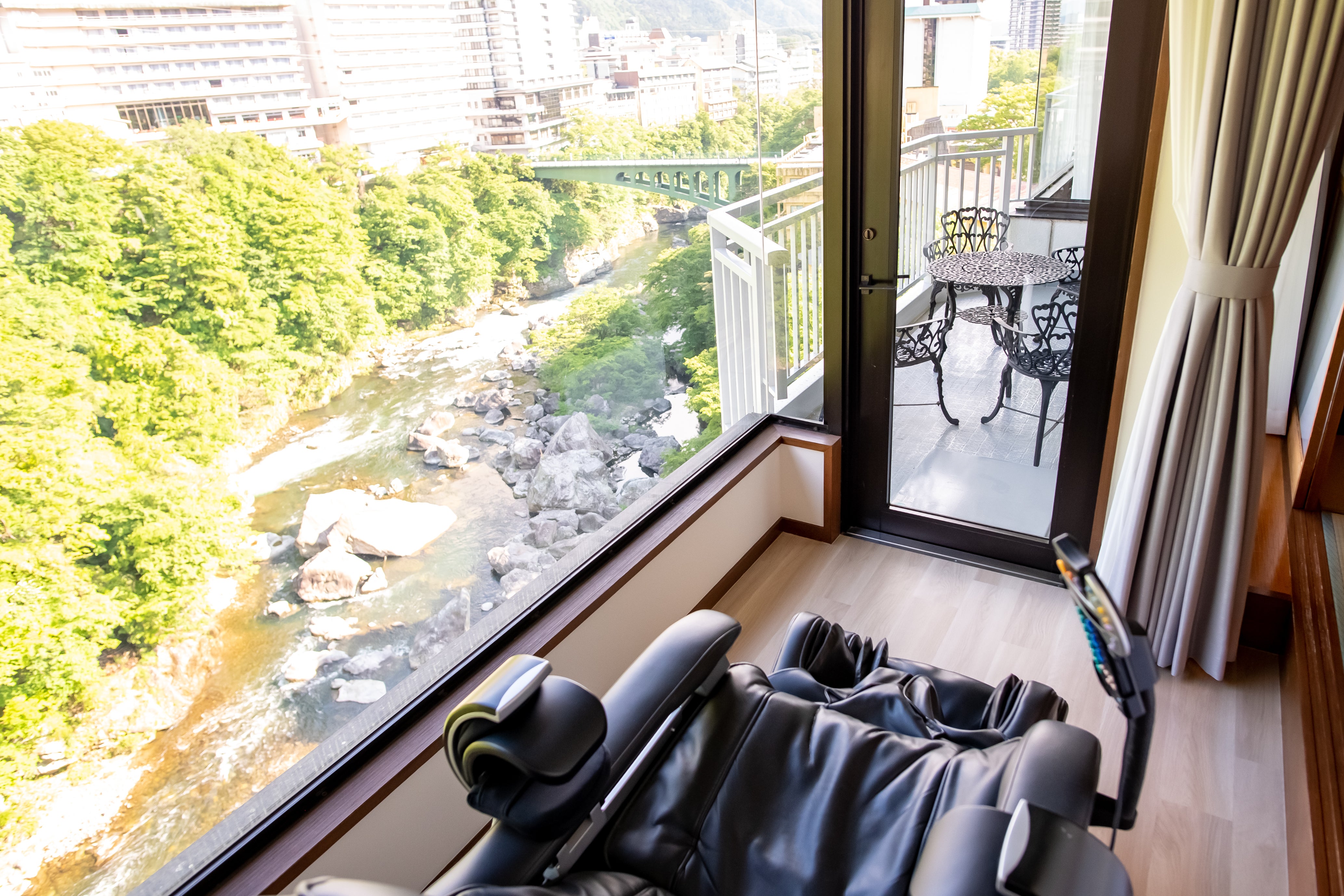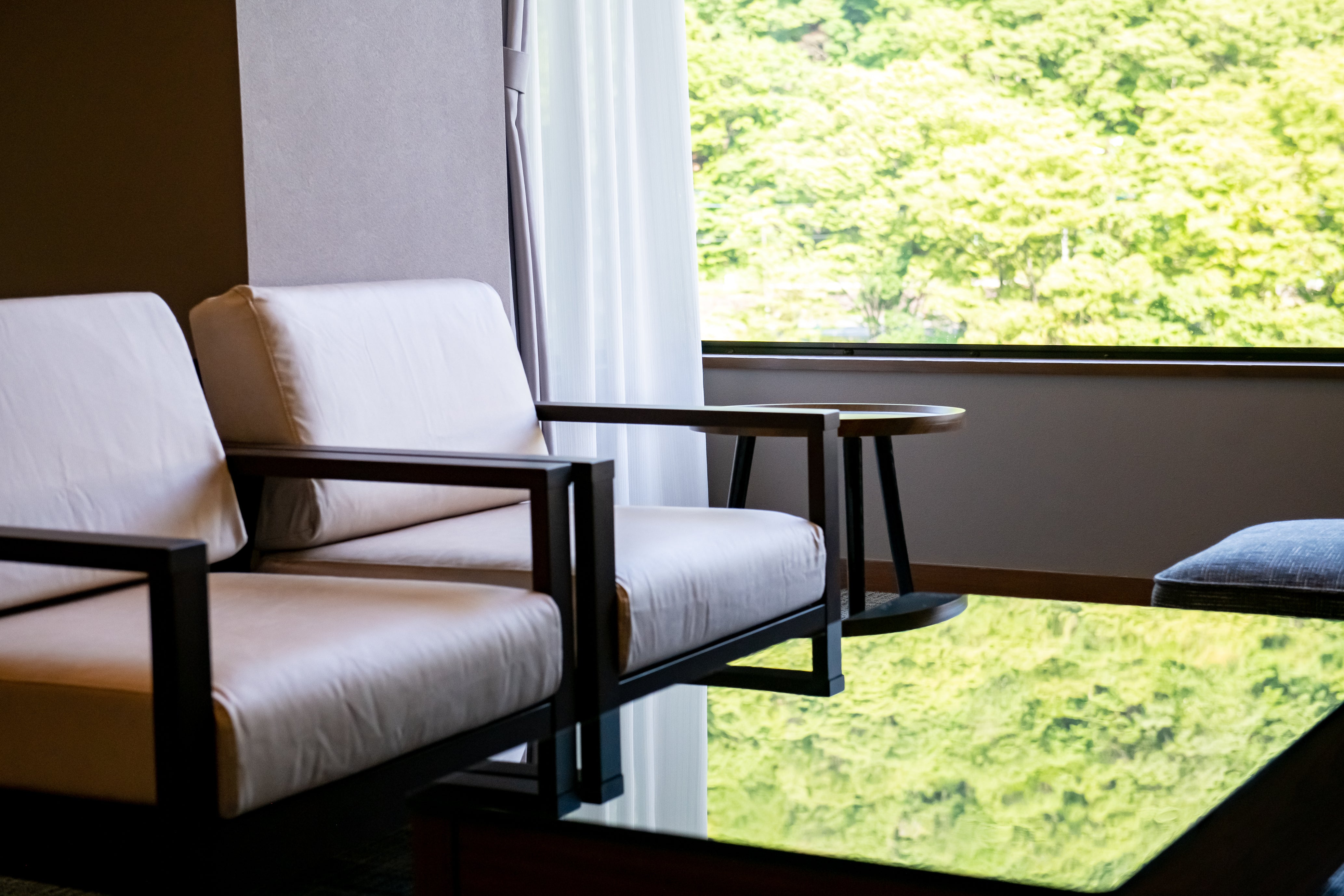 2間続きの広々とした空間で、木の温もりあふれる贅沢な部屋です。広縁からは鬼怒川のせせらぎを目の前に眺められ、マッサージチェアもご用意。木の温もりあふれる空間で、大切な方との憩いのひとときをお楽しみください。
