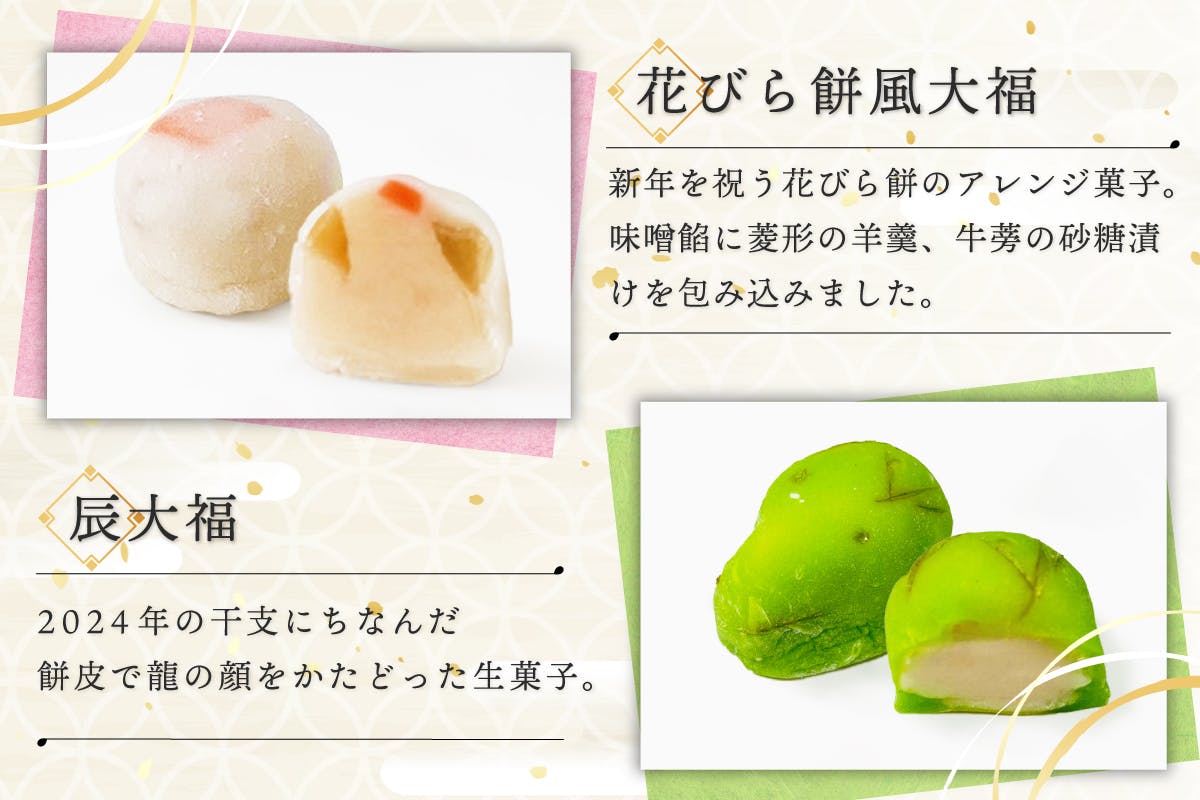 年始を彩る鶴屋自慢のおはぎ・大福と、新年を祝う迎春菓子がセットになった12種の豪華和菓子重。