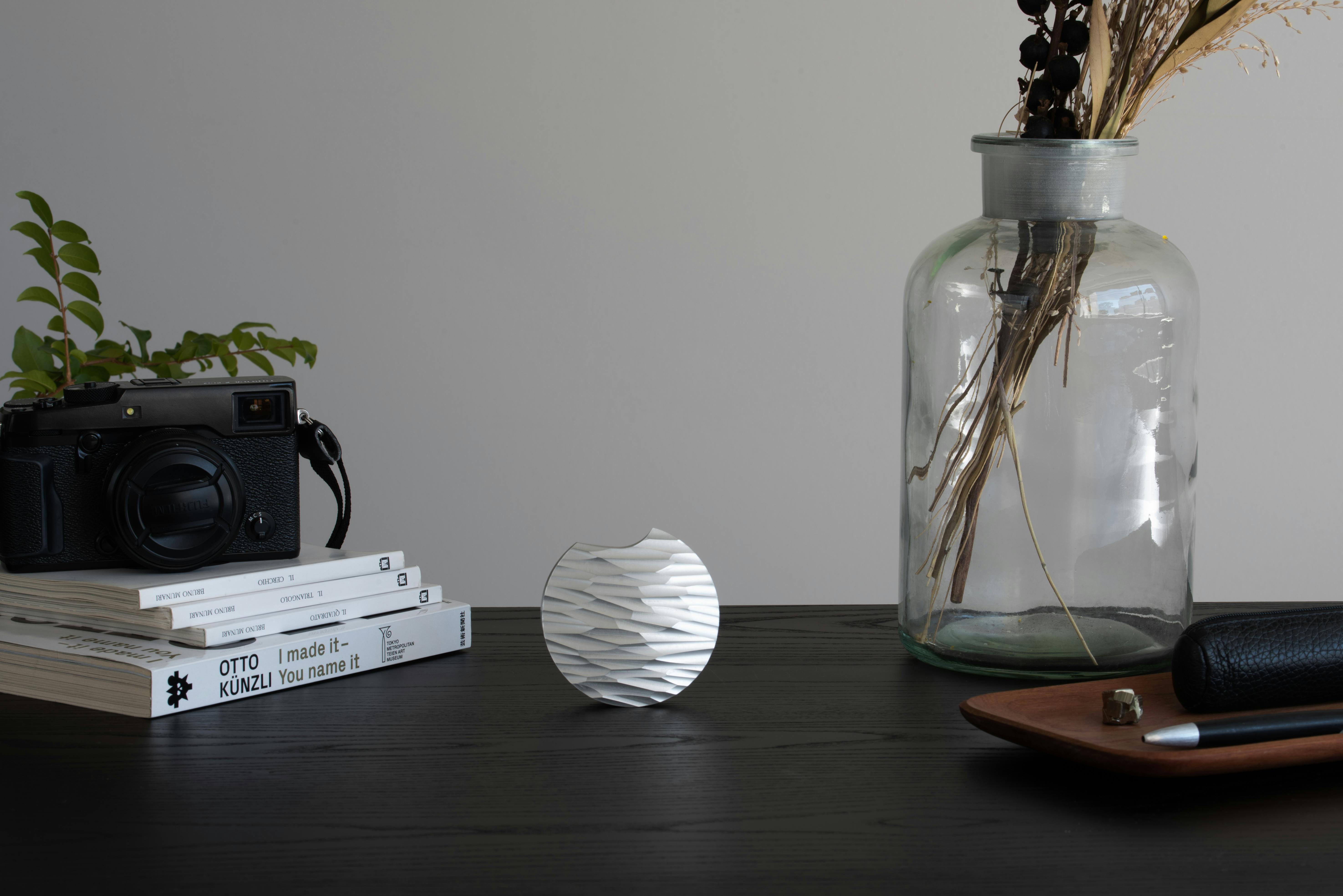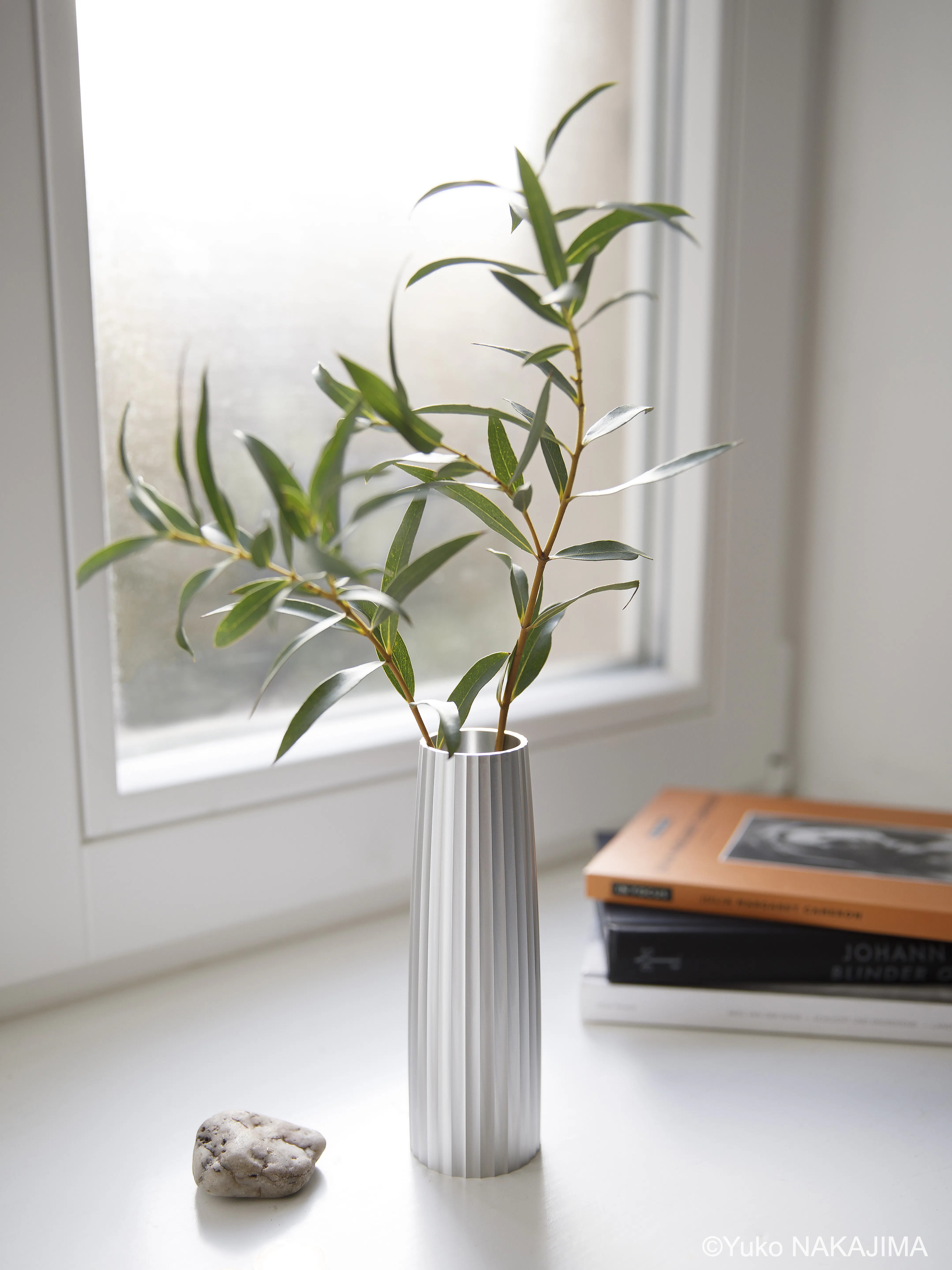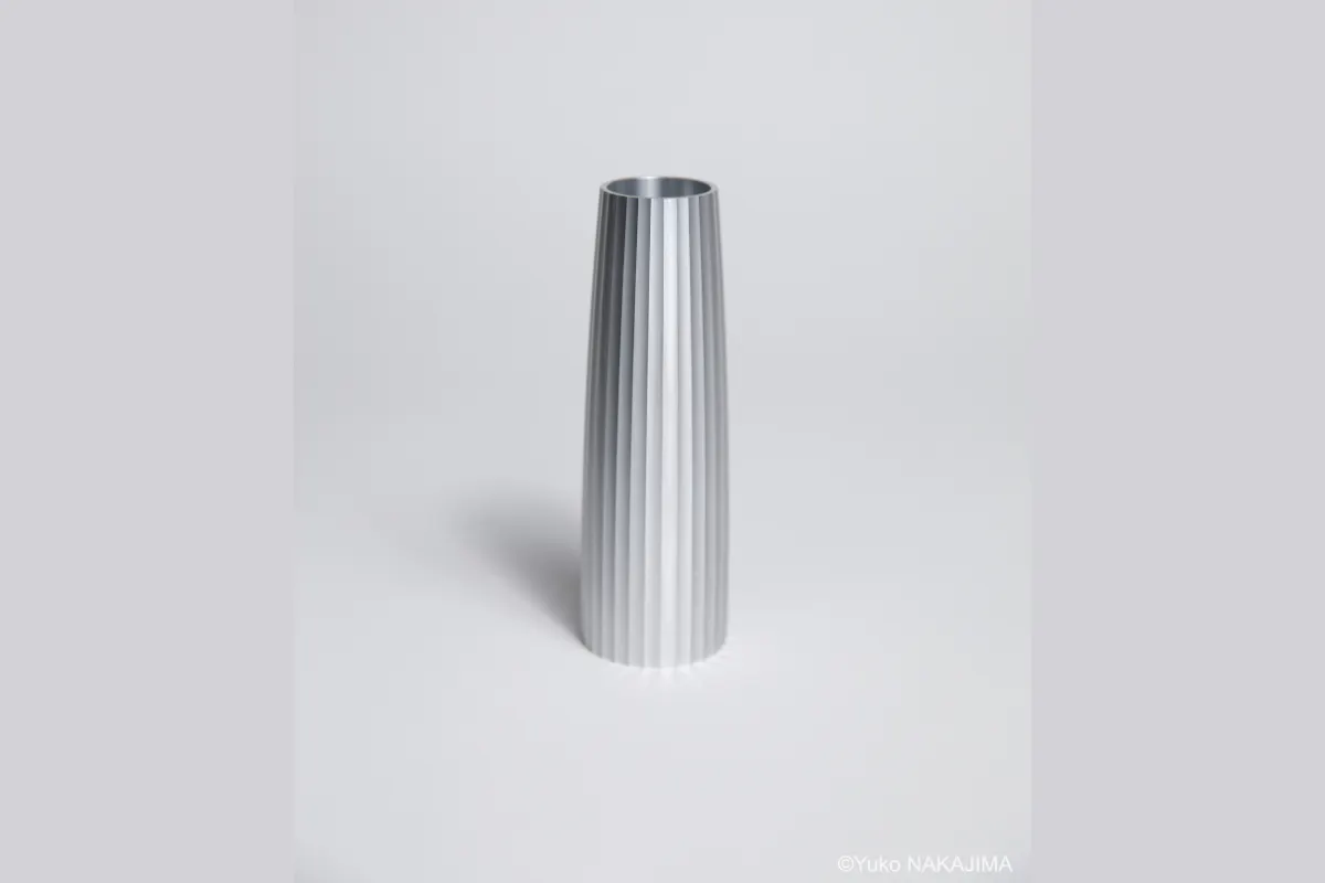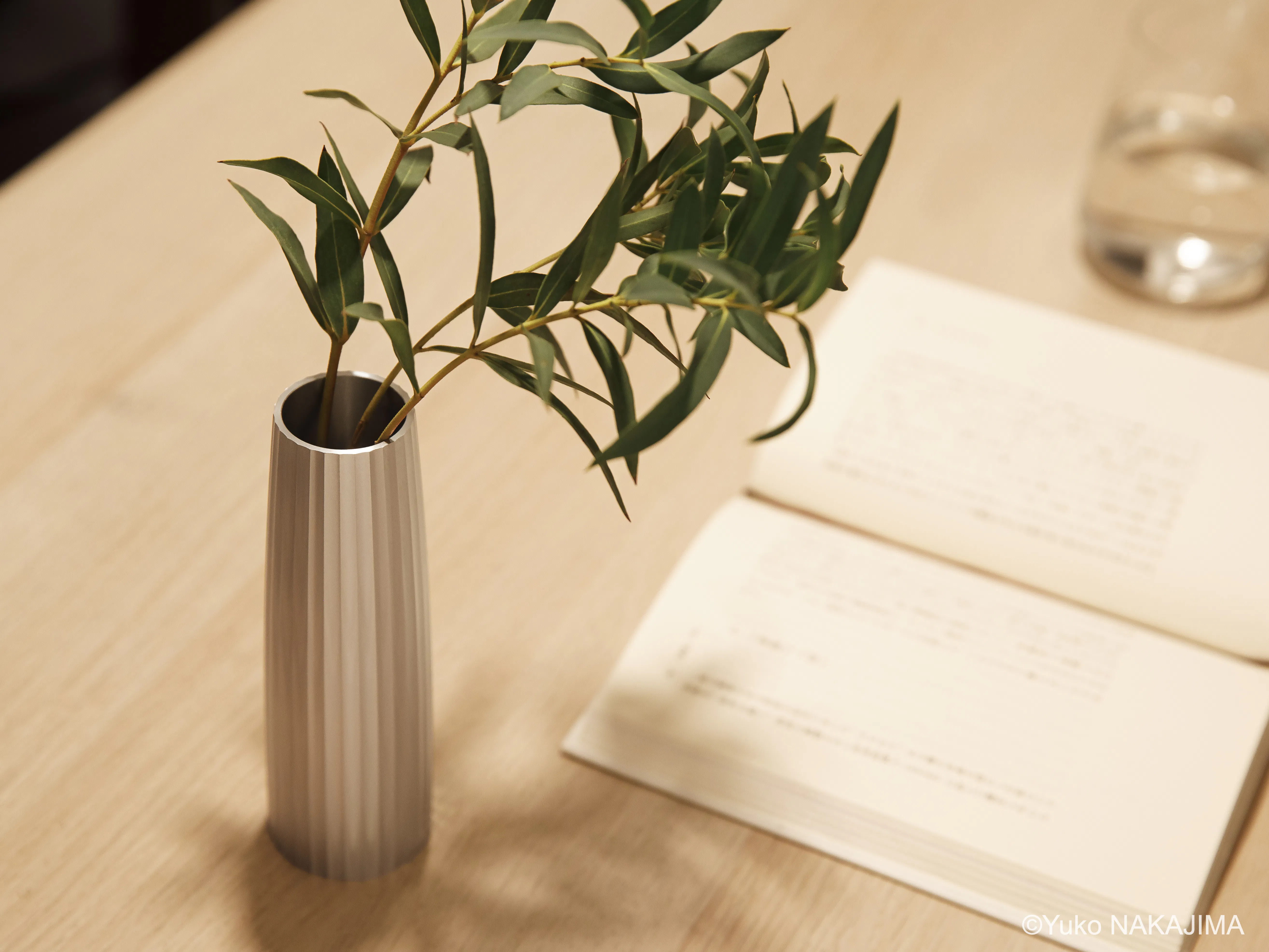 「OOPARTS-002」は、アルミを塊から削り出すことで光を受けて美しく繊細に輝き、活けた花や植物を美しく⾒せるオブジェのような花器です。