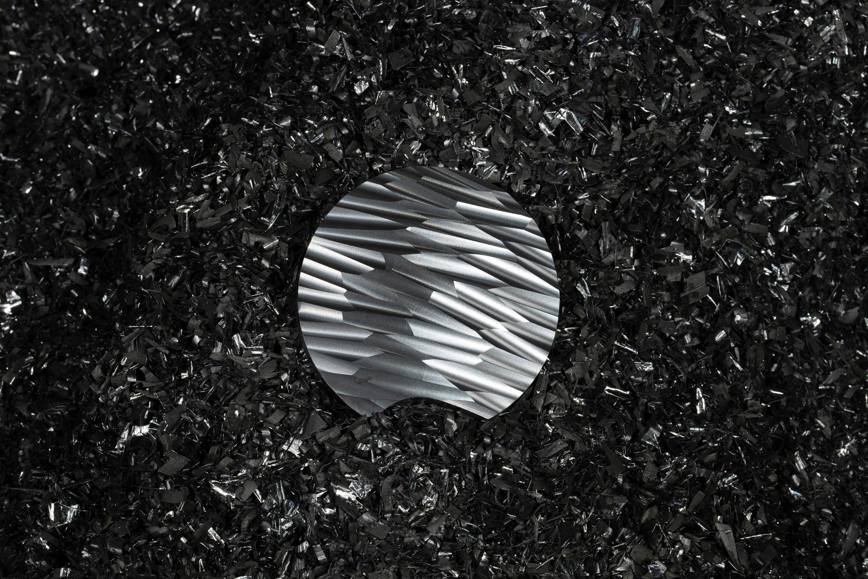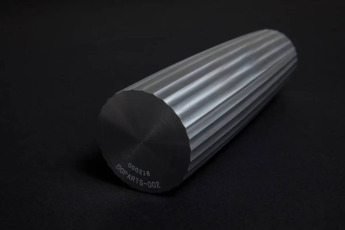 「OOPARTS-002」はアルミニウムの塊を削り出して作られています。⼯場では旋盤で形が整えられたアルミの塊が切削加⼯の機械にセットされ、プログラム通りに削られていきます。エンドミルの軌跡がそのまま表⾯の模様になっていきます。