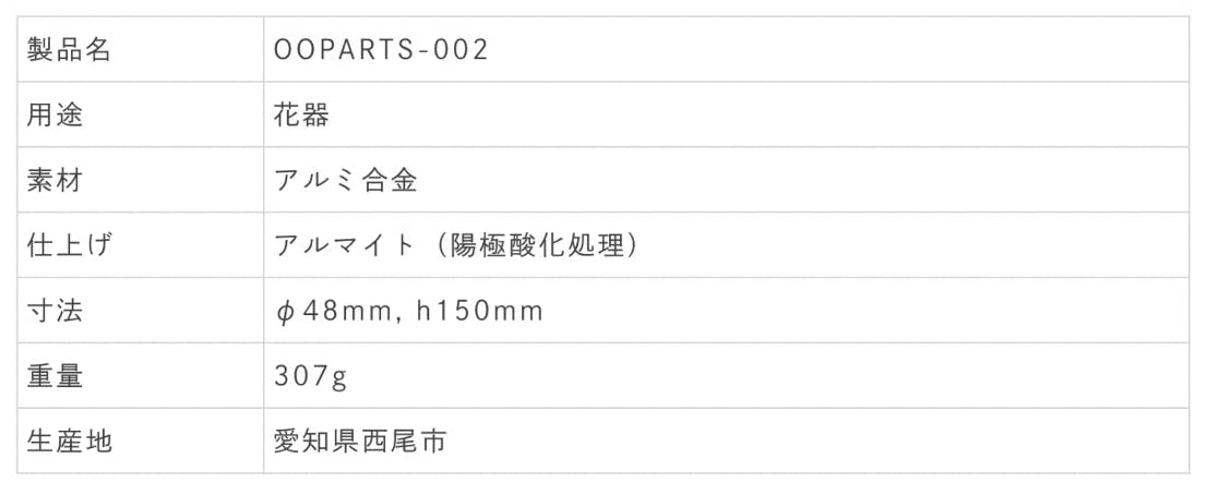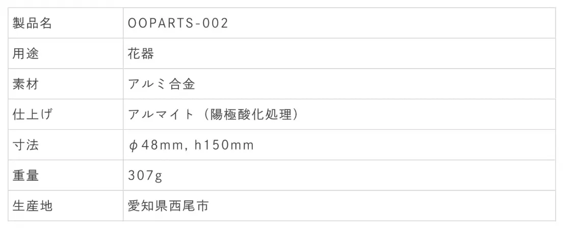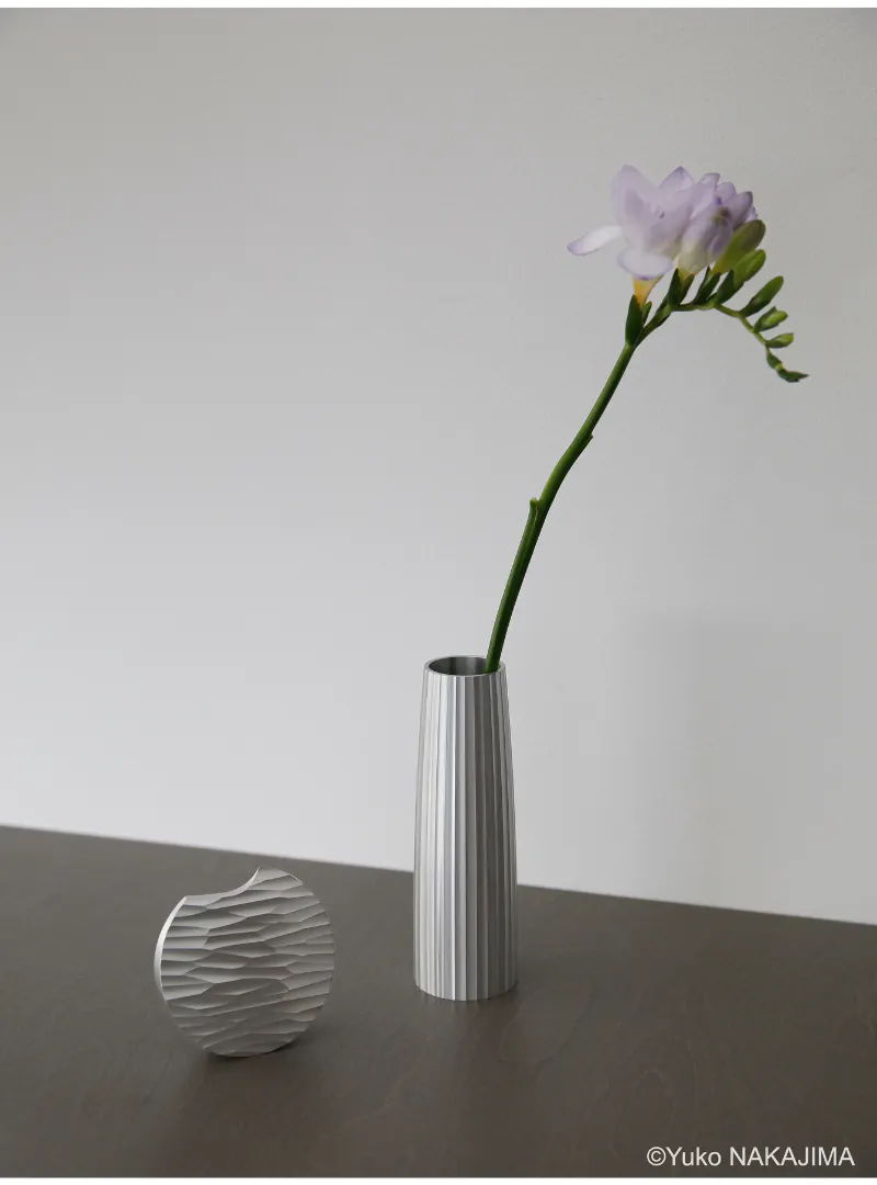 削られたアルミには、表⾯処理としてアルマイト処理が⾏われます。アルマイト処理を⾏うことにより、通常のアルミニウムより耐腐⾷性や耐摩耗性が⾼くなっており、⽔を⼊れての使⽤も問題はありません。⾦属製で重厚感があり、ガラスや陶器製の花器と⽐べて丈夫で割れる⼼配がないので、使う場所を選びません。