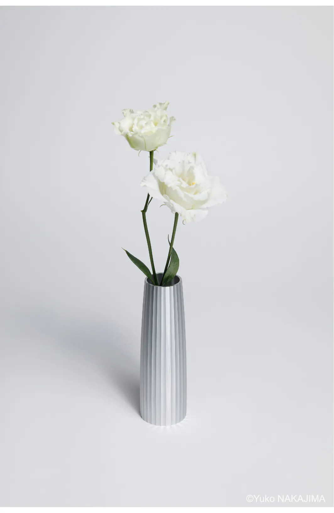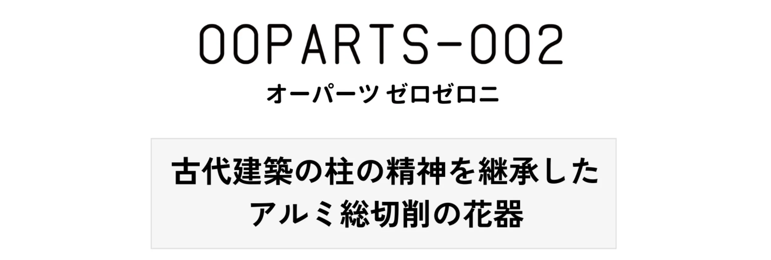 OOPARTS-002 はその精神を継承し、アルミを塊から削り出してフルーティングのような切削痕を残すことで、古代では柱頭に彫刻されていた植物の代わりに実際に飾られる花々の姿を際⽴たせる花器になります。
