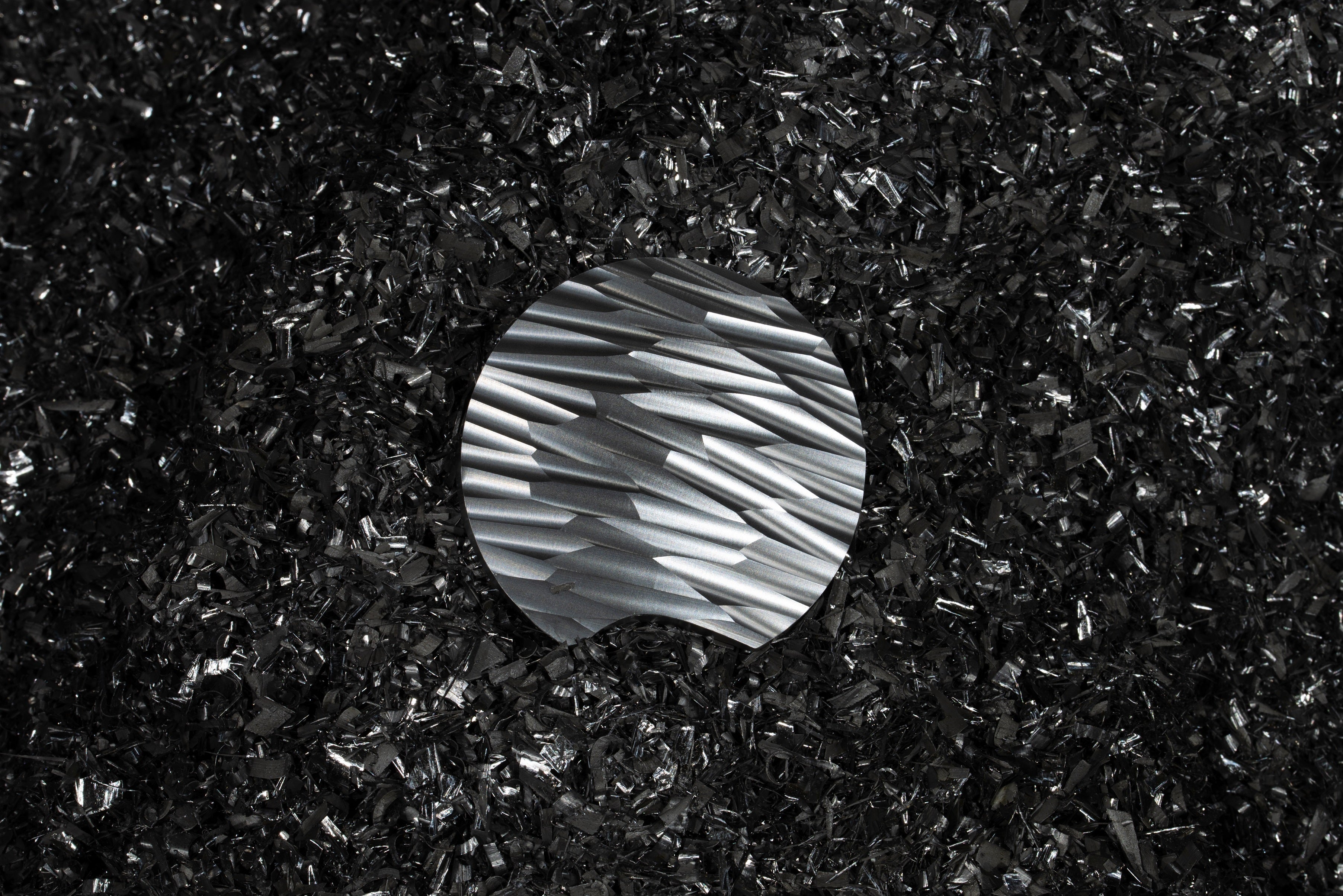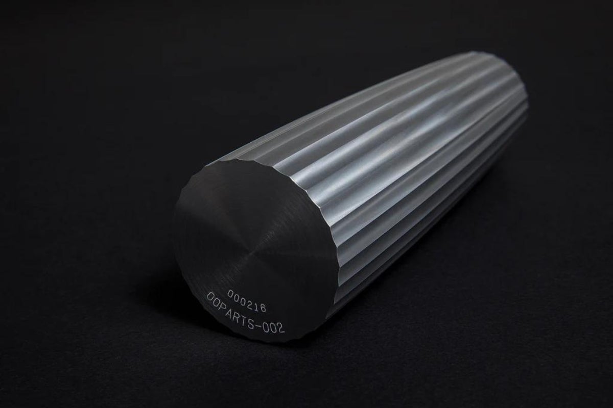 「OOPARTS-002」はアルミニウムの塊を削り出して作られています。⼯場では旋盤で形が整えられたアルミの塊が切削加⼯の機械にセットされ、プログラム通りに削られていきます。エンドミルの軌跡がそのまま表⾯の模様になっていきます。
