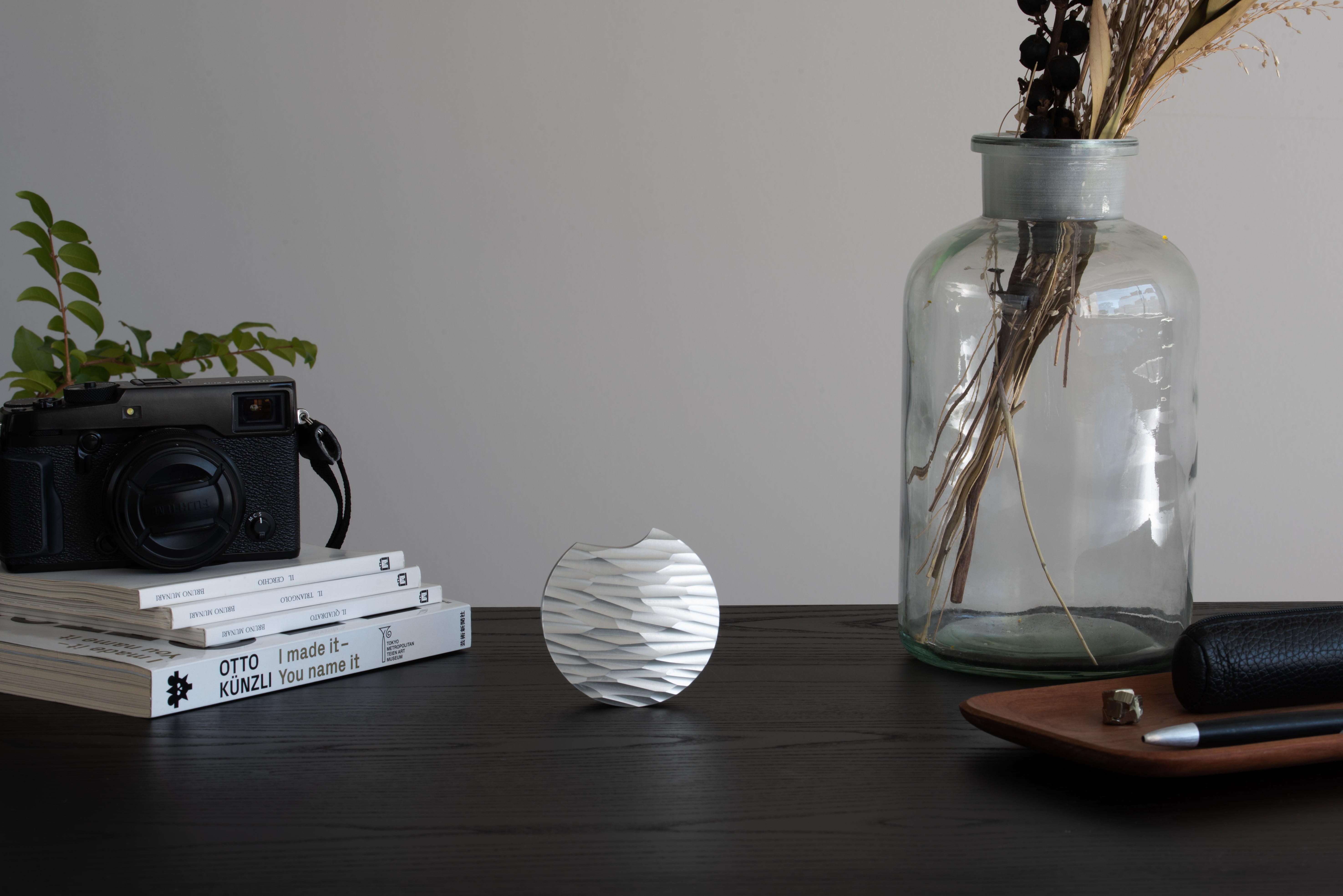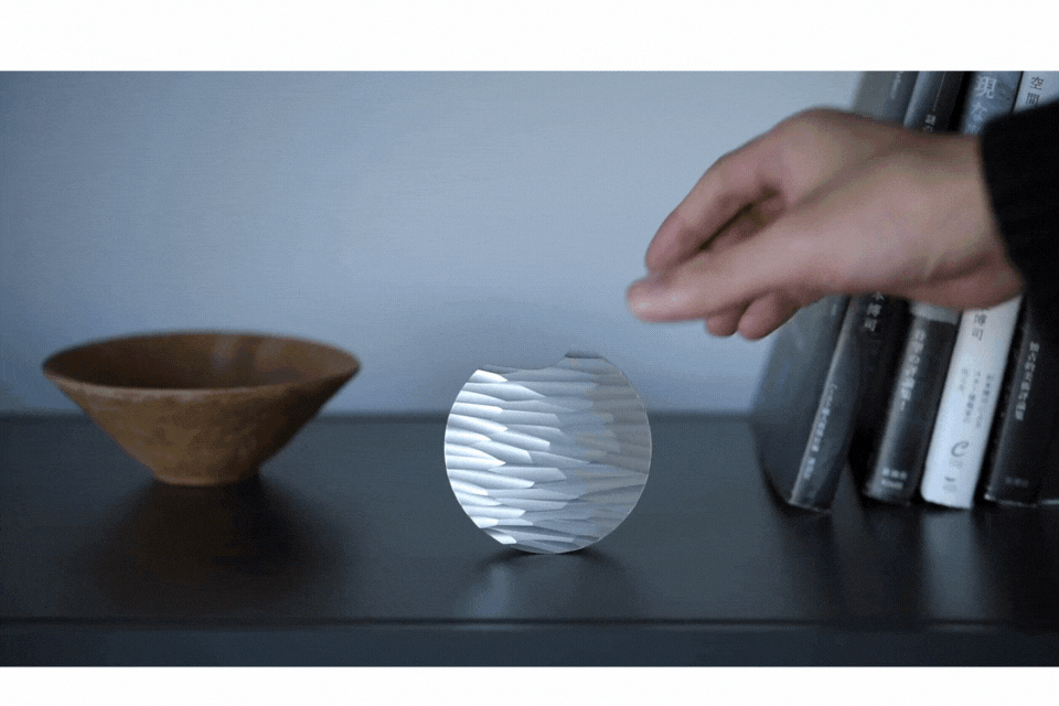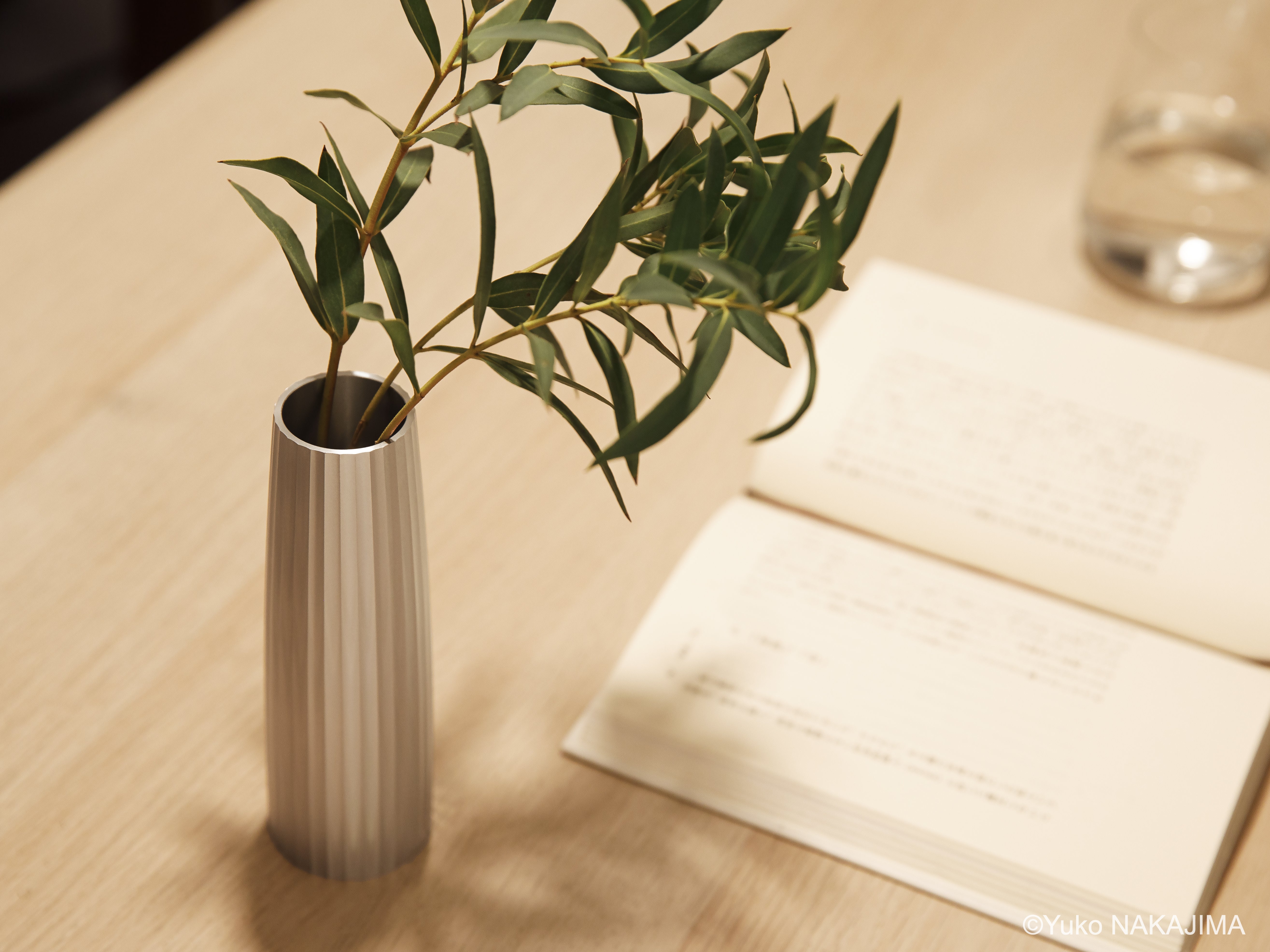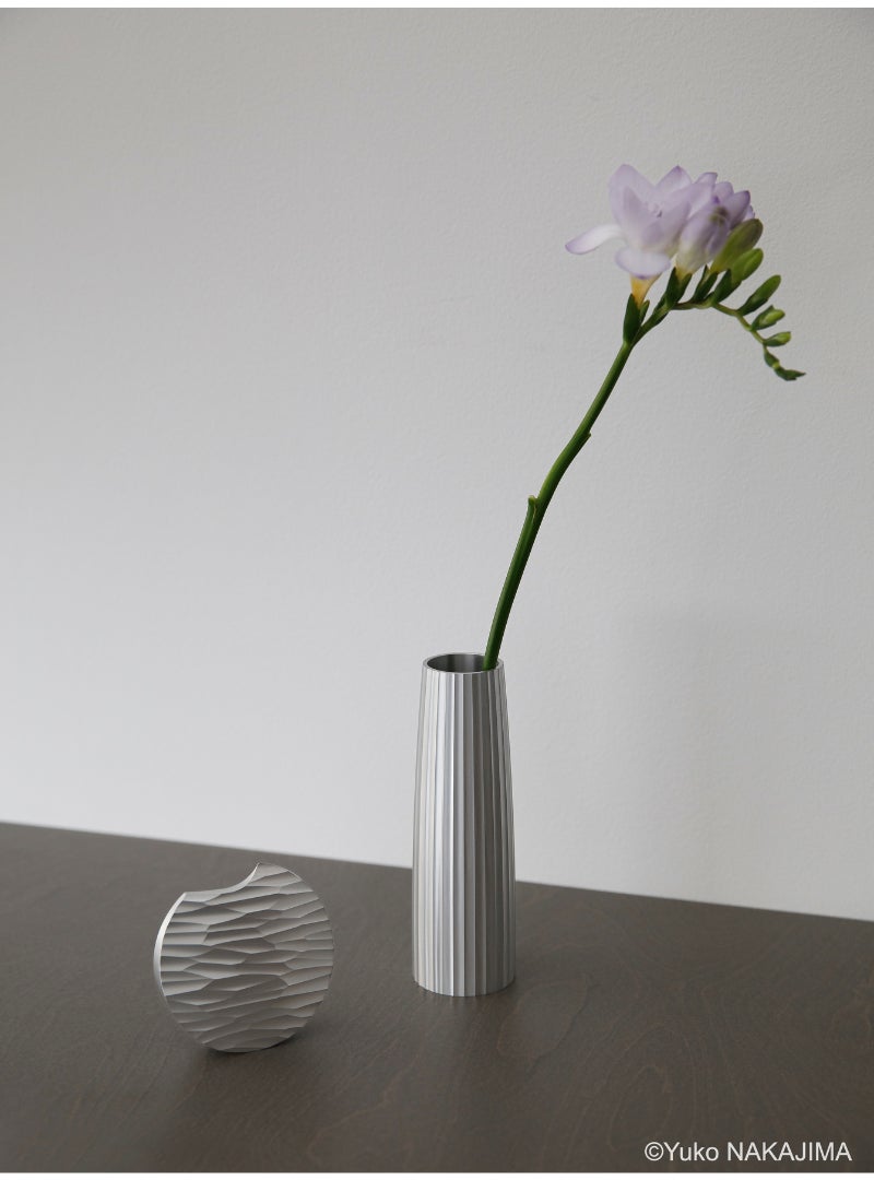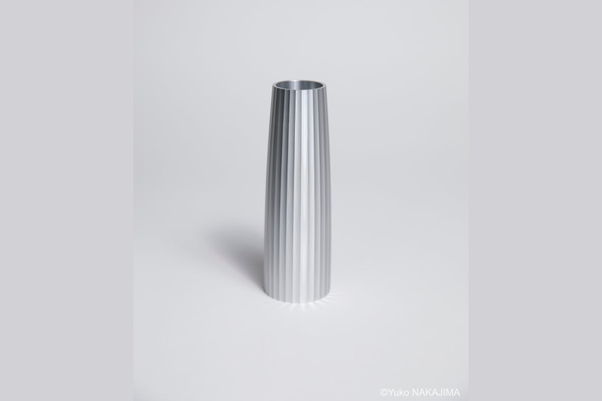 「OOPARTS-002」は、アルミを塊から削り出すことで光を受けて美しく繊細に輝き、活けた花や植物を美しく⾒せるオブジェのような花器です。