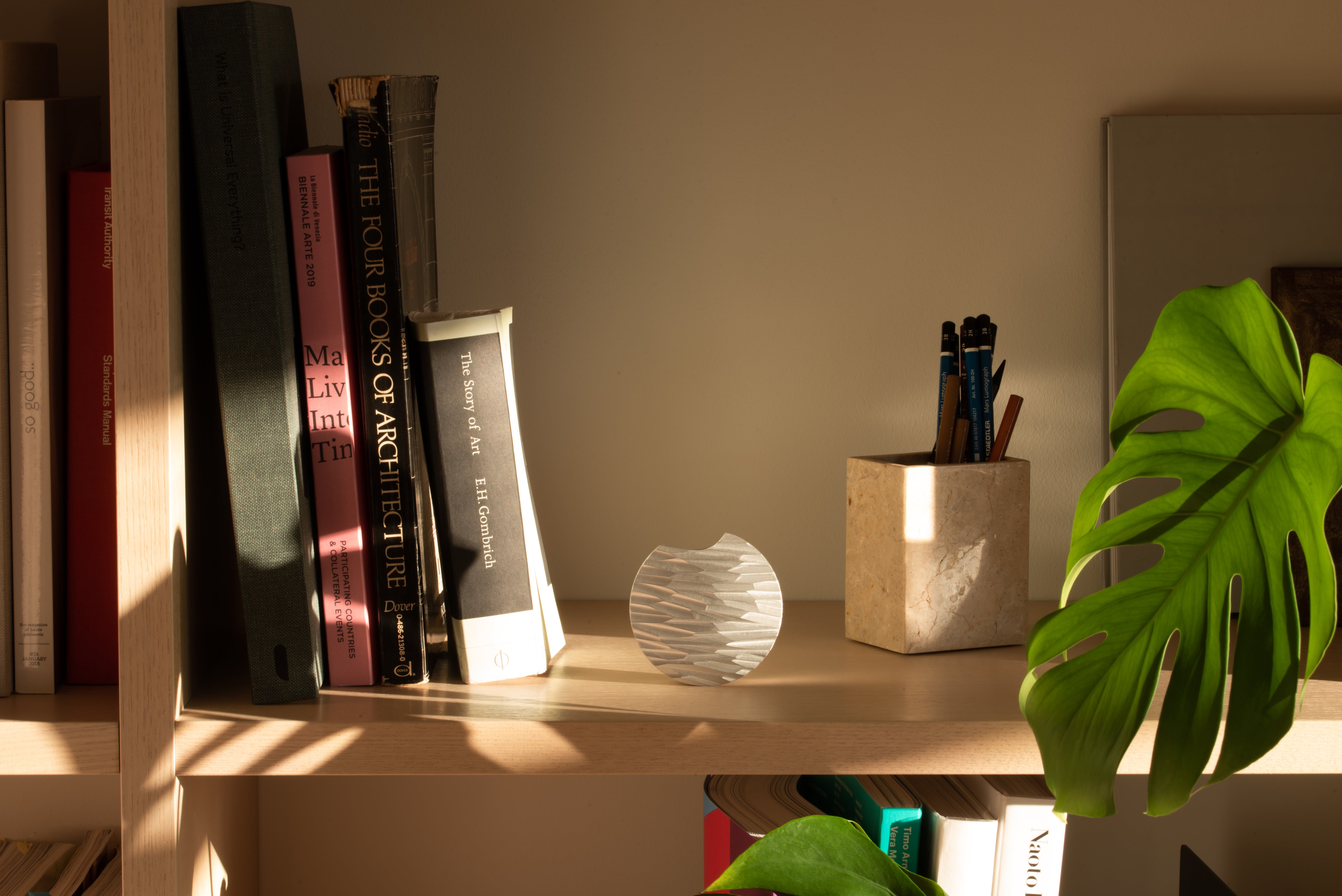 OOPARTS-002 はその精神を継承し、アルミを塊から削り出してフルーティングのような切削痕を残すことで、古代では柱頭に彫刻されていた植物の代わりに実際に飾られる花々の姿を際⽴たせる花器になります。