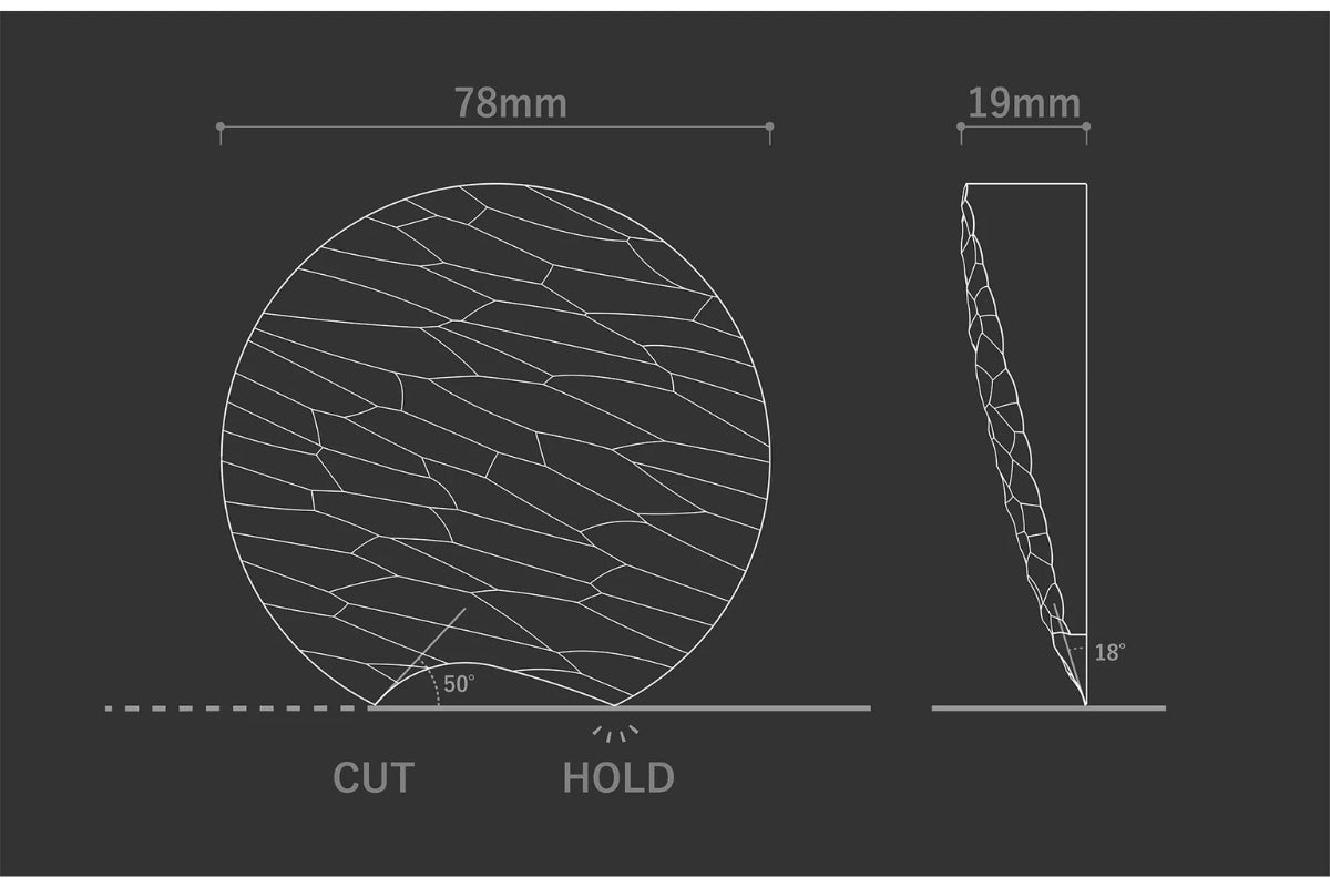 削られたアルミには、表面処理としてアルマイト処理が行われます。アルマイト処理を行うことにより、通常のアルミニウムより耐腐食性や耐摩耗性が高くなっています。50mの耐久試験を行った結果、切れ味に変化はなく、刃の摩耗は殆ど見られませんでした。