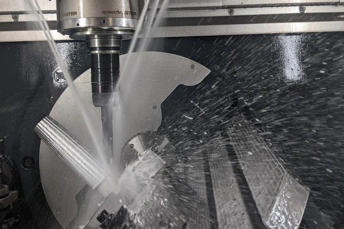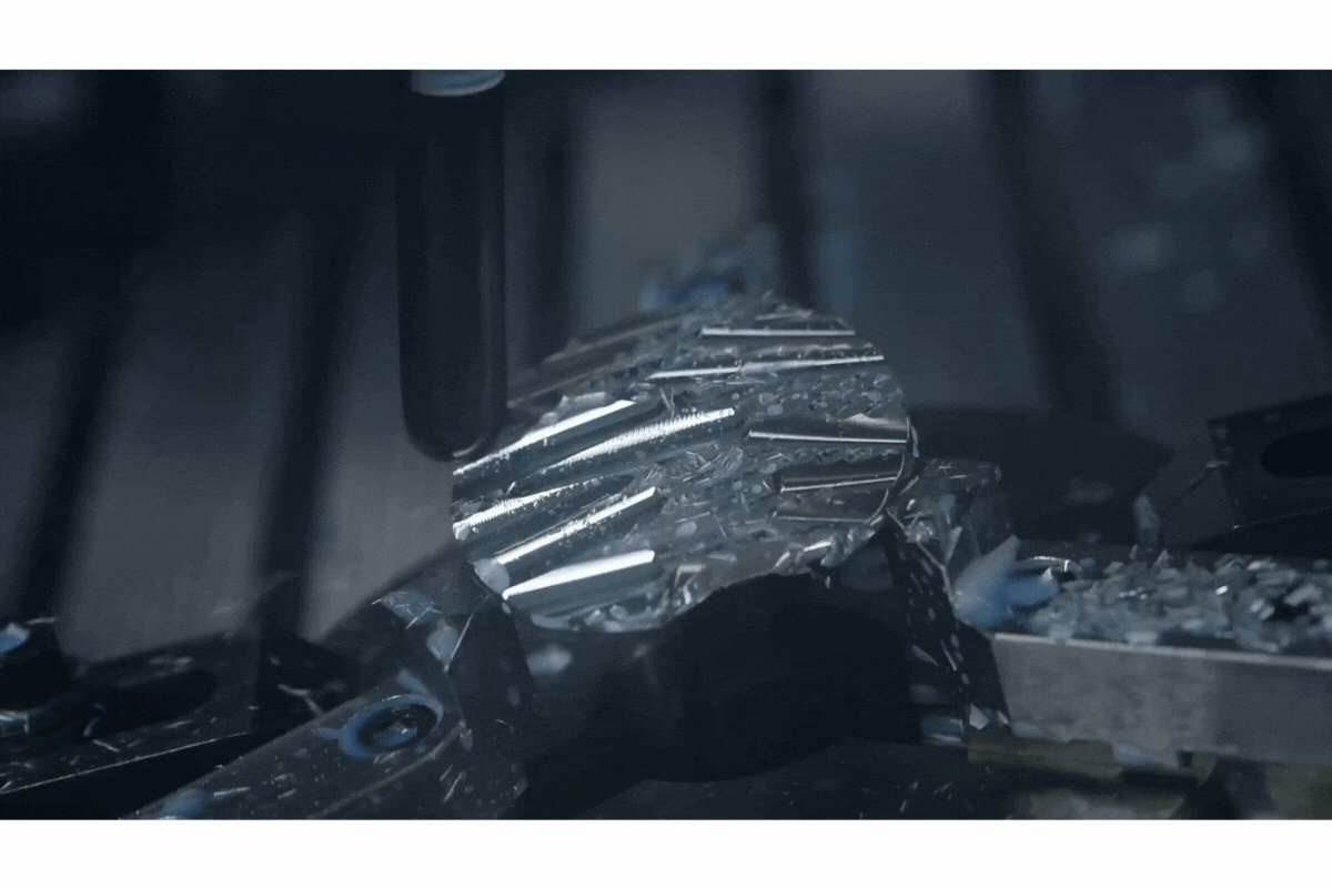「OOPARTS-001」はアルミニウムの塊を削り出して作られています。工場では、旋盤で形が整えられたアルミの塊が切削加工の機械にセットされ、プログラム通りに削られていきます。エンドミルの軌跡がそのまま表面の模様や刃先になっていきます。