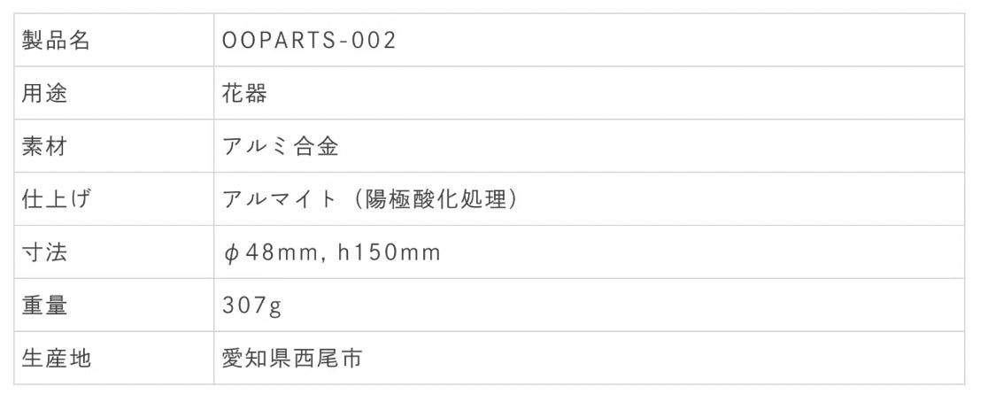 削られたアルミには、表⾯処理としてアルマイト処理が⾏われます。アルマイト処理を⾏うことにより、通常のアルミニウムより耐腐⾷性や耐摩耗性が⾼くなっており、⽔を⼊れての使⽤も問題はありません。⾦属製で重厚感があり、ガラスや陶器製の花器と⽐べて丈夫で割れる⼼配がないので、使う場所を選びません。