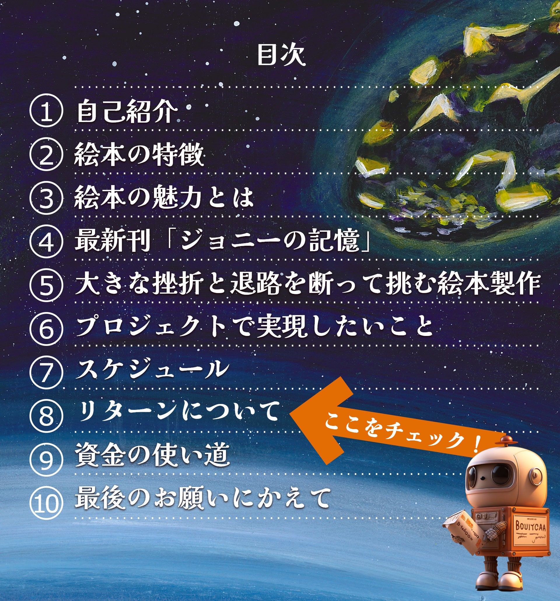 このクラウドファンディングのページで絵本の「あらすじ」を公開しています。是非、最後までお読みください。