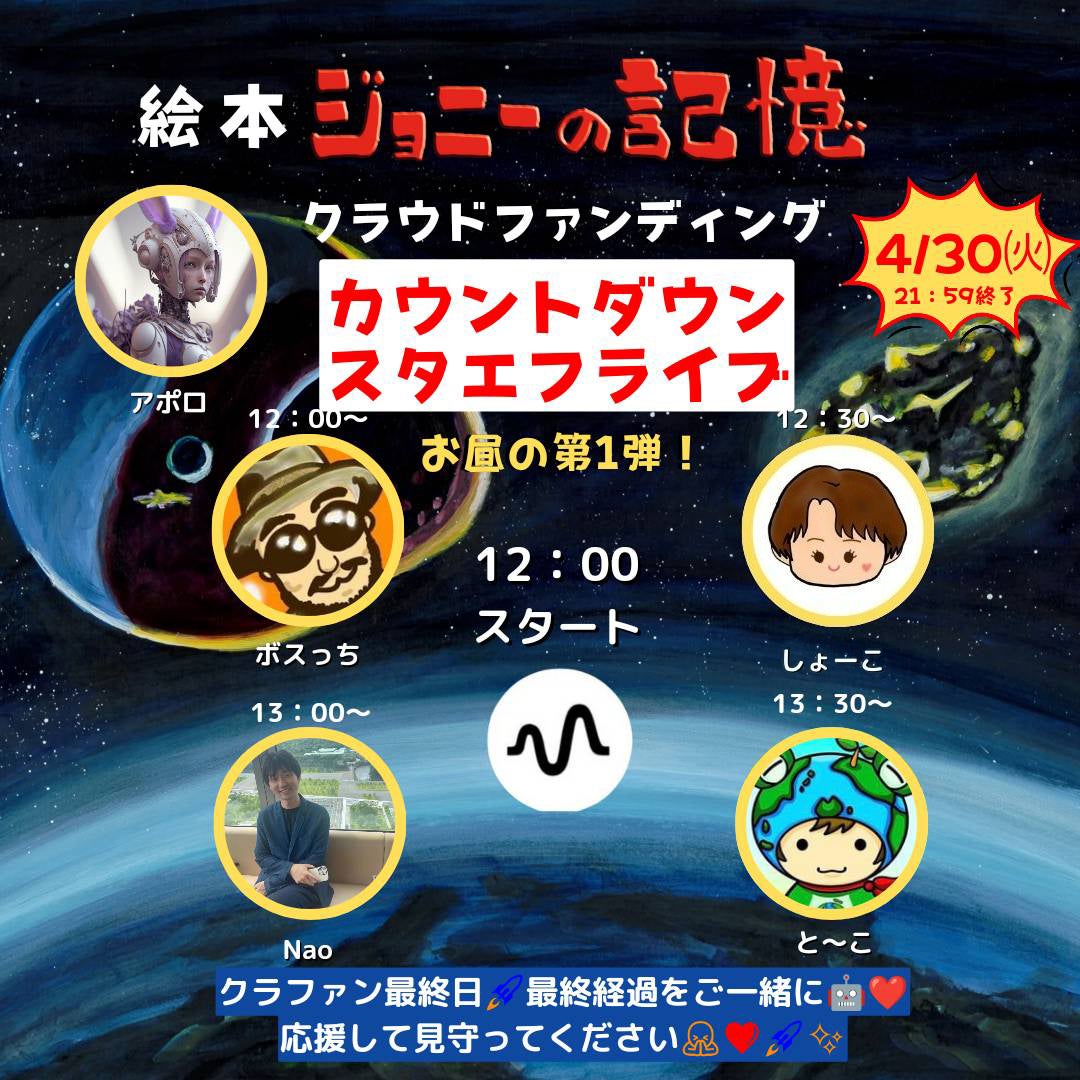 いよいよ本日がクラファン最終日です!このあと12:00からと21:00からの2回にわたて、カウントダウンライブを5時間行います!最後はネクストゴールの目標を達成して、みなさんでハイタッチしたいです。お耳だけでもご参加いただけると嬉しいです。よろしくお願いします!