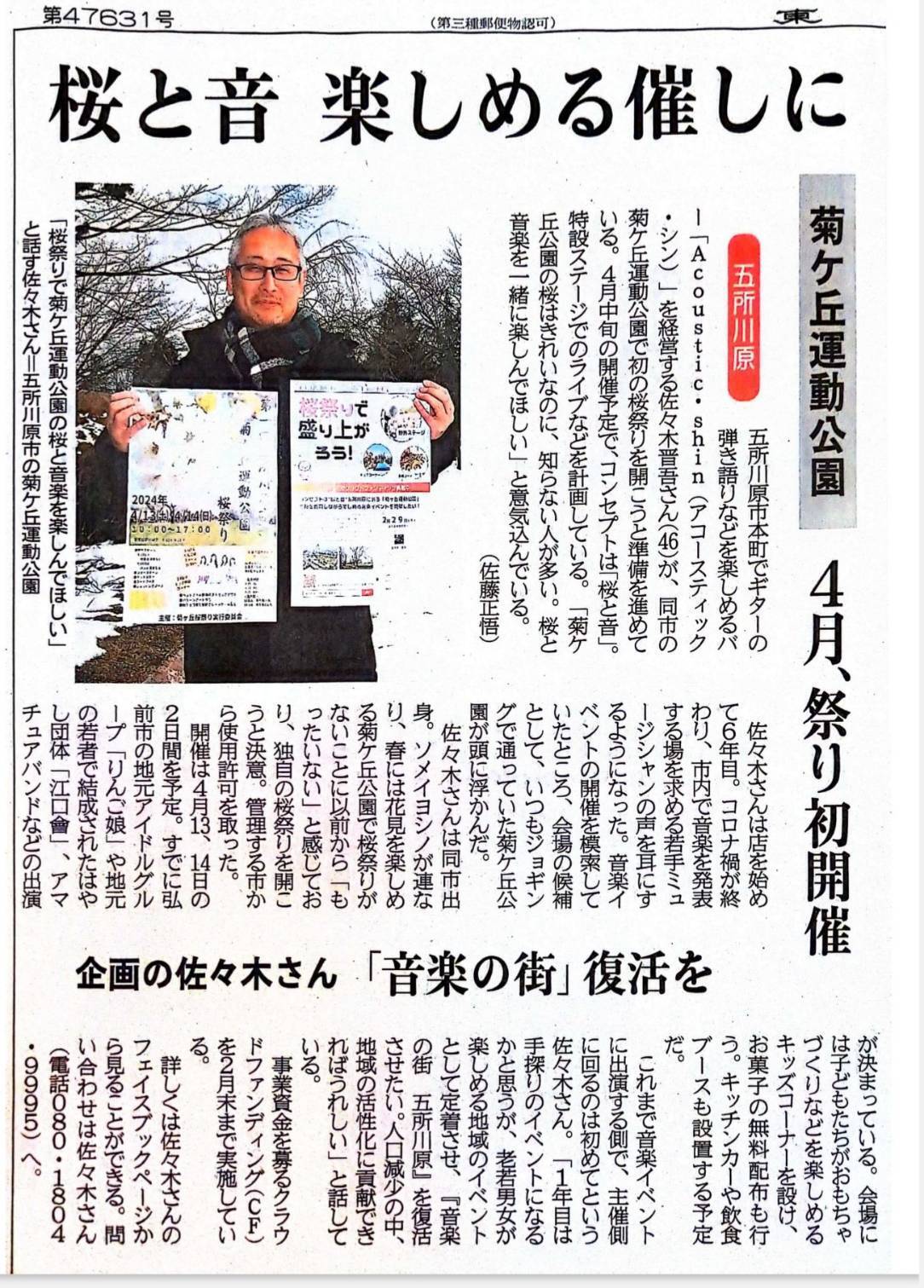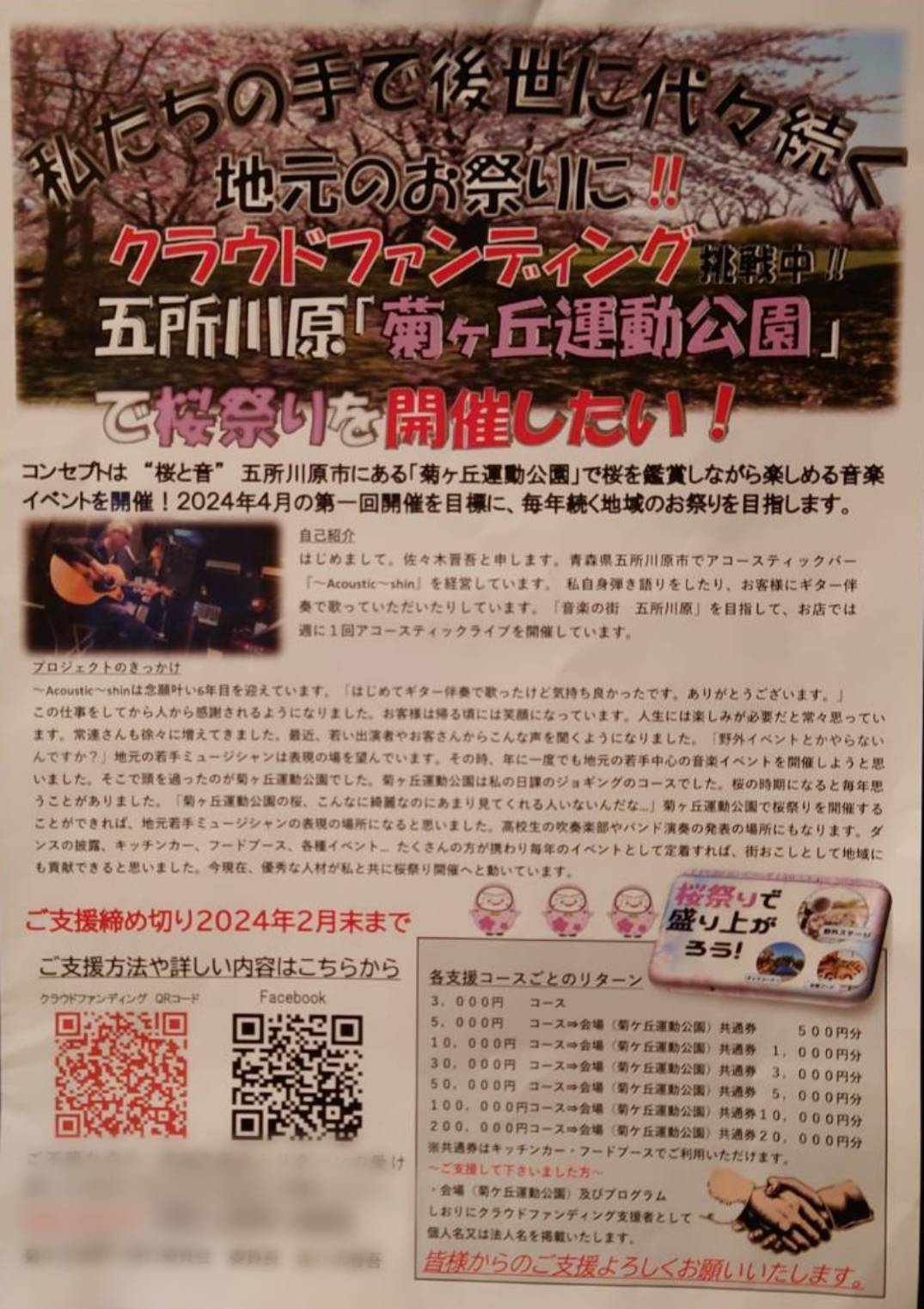 ご支援くださった皆様、こちらをご覧になってくださった皆様、誠にありがとうございます。2月2日㈮、地元の東奥日報新聞に、桜祭り開催に向けてクラウドファンディングに挑戦中の記事が掲載されました。お陰様で現在55%達成しております。音楽ステージへの出演者の募集、フードブースやキッチンカー、ショップブース出店者の募集や物品の選別、駐車場の確保など現在実行委員会で話し合いを進めています。より祭りらしくする為にはまだまだご支援が必要になります。五所川原での毎年のイベントとなるように努力してまいります。引き続きご協力の程、よろしくお願いいたします。