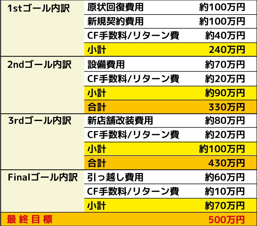 現店舗の原状回復の経費がかなり掛かってしまう事もあり、原状回復費用・新店舗契約費用・移転費用を工面したいと考えております。