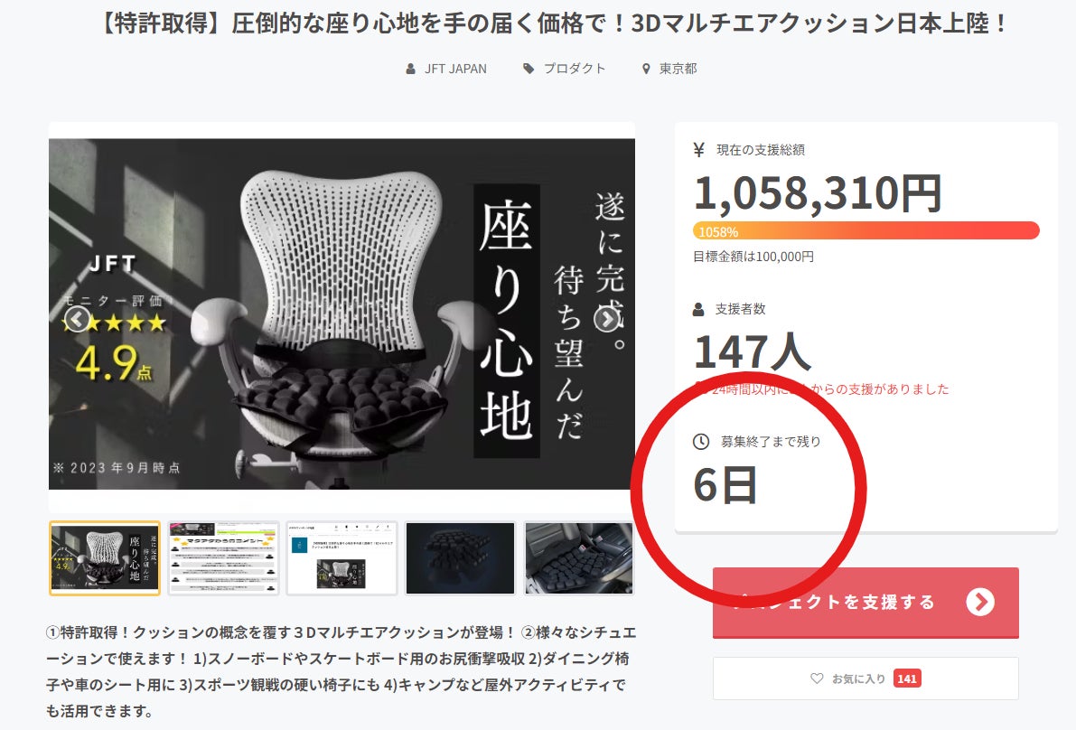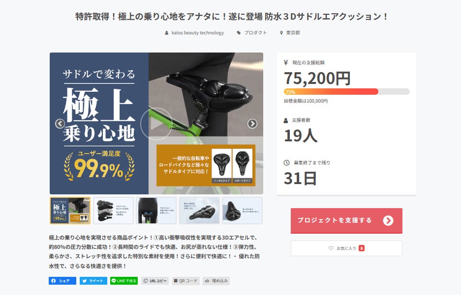 皆様お世話になっております。現在、兄弟会社であるカロスビューティで並行して防水3Dサドルエアクッションもキャンプファイヤーでご提案させて頂いています。https://camp-fire.jp/projects/view/720709?utm_campaign=cp_po_share_c_msg_projects_show今までにはなかった防水性、快適性を備えた自転車用のサドルエアクッションを展開して、ロードバイク、買い物、通勤、通学、子どもの送り迎えと日々生活に欠かせない自転車ですが、自転車に乗っていてお尻が疲れる、痛くなる、蒸れるなど色々しんどかったことがあったと思います。そんなお悩みをまるっと解決できる商品となっております。この機会に是非お買い求めください!!