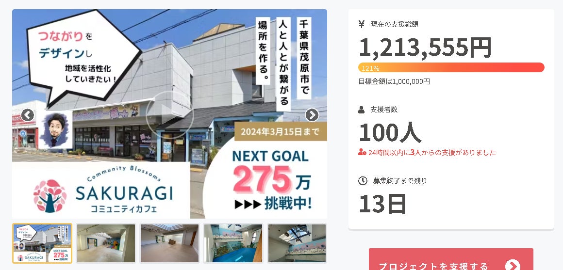 ページをご覧の皆さま、ご支援、ご協力をしてくださっている皆さま。僕たちの活動に心を寄せていただき、ありがとうございます。昨日、ご支援いただいた人数が100名となりました!!ご支援いただいた、お一人おひとりに感謝の気持ちでいっぱいです。また、ご寄付だけでなく、多くの皆さまから応援コメントをいただき、メンバーとも大変に励まされております。直接ご支援をいただいたり、お会いした時に声をかけていただいたり本当にうれしく思います。より多くの方々に僕たちの活動を知ってもらい、一緒にこれからのSAKURAGIをつくっていくことができればと考えています。SNS等での情報シェアを含め、まだまだみなさまにお力を貸していただくことが多いかと思います。どうぞ、引き続きのご支援、応援のほど、どうぞよろしくお願い致します。活動の状況はInstagramでも是非ご確認いただけたら嬉しいです!community_cafe_sakuragi