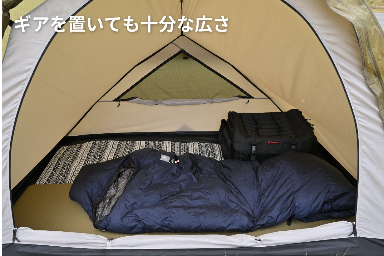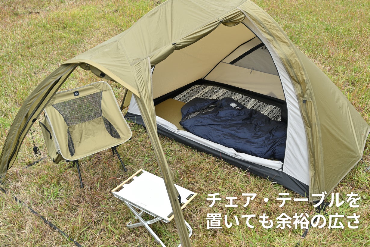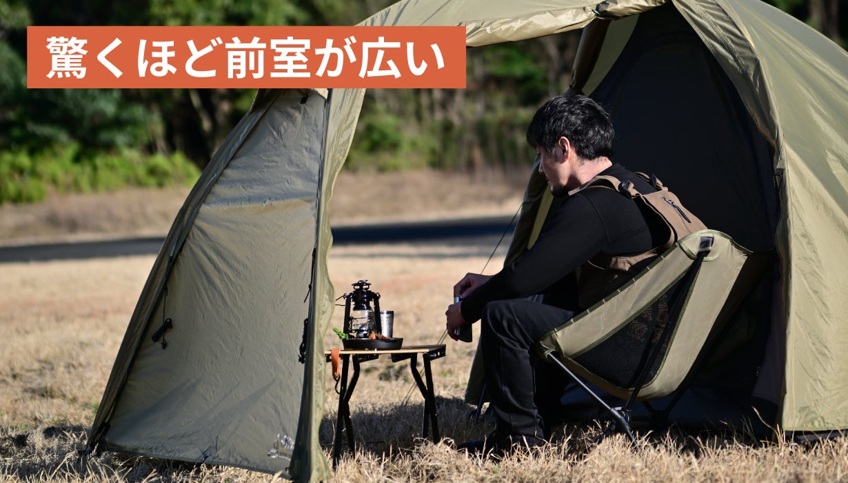 ◎朝食時や雨の日にも前室でゆったり過ごせる。コンパクト系ソロ用でも妥協しない居住性!