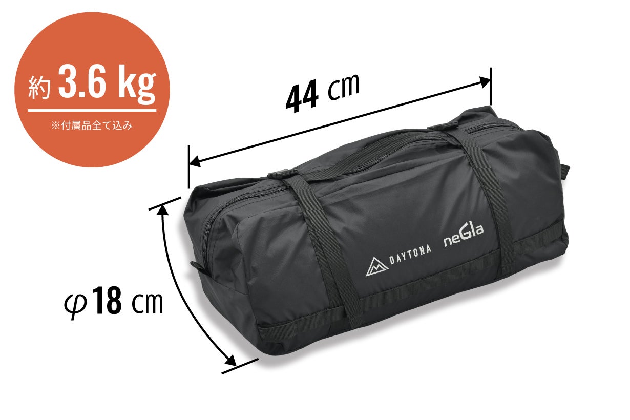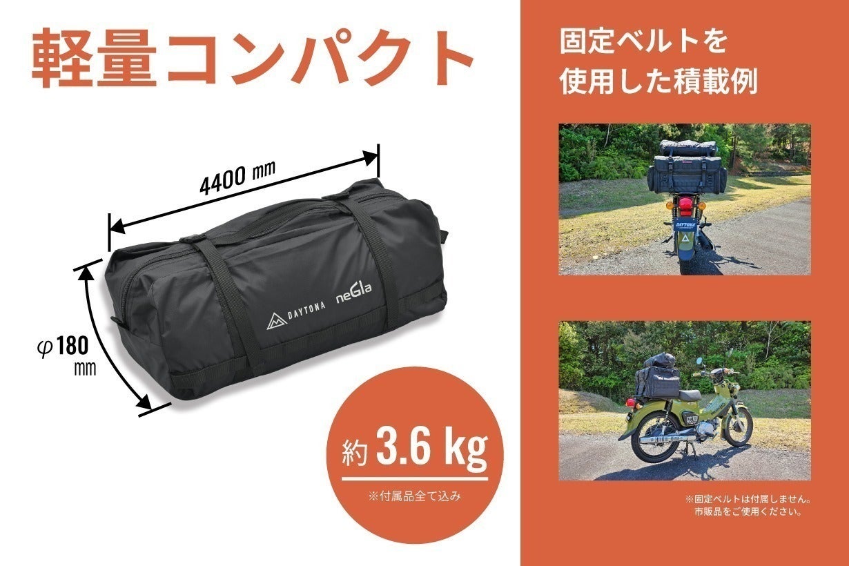 収納寸法44×φ18㎝、重量3.6㎏と軽量コンパクト。スーツケースやシートバック、トップケースなどに楽々収まります。