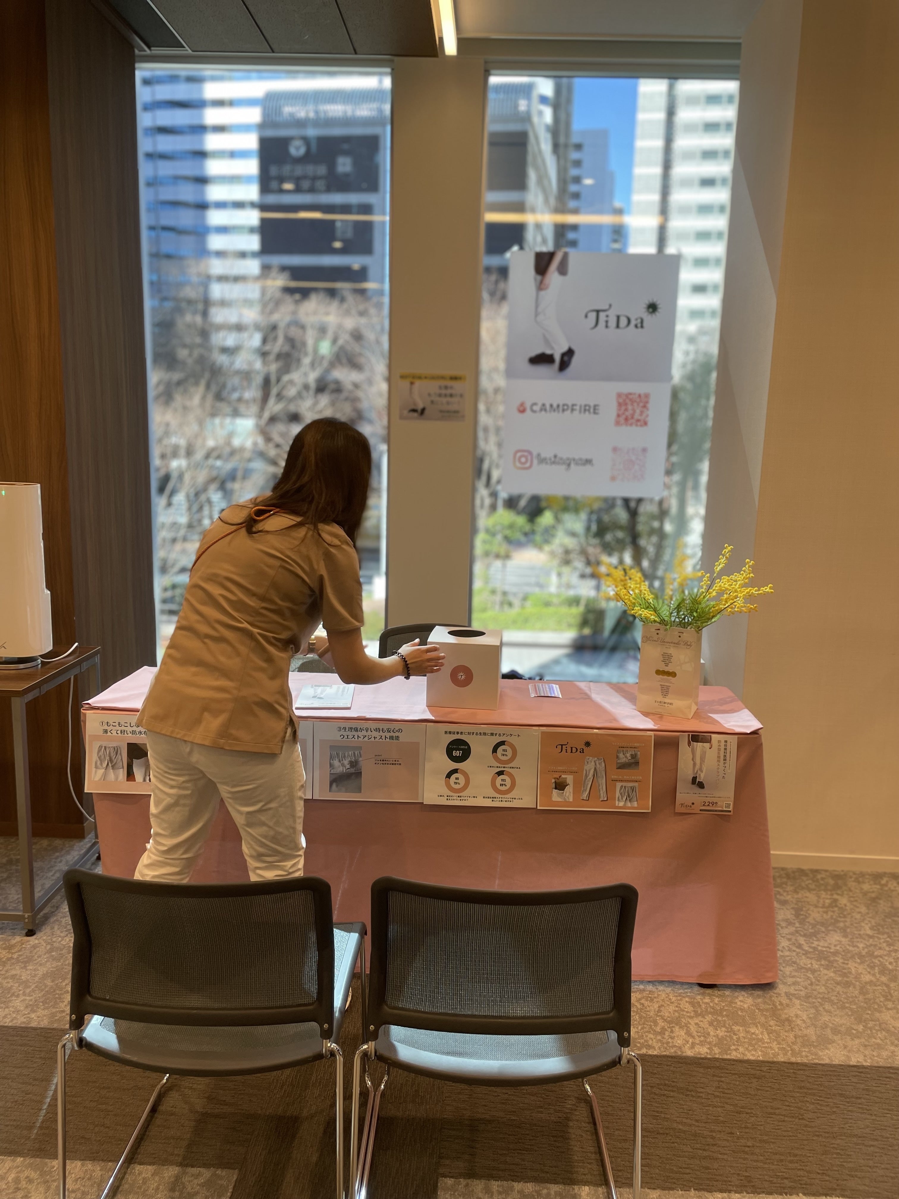 (ブース準備中の石井。TiDa防水型生理用スクラブパンツ着用。)
