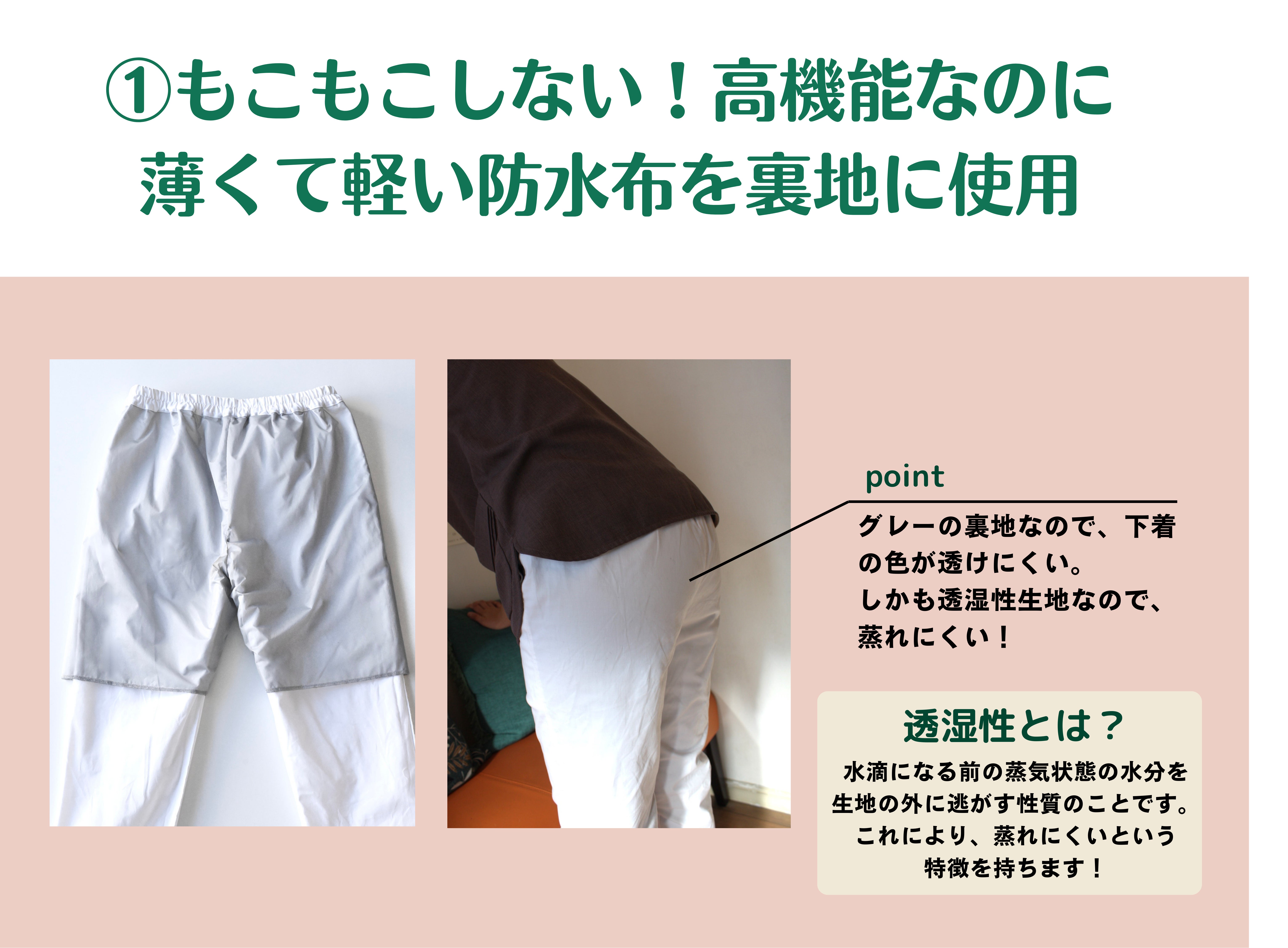 ナプキンや吸水ショーツから漏れ出した経血が表に出にくい防水布を裏地に使用しました。膝付近まで防水布を使用しているため広範囲のモレでも安心してご使用いただけます。薄手で軽くサラっとした着心地です。布ナプキンにも使用される生地であり、透湿性もあるため蒸れにくくなっています。また、アンケートの自由回答欄の意見で多かった、"スクラブパンツの生地が薄いため下着の色が透けたり、パンツラインが見えてしまうのが気になるという悩みに対し、防水布の色をグレーカラーにすることで、下着の色などが透けにくい色合いとなっています。
